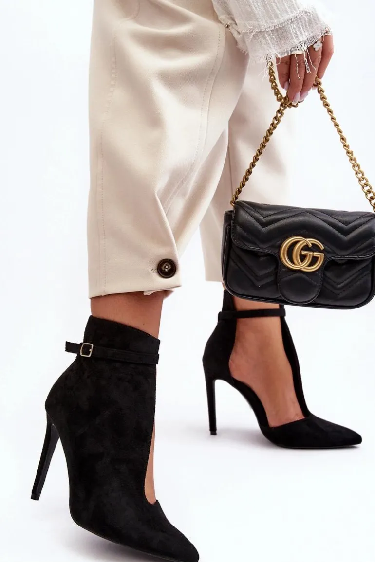 Stylowe botki damskie wykonane z eko zamszu to elegancka propozycja dla kobiet ceniących modny, kobiecy wygląd. Model osadzony na smukłej szpilce pięknie podkreśla sylwetkę i dodaje lekkości każdej stylizacji. Szpiczaste noski optycznie wysmuklają nogi, a subtelne wycięcie na cholewce nadaje całości nowoczesnego charakteru. Górną część zdobi cienki pasek z klamrą, który stanowi delikatny, stylowy akcent. Miękka wkładka z eko skóry gwarantuje wygodę nawet podczas dłuższego noszenia. To wyjątkowe botki, które doskonale sprawdzą się zarówno do eleganckich, jak i wieczorowych stylizacji. Przy wyborze rozmiaru prosimy sugerować się tabelą rozmiarów.