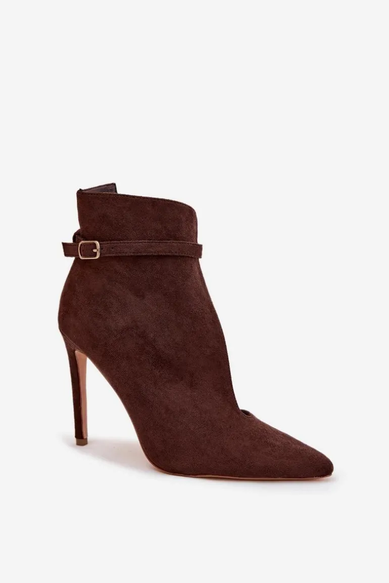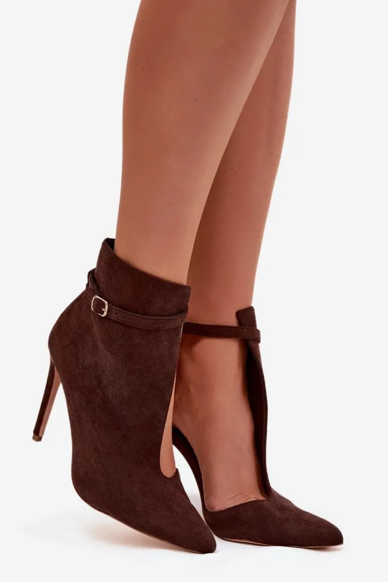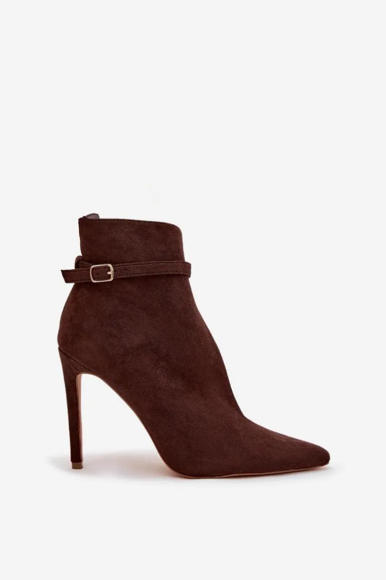 Stylowe botki damskie wykonane z eko zamszu to elegancka propozycja dla kobiet ceniących modny, kobiecy wygląd. Model osadzony na smukłej szpilce pięknie podkreśla sylwetkę i dodaje lekkości każdej stylizacji. Szpiczaste noski optycznie wysmuklają nogi, a subtelne wycięcie na cholewce nadaje całości nowoczesnego charakteru. Górną część zdobi cienki pasek z klamrą, który stanowi delikatny, stylowy akcent. Miękka wkładka z eko skóry gwarantuje wygodę nawet podczas dłuższego noszenia. To wyjątkowe botki, które doskonale sprawdzą się zarówno do eleganckich, jak i wieczorowych stylizacji. Przy wyborze rozmiaru prosimy sugerować się tabelą rozmiarów.