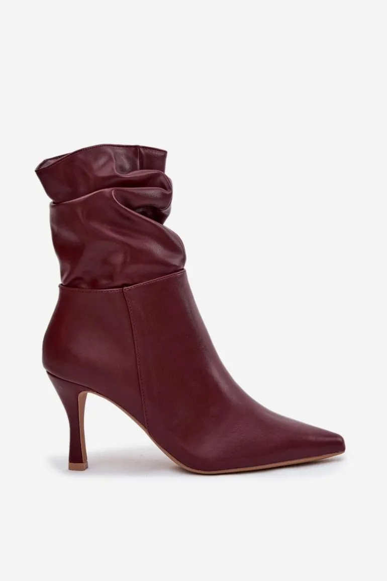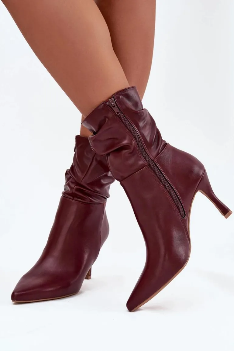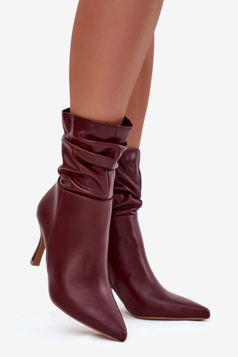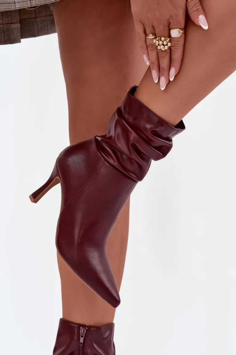Eleganckie botki damskie z marszczoną cholewką to propozycja pełna kobiecego charakteru. Model ze szpiczastymi noskami i smukłą szpilką podkreśla nogi i dodaje stylu każdej stylizacji. Zamek z boku ułatwia szybkie zakładanie i idealne dopasowanie do stopy, czyniąc botki świetnym wyborem na wieczorne wyjścia i eleganckie okazje. Przy wyborze rozmiaru prosimy sugerować się tabelą rozmiarów.