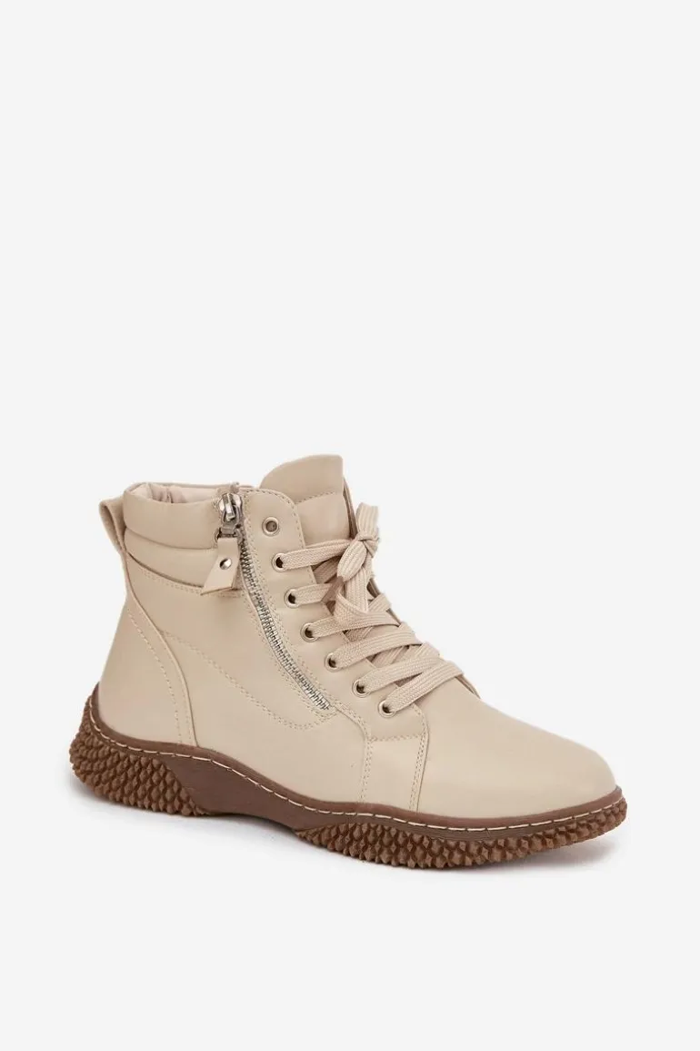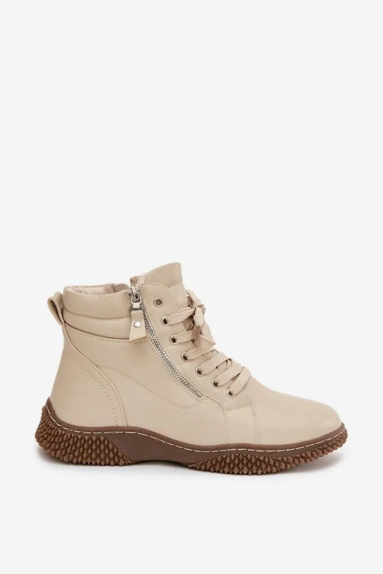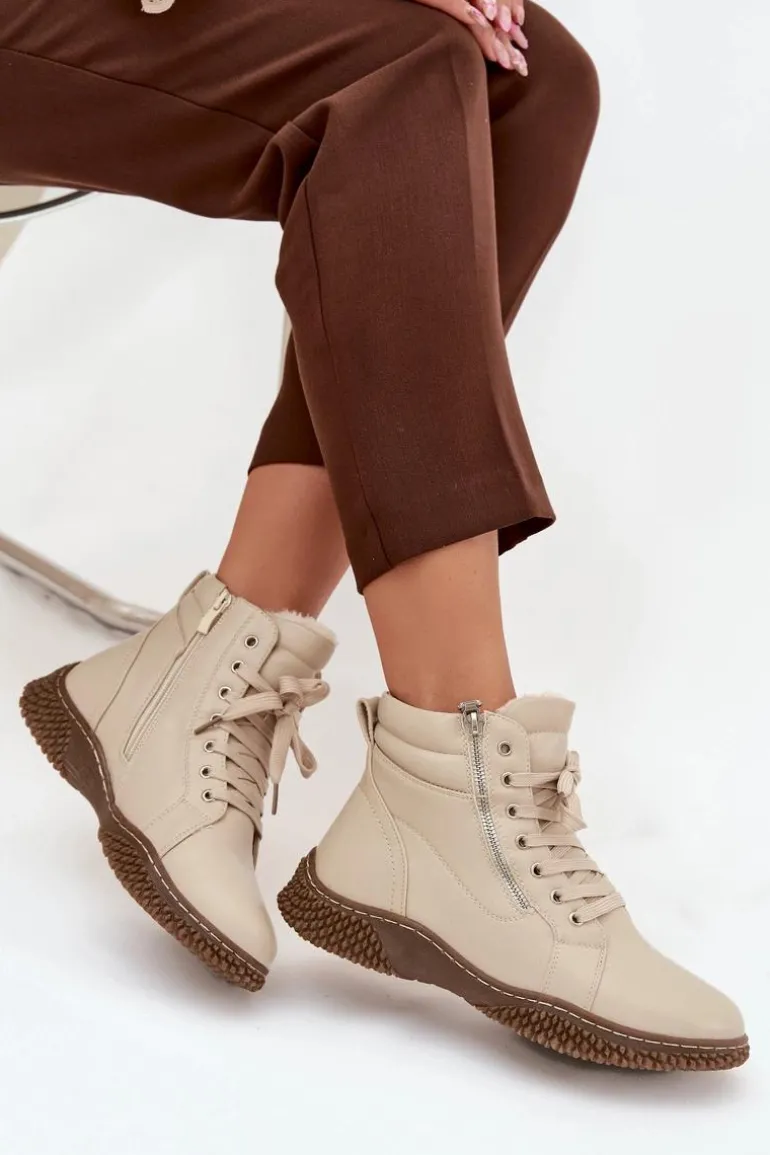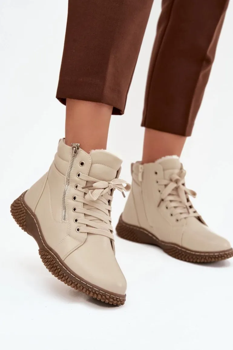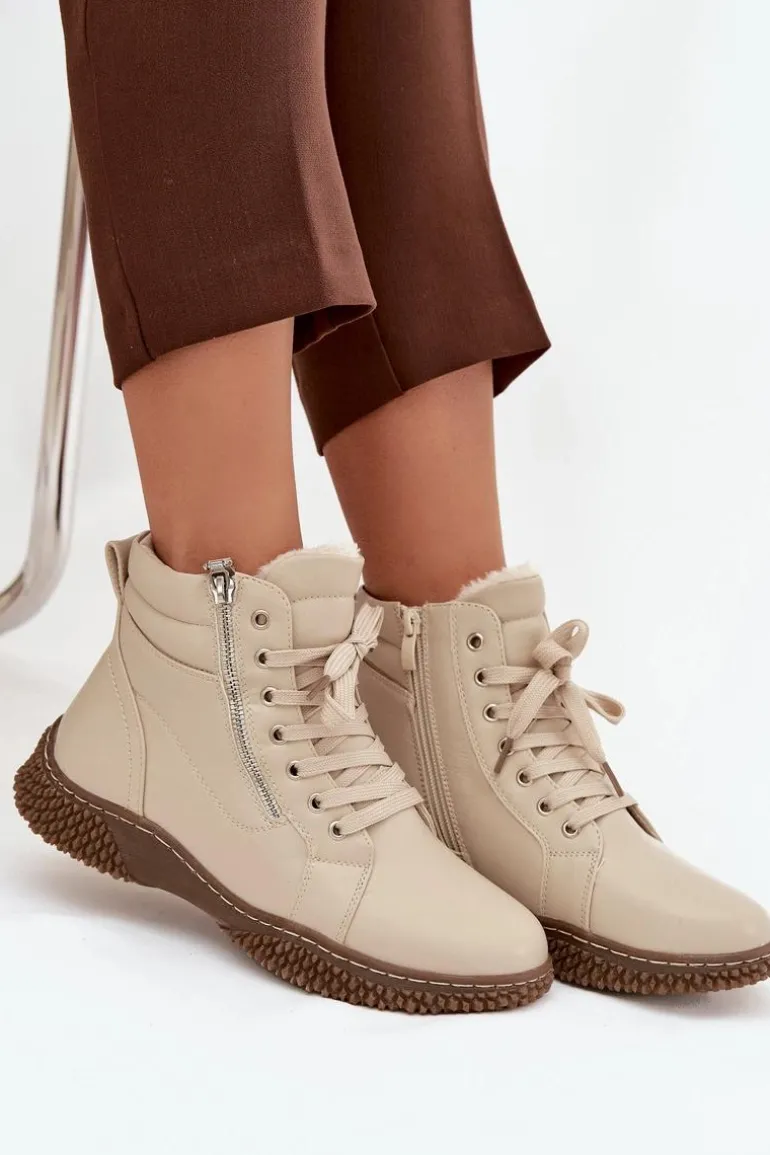 Botki damskie z eko skóry to stylowe i wygodne obuwie na chłodniejsze dni. Wnętrze ocieplone miękkim futerkiem zapewnia ciepło i komfort noszenia. Model łączy sznurowanie z podwójnym zamkiem, z czego jeden pełni funkcję ozdobną, dodając modnego charakteru. Doskonałe na codzienne wyjścia. Przy wyborze rozmiaru prosimy sugerować się tabelą rozmiarów.