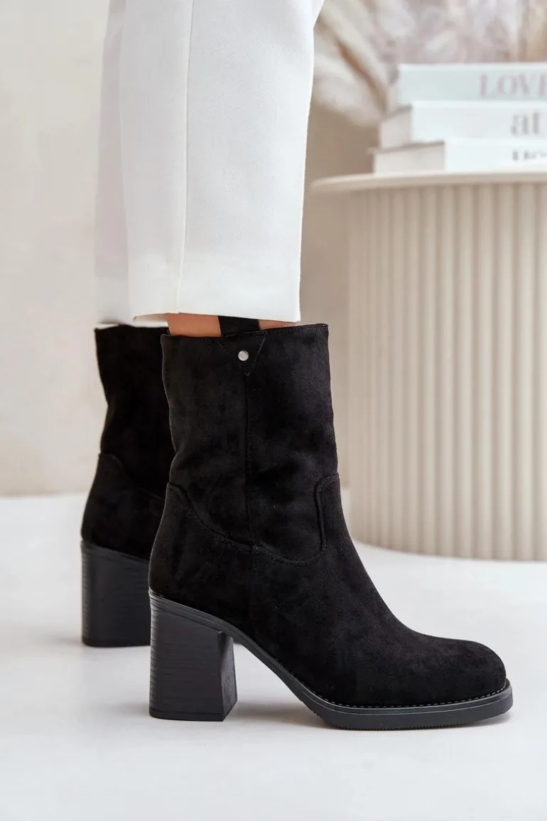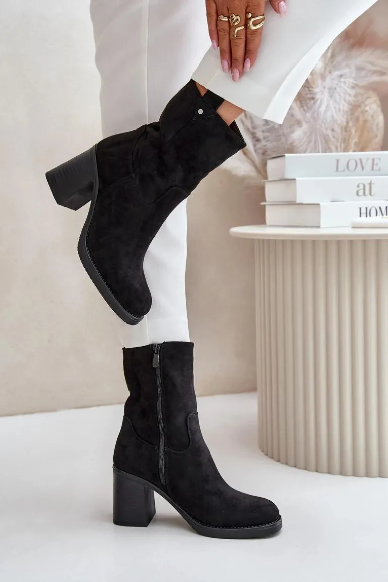 Botki damskie z eko zamszu. Ocieplane kocem obuwniczym. Noski zaokrąglone. Obcas w postaci słupka. Zapinane na zamek. Klasyczny fason, który dopełni wiele jesienno-zimowych stylizacji! Przy wyborze rozmiaru prosimy sugerować się tabelą rozmiarów.