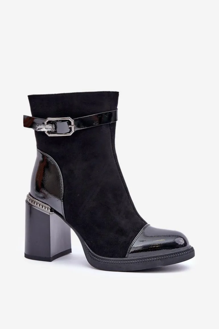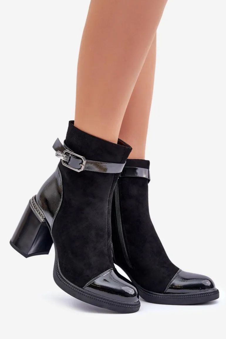 Eleganckie botki wykonane z eko skóry. Model ten wyróżnia ozdobny element przy obcasie oraz klamra, która nadaje elegancji. Wnętrze ocieplane dla dodatkowego komfortu w chłodniejsze dni. Model zapinany na zamek, z noskami w migdał. Idealne do wielu stylizacji! Przy wyborze rozmiaru prosimy sugerować się tabelą rozmiarów.