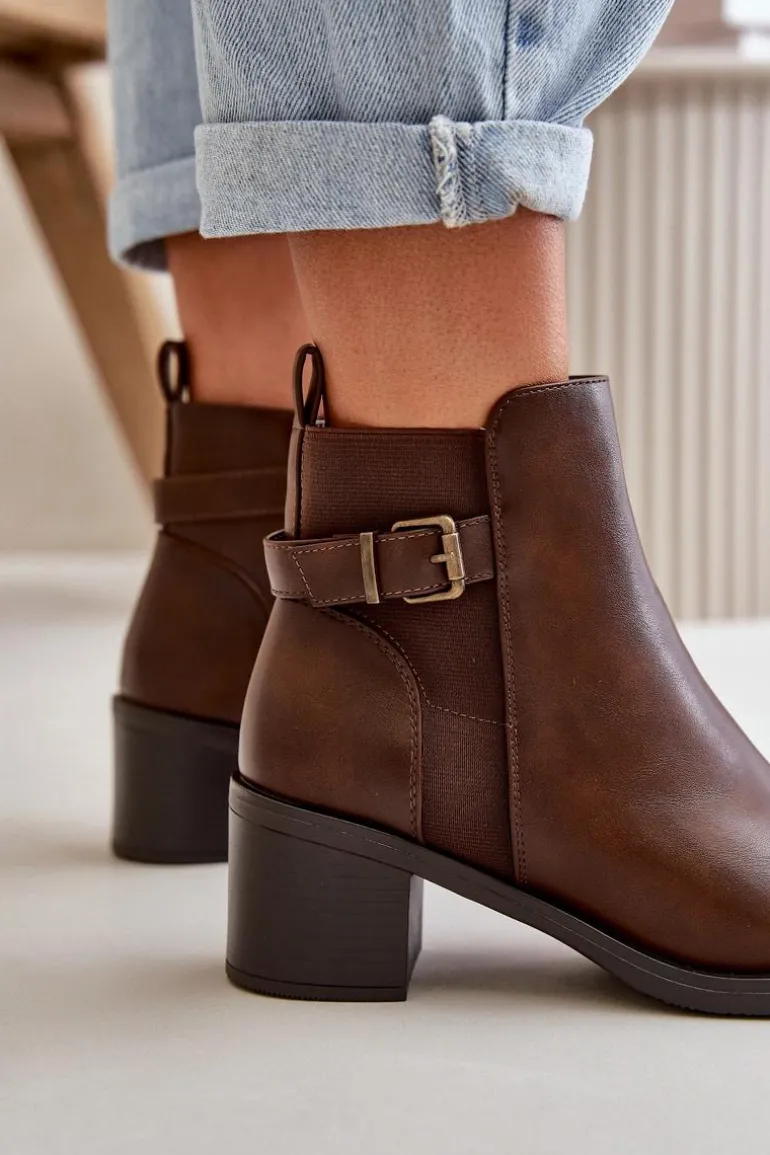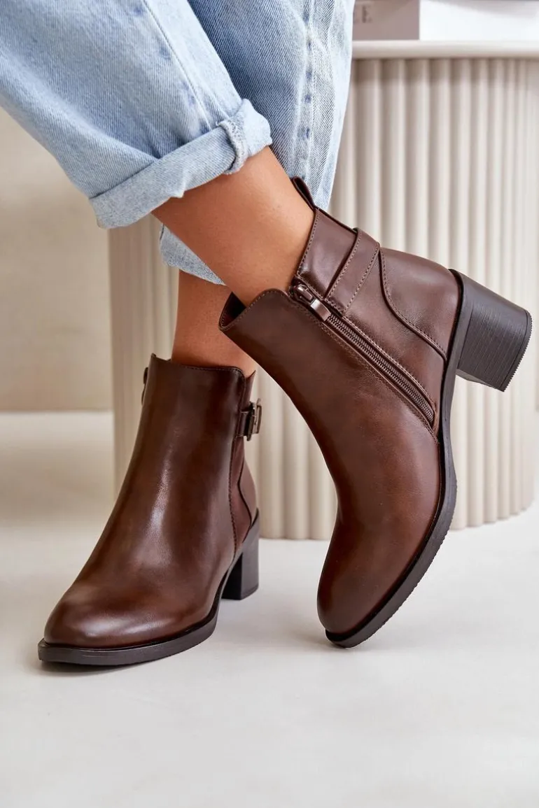 Botki damskie wykonane z eko skóry. Wnętrze ocieplone jest kocem obuwniczym, co zapewnia dodatkowe ciepło i komfort podczas chłodniejszych dni. Model zapinany na zamek, co ułatwia zakładanie i zdejmowanie, a także zapewnia doskonałe dopasowanie do stopy. Ozdobione detalem w postaci paseczka z klamrą. Idealne na jesienne i zimowe dni! Przy wyborze rozmiaru prosimy sugerować się tabelą rozmiarów.