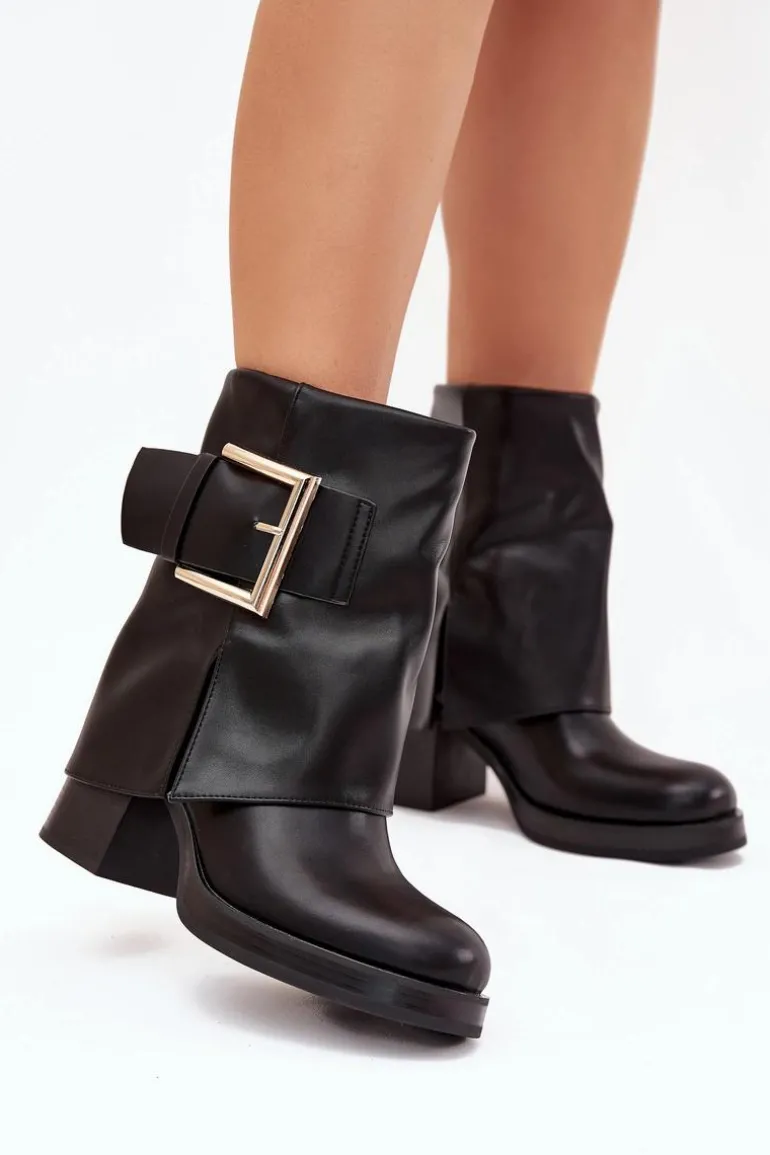 Botki damskie z eko skóry, osadzone na obcasie słupku, to stylowa propozycja na chłodniejsze dni. Model wsuwany, z ociepleniem kocem obuwniczym, zapewnia komfort i ciepło. Wyróżniają się elegancką złotą klamrą, która dodaje im wyjątkowego charakteru, a zaokrąglone noski gwarantują wygodę przez cały dzień. Doskonałe do codziennych stylizacji, idealnie komponują się z sukienkami, spódnicami czy spodniami. Przy wyborze rozmiaru prosimy sugerować się tabelą rozmiarów.