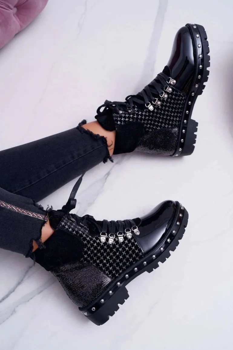 Wspaniałe botki, które wyróżniają się swym ekstrawaganckim wyglądem. Stworzone z połączenia różnych wstawek materiałów. Lakierowana eko-skóra, eko-zamsz czy przepiękne cekiny – te buty mają dosłownie wszystko! Dodatkowo mocniejszego akcentu dodają im nity wokół podeszwy. Przy wyborze rozmiaru prosimy sugerować się tabelą rozmiarów, która dostępna jest po najechaniu bądź kliknięciu w dany rozmiar.