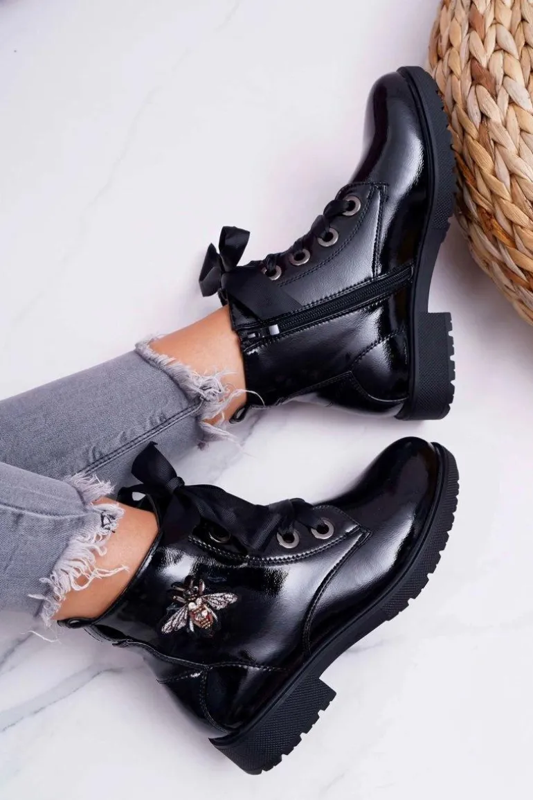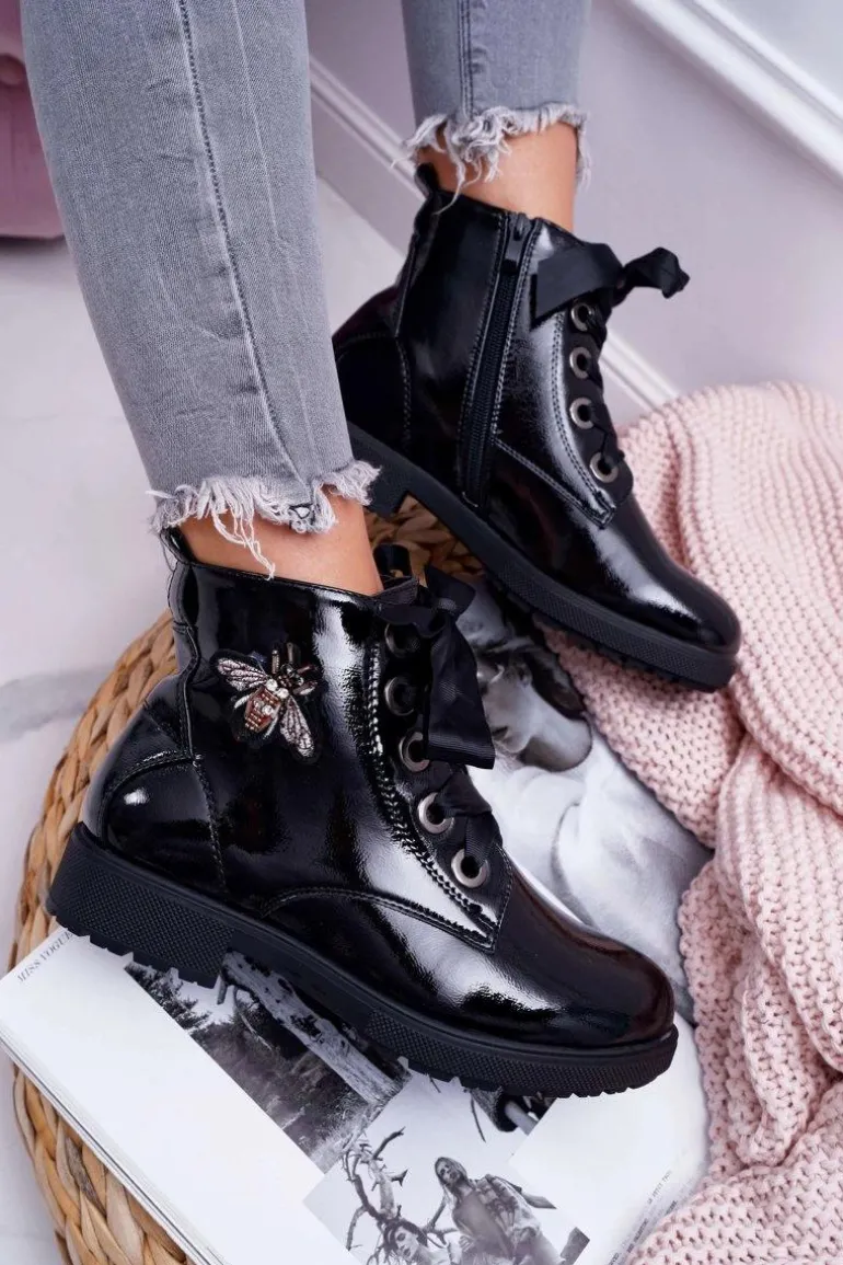 Mamy dla Was coś wyjątkowego! Sznurowane botki z suwakiem na boku, świetnie wpasują się w nadchodzące trendy. Wykonane z wysokiej jakości skóry ekologicznej. Zdobienie w postaci owada z boku cholewki. Mocna, antypoślizgowa podeszwa. Przy wyborze rozmiaru prosimy sugerować się tabelą rozmiarów, która dostępna jest po najechaniu bądź kliknięciu w dany rozmiar.