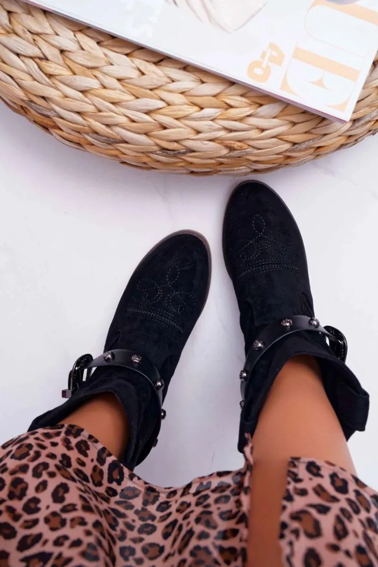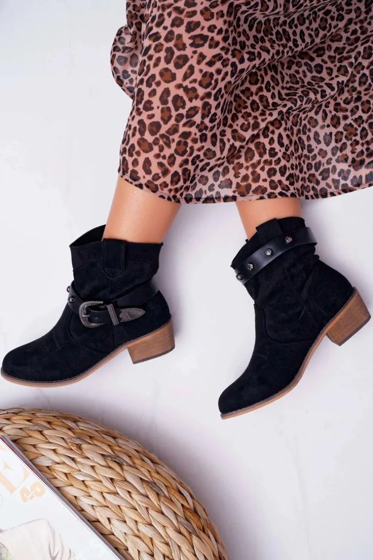 Botki Damskie Płaski Obcas Kowbojki z Klamrą Czarne Ewella