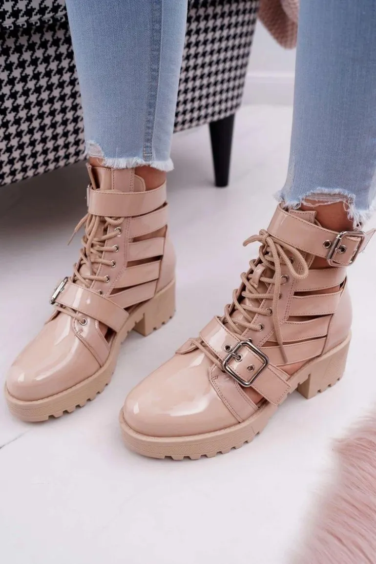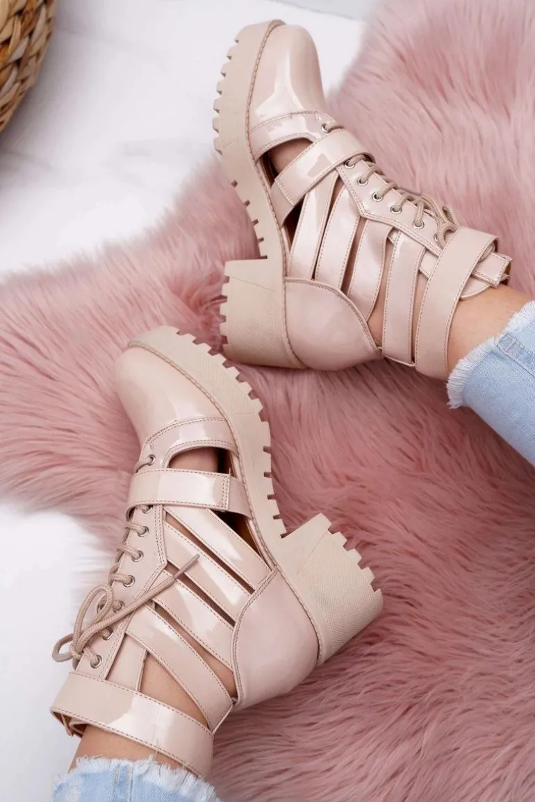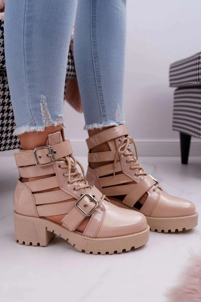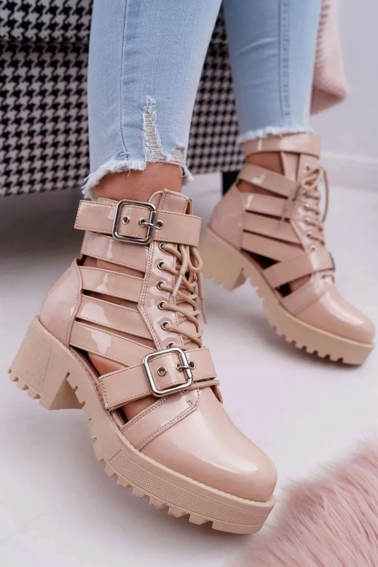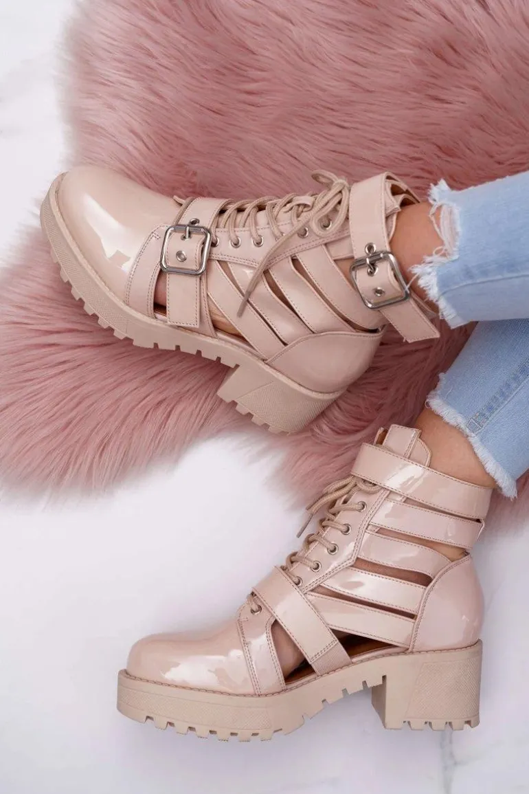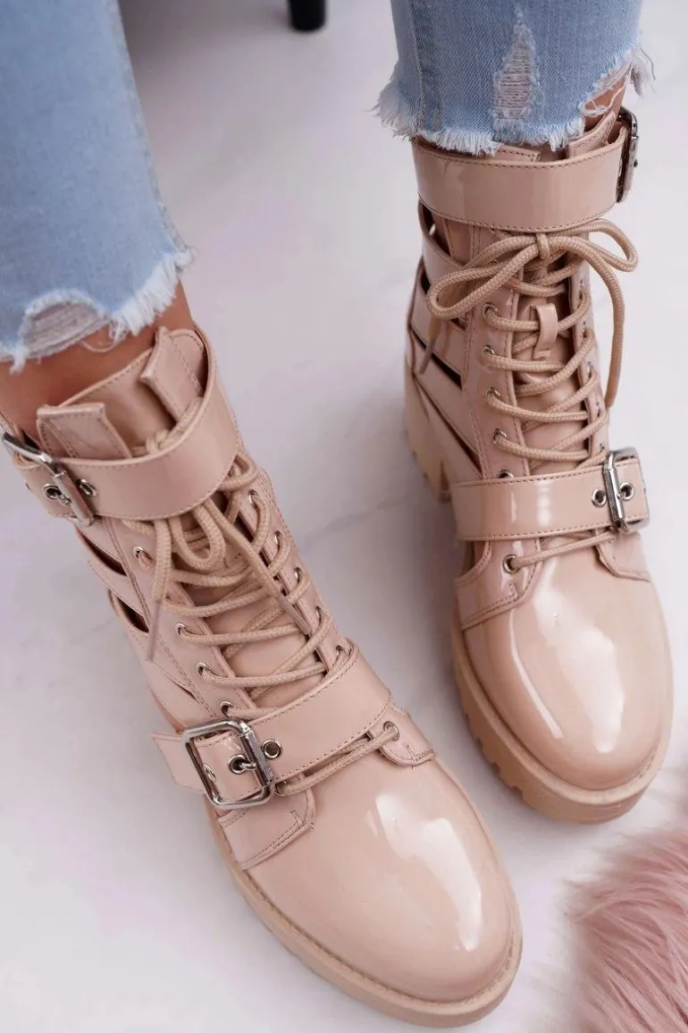 Botki Damskie Płaski Obcas Wiosenne Lakierowane Beżowe Single