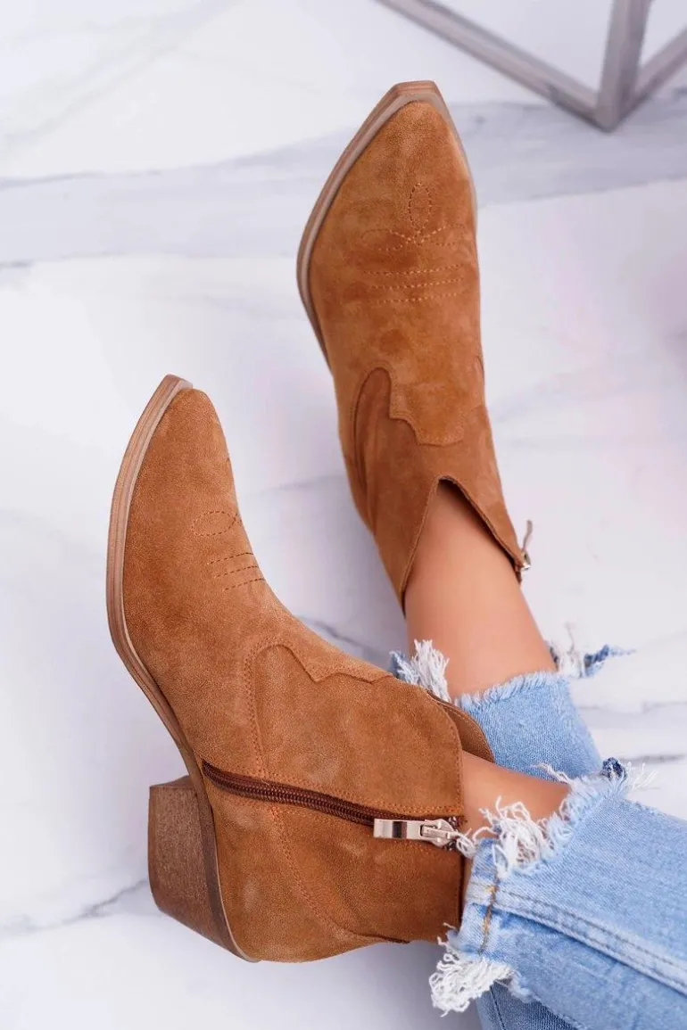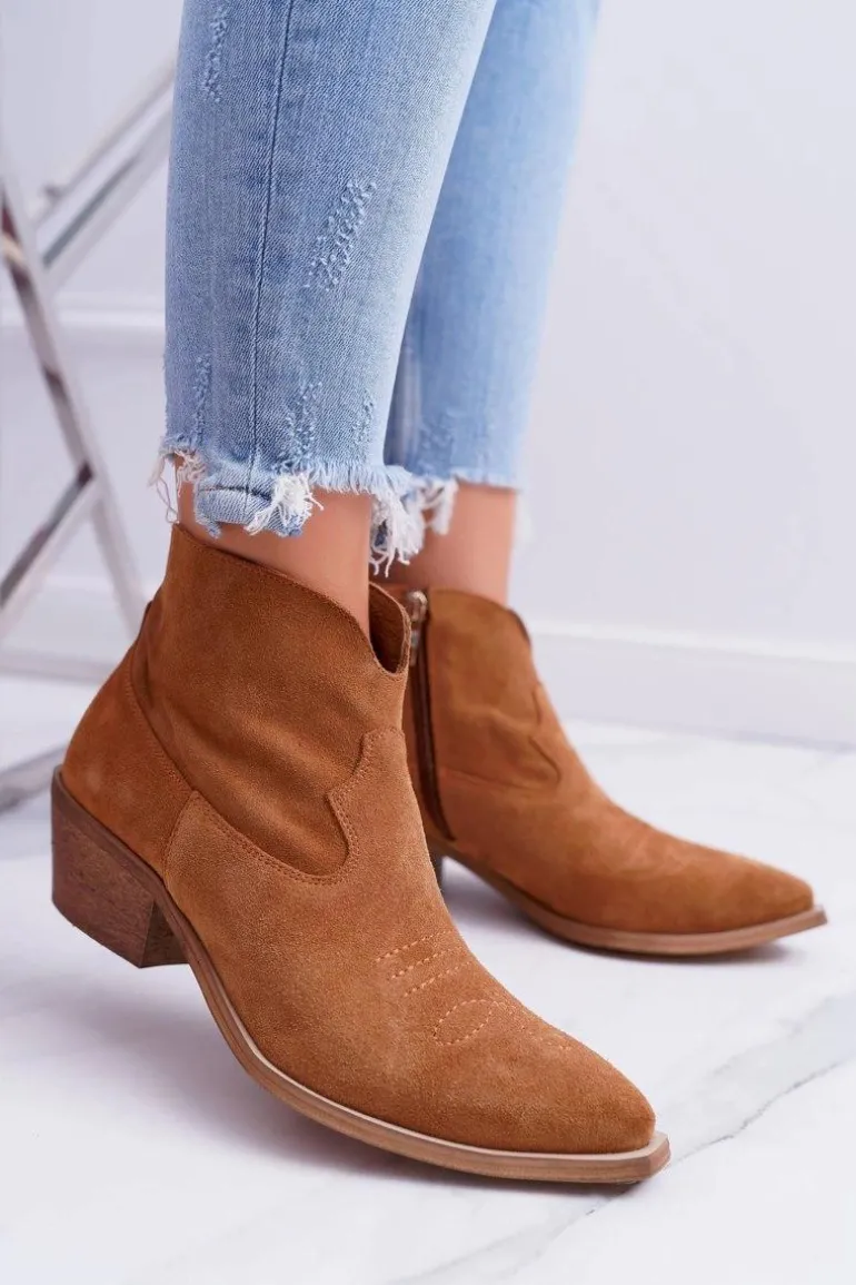 Botki to nie tylko buty na chłodne dni. Świetnie sprawdzą się również podczas tworzenia wiosennych stylizacji. Produkt polski, wykonany w całości ze skóry zamszowej. Delikatny, 5cm płaski obcas uniesie Twoją sylwetkę i podkreśli stylizacje. Styl kowbojek nigdy nie wyjdzie z mody. Idealne do zwiewnych sukienek oraz jeansowych spodni. Przy wyborze rozmiaru prosimy sugerować się tabelą rozmiarów.