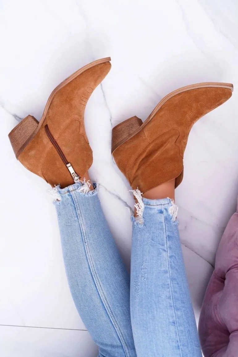Botki Damskie Płaski Obcas Wiosenne Skórzane Kowbojki Camel Batty