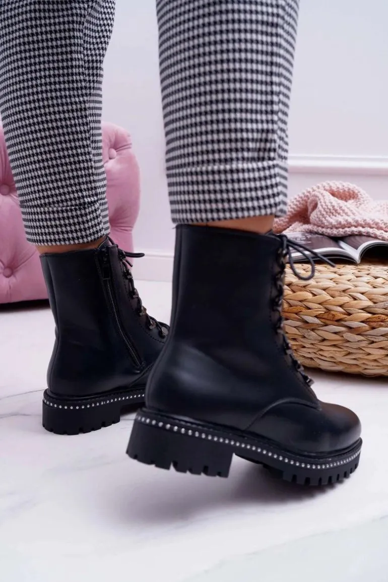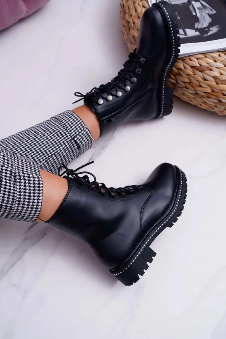 Botki Damskie Płaski Obcas Wysokie Glany Czarne Buena