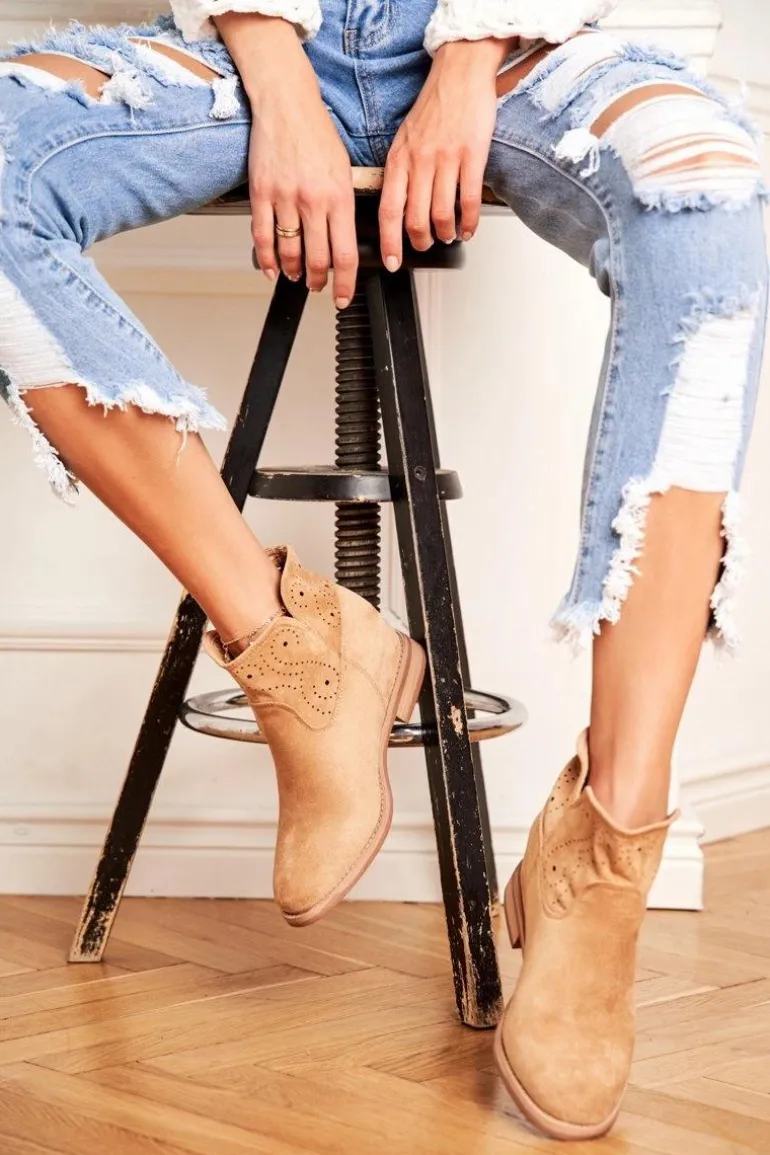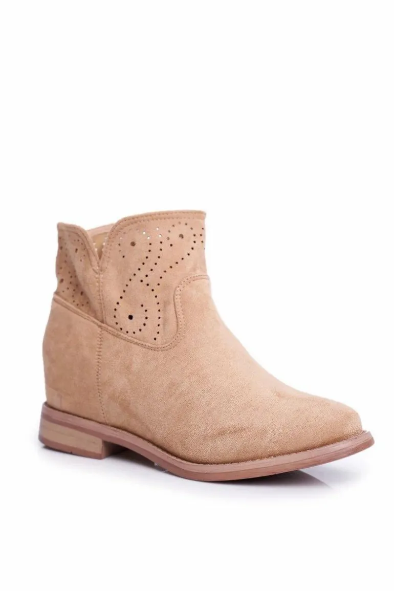 Botki Damskie Płaski Obcas Zamszowe Ażurowe Beżowe Raffe