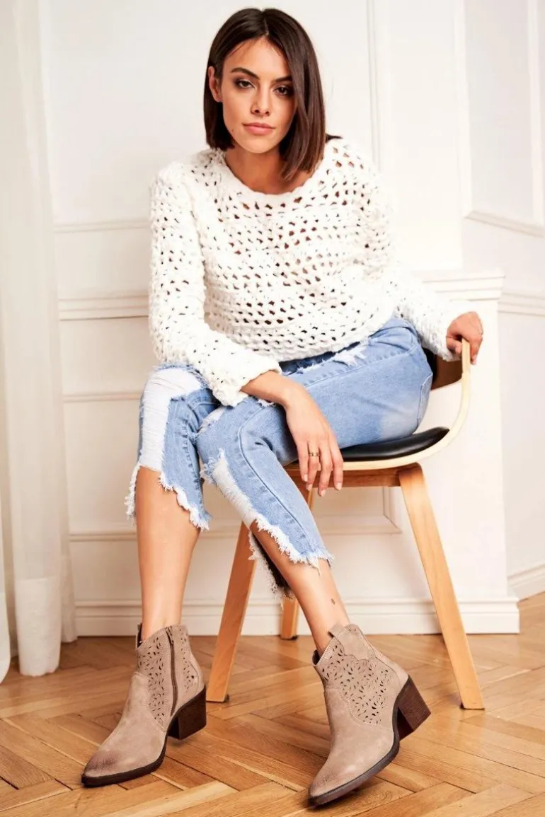 Botki to nie tylko buty na chłodne dni. Świetnie sprawdzą się również podczas tworzenia wiosennych stylizacjach. Botki posiadają zamek z boku cholewki ułatwiający zakładanie. W całości wykonane ze skóry zamszowej, co gwarantuje nam komfort oraz wysoką jakość wykonania. Idealne do zwiewnych sukienek oraz jeansowych spodni. Przy wyborze rozmiaru prosimy sugerować się tabelą rozmiarów.