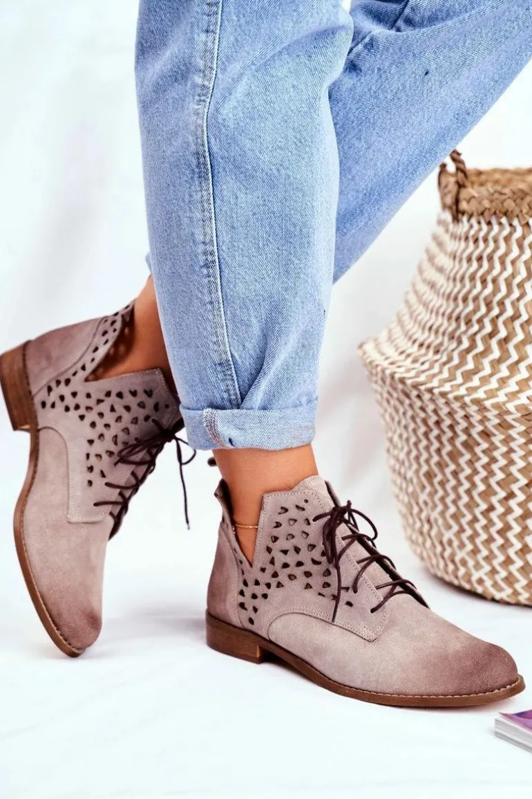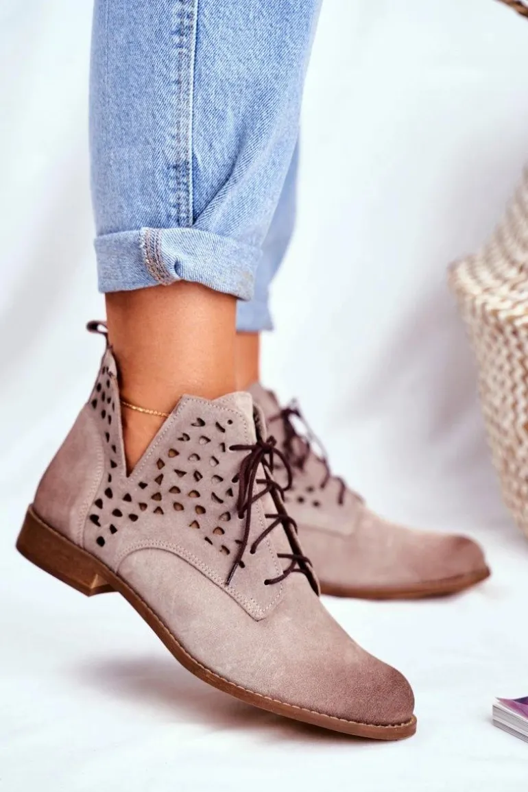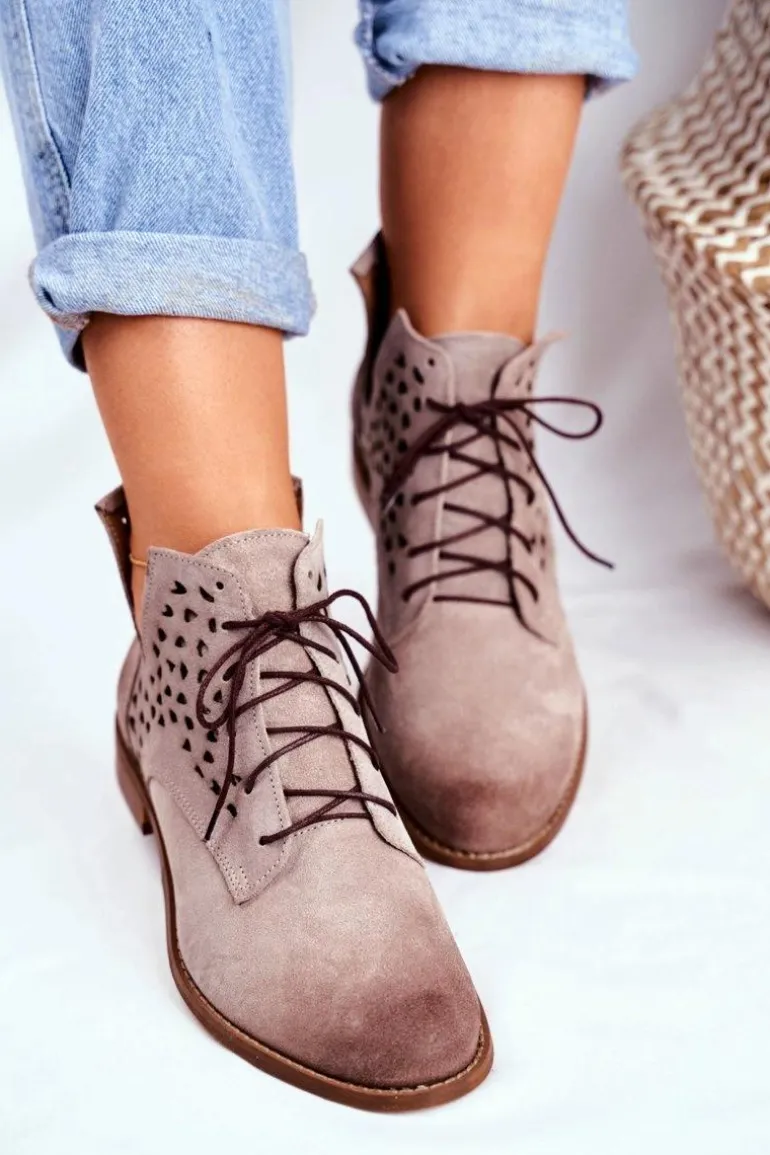 Botki to nie tylko buty na chłodne dni. Świetnie sprawdzą się również podczas tworzenia wiosennych stylizacji. Produkt polski, wykonany w całości ze skóry zamszowej. Delikatny, płaski obcas uniesie Twoją sylwetkę i podkreśli stylizacje. Ażurowy styl nigdy nie wyjdzie z mody. Idealne do zwiewnych sukienek oraz jeansowych spodni. Przy wyborze rozmiaru prosimy sugerować się tabelą rozmiarów.