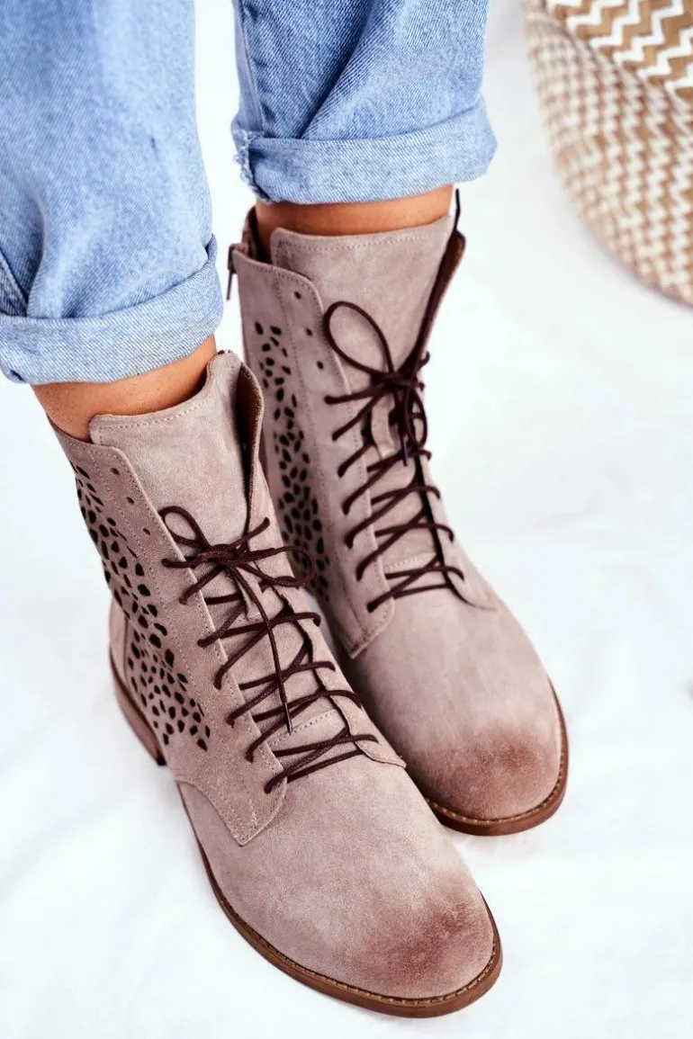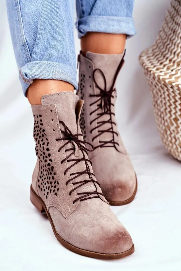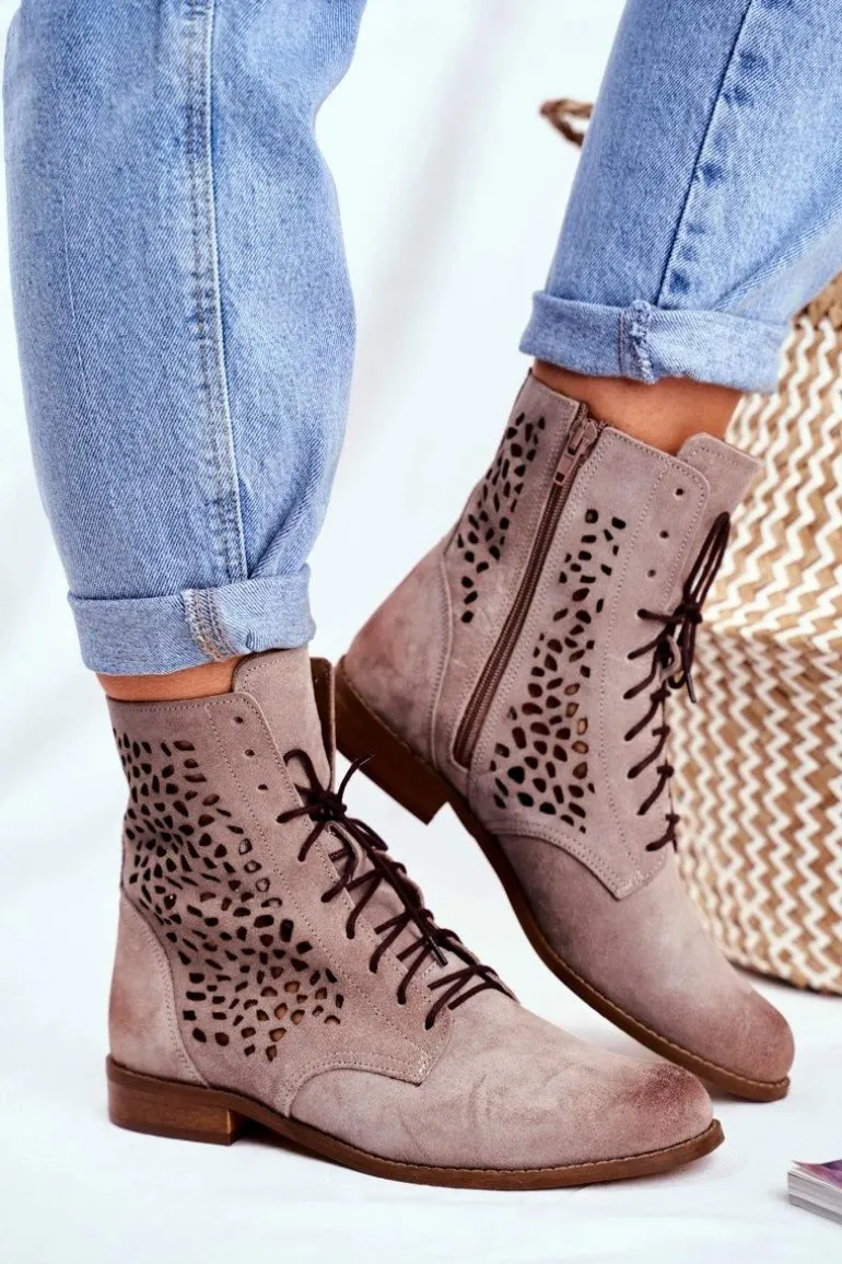 Botki to nie tylko buty na chłodne dni. Świetnie sprawdzą się również podczas tworzenia wiosennych stylizacji. Produkt polski, wykonany w całości ze skóry zamszowej. Delikatny, płaski obcas uniesie Twoją sylwetkę i podkreśli stylizacje. Ażurowy styl nigdy nie wyjdzie z mody. Idealne do zwiewnych sukienek oraz jeansowych spodni. Przy wyborze rozmiaru prosimy sugerować się tabelą rozmiarów.