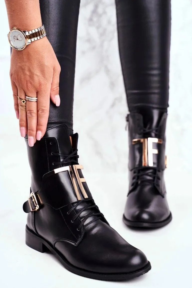 Buty zostały wykonane z naturalnego zamszu. Zdobienie w postaci dużej klamry oraz złotych literek pięknie podkreśla ich wyjątkowy styl. Zakładanie ułatwi wszyty na boku suwak, natomiast o lepsze dopasowanie zadbają sznurowadła. Botki oparte na delikatnym płaskim obcasie. Przy wyborze rozmiaru prosimy sugerować się tabelą rozmiarów.