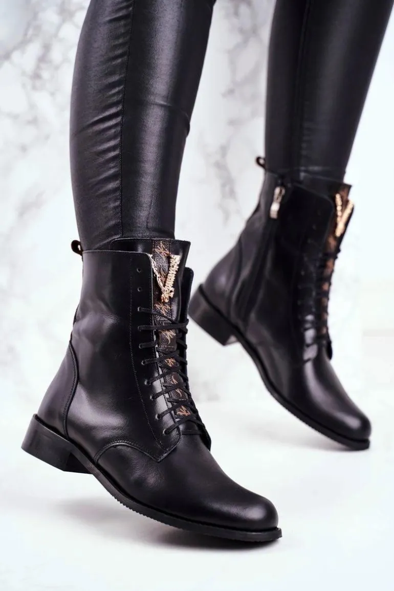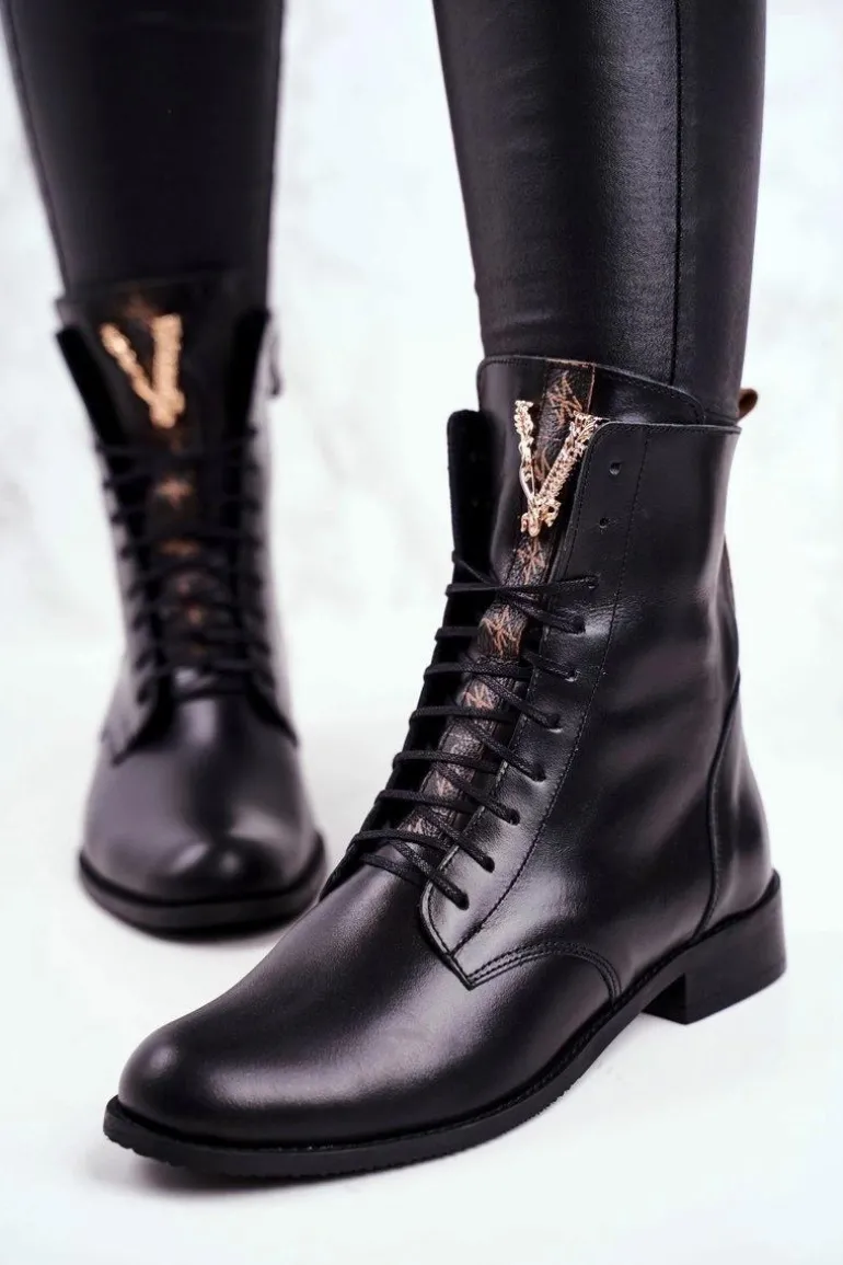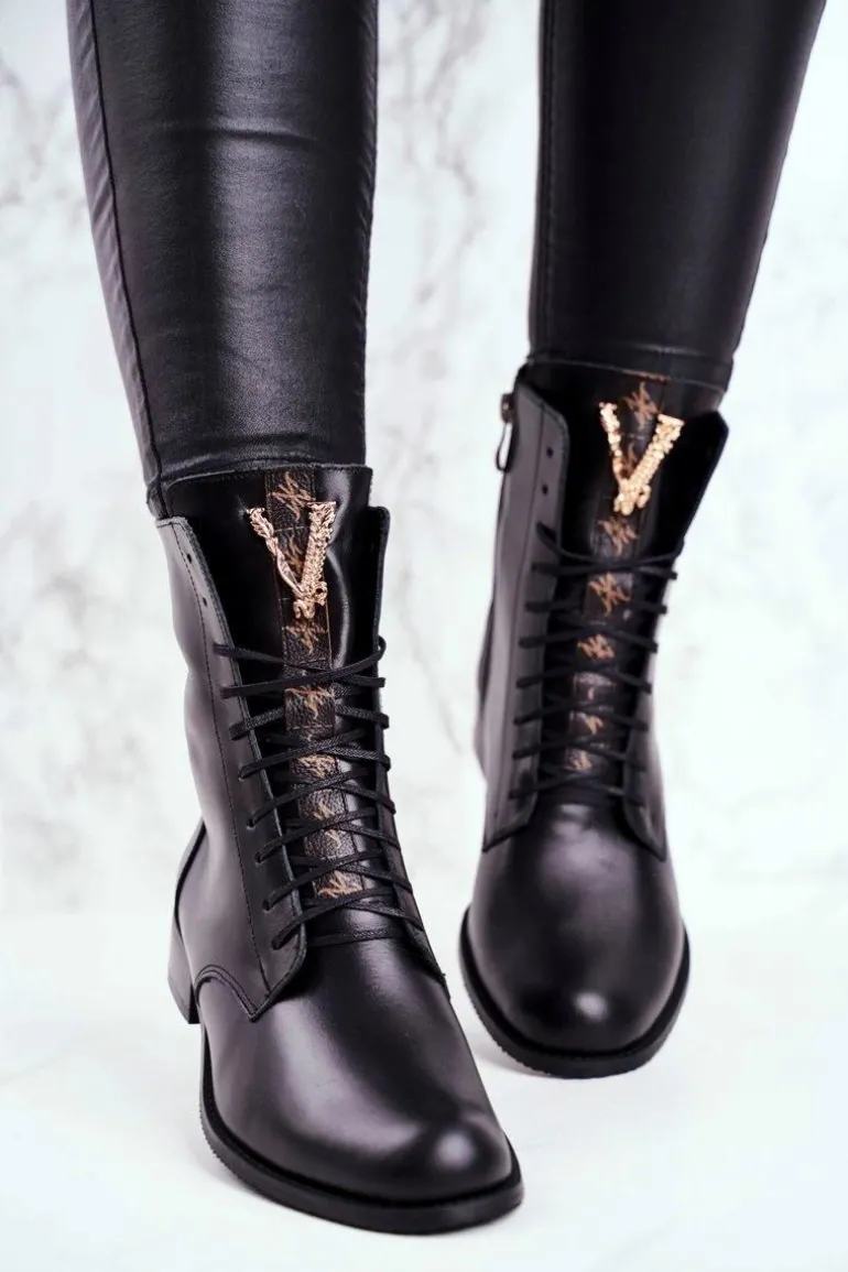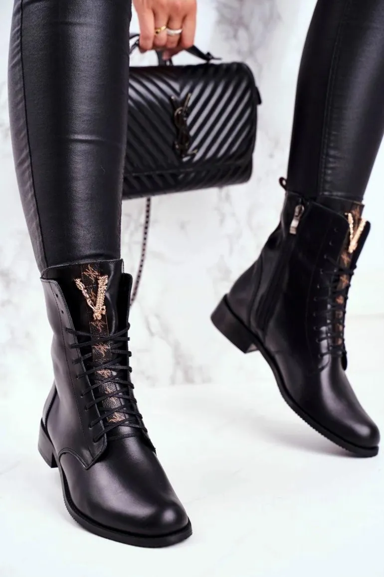 Botki to nie tylko buty na chłodne dni. Świetnie sprawdzą się również podczas tworzenia wiosennych stylizacji. Buty zostały wykonane z naturalnej skóry. Ocieplenie w postaci koca obuwniczego. Zdobienie w postaci złotej literki V wygląda przepięknie i podkreśla ich stylistykę. Zakładanie ułatwi wszyty na boku suwak, natomiast o lepsze dopasowanie zadbają sznurowadła. Botki oparte na delikatnym płaskim obcasie. Przy wyborze rozmiaru prosimy sugerować się tabelą rozmiarów.