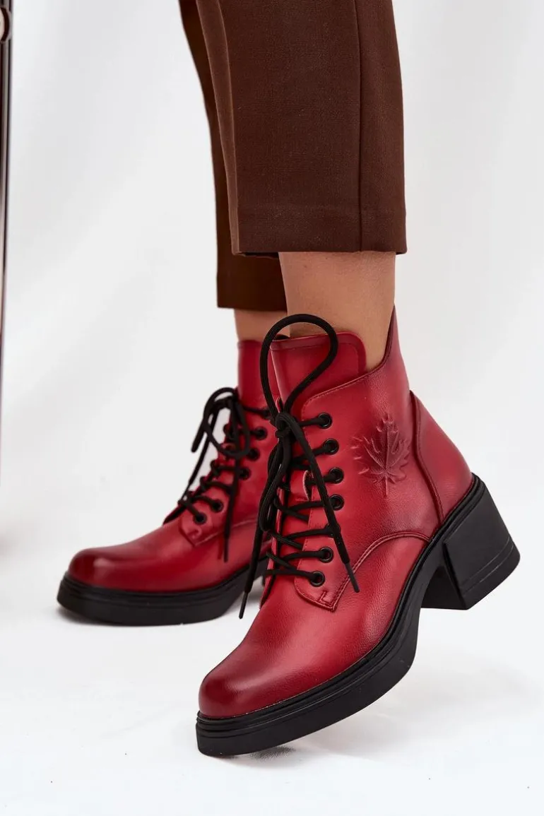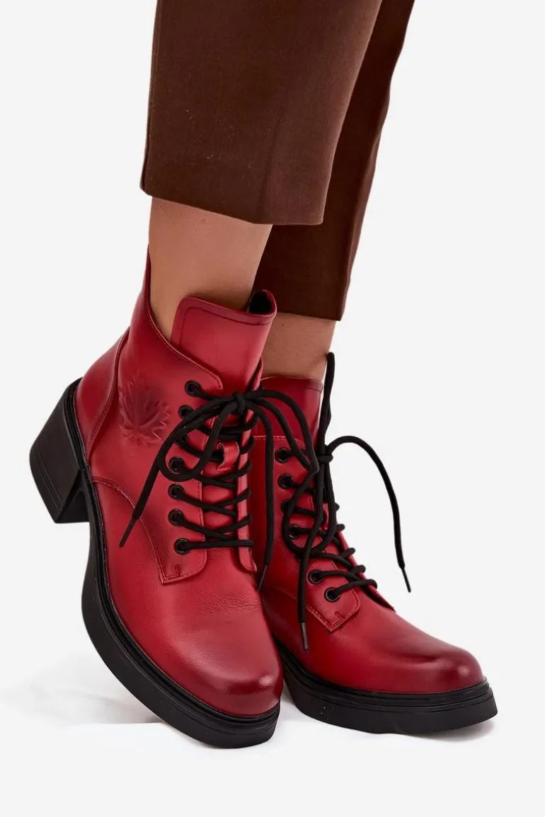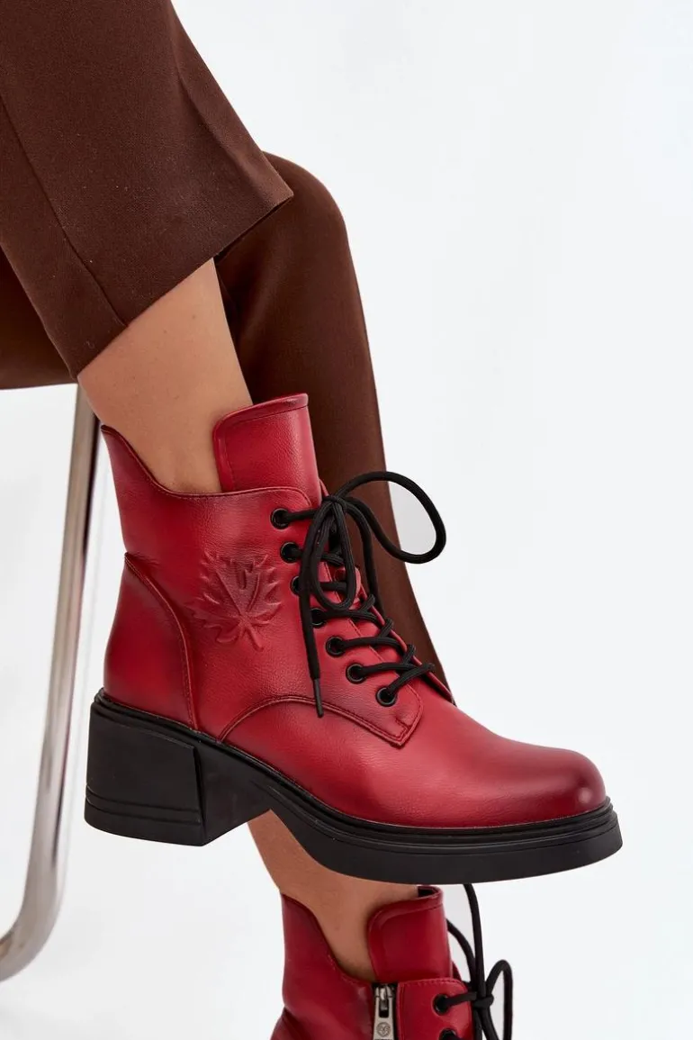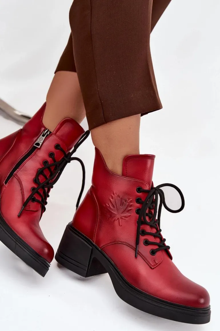 Botki damskie marki Vinceza wykonane z naturalnej skóry to doskonałe obuwie na chłodniejsze dni. Stabilny obcas typu klocek zapewnia wygodę podczas noszenia, a połączenie sznurowania z zamkiem ułatwia zakładanie i dopasowanie do stopy. Wnętrze ocieplane miękkim kocem obuwniczym dba o ciepło i komfort, natomiast subtelne tłoczenie w formie liścia na boku nadaje całości stylowego akcentu. To model, który sprawdzi się zarówno na co dzień, jak i w bardziej szykownych stylizacjach. Przy wyborze rozmiaru prosimy sugerować się tabelą rozmiarów.