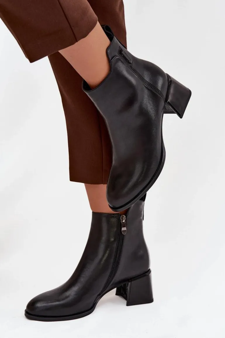 Botki damskie z naturalnej skóry to elegancka propozycja na sezon jesienno-zimowy. Osadzone na stabilnym obcasie typu słupek, subtelnie wysmuklają sylwetkę, a jednocześnie zapewniają komfort noszenia. Zamek boczny ułatwia zakładanie, a ocieplenie kocem obuwniczym gwarantuje ciepło w chłodniejsze dni. Na cholewce znajdują się ozdobne przeszycia oraz subtelny detal z boku, które dodają całości wyjątkowego charakteru. To uniwersalny model, idealny zarówno do codziennych, jak i formalnych stylizacji.