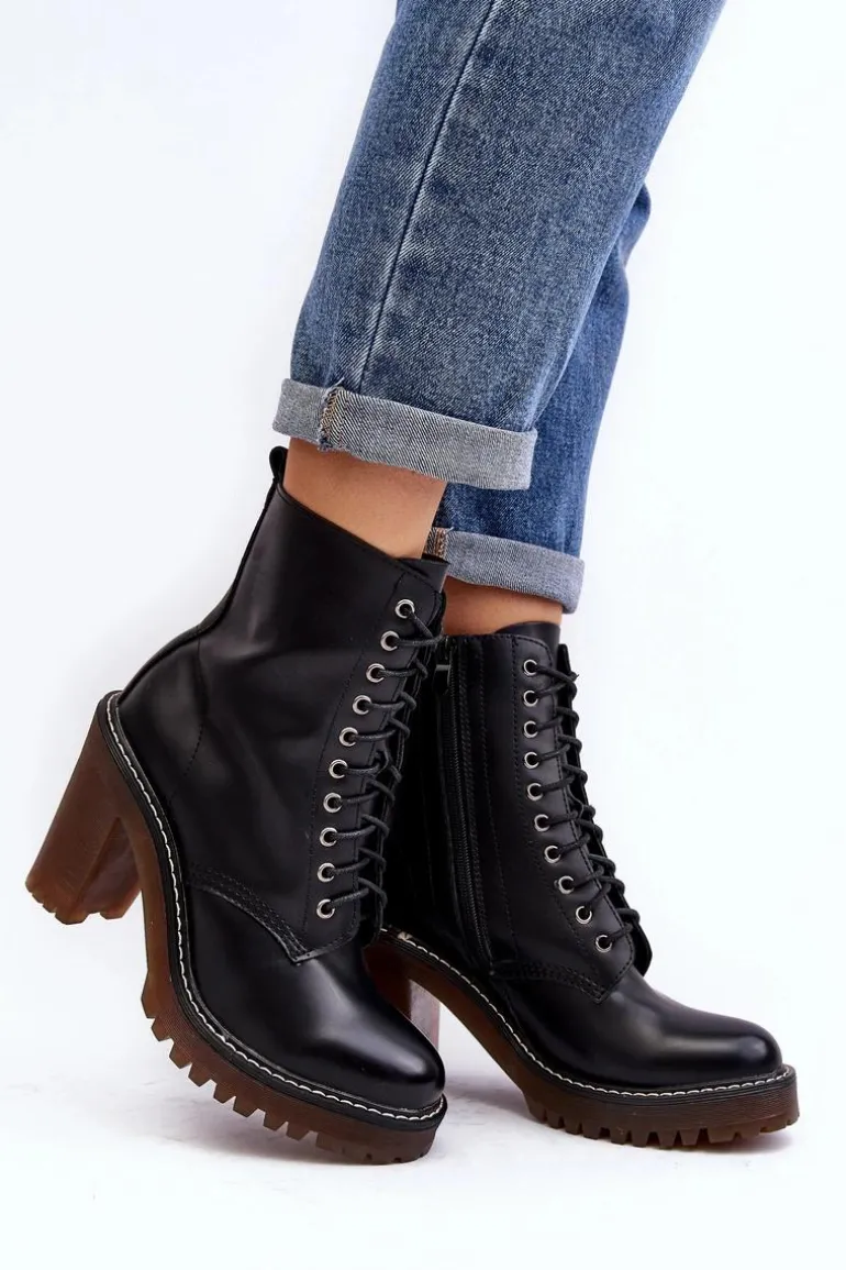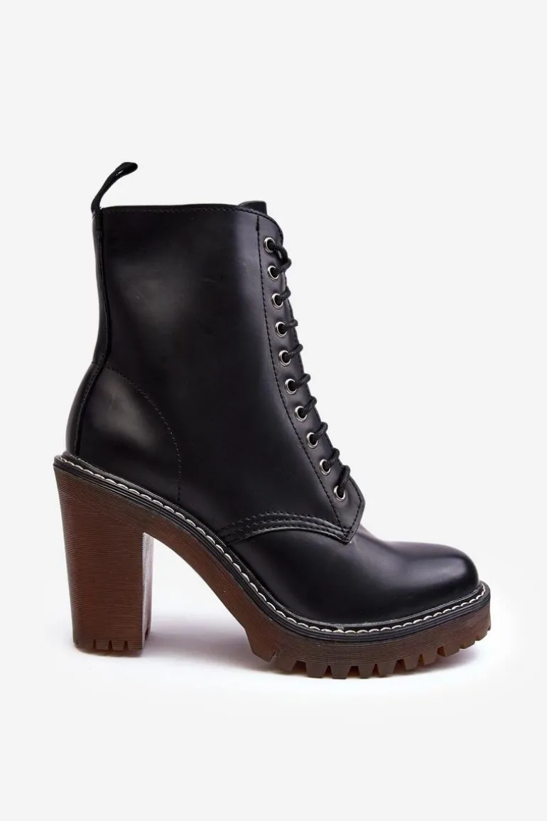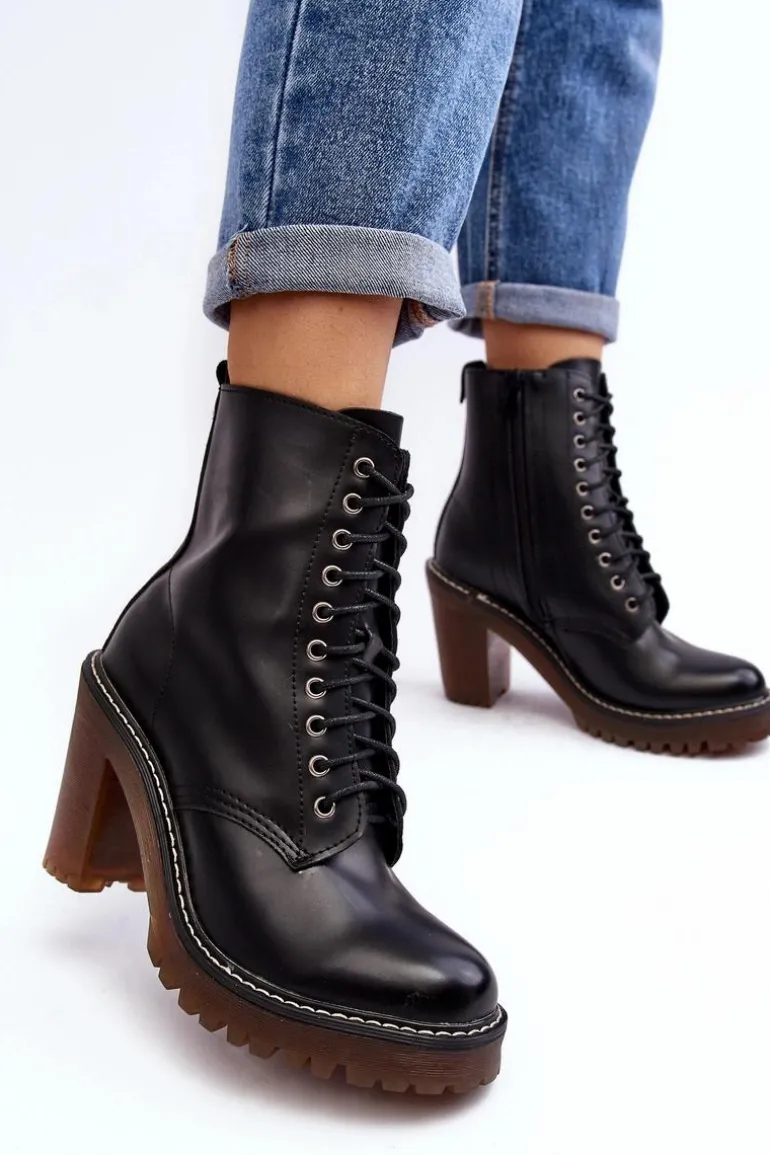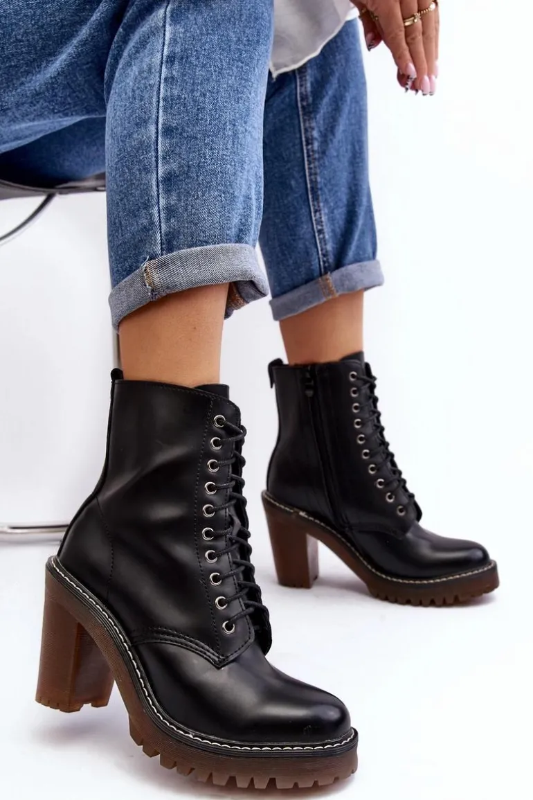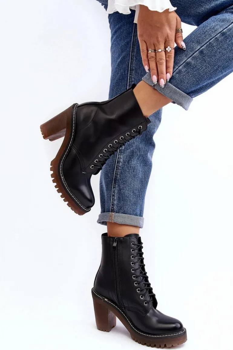 Botki damskie wykonane z eko skóry. Osadzone na obcasie w postaci słupka. Cholewka za kostkę. Model zapinany na suwak z boku oraz dodatkowo posiada sznurowanie. Wkładka ocieplona kocem obuwniczym. Noski zaokrąglone. Usztywniony zapiętek. Przy wyborze rozmiaru prosimy sugerować się tabelą rozmiarów.