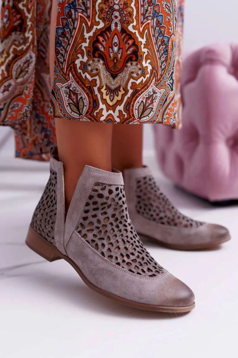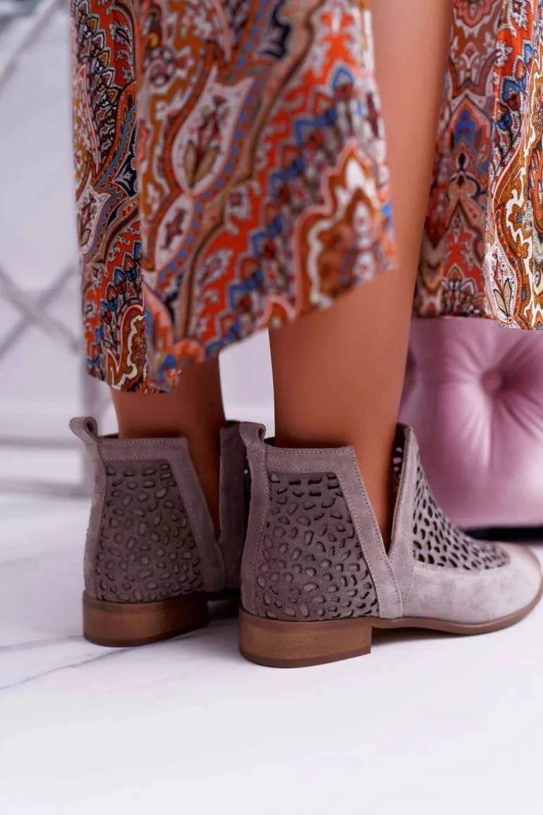 Przepiękne z wycięciami wykonane w całości z zamszowej skóry naturalnej. Jest to produkt Polski, wykonany ręcznie. Występują w dwóch kolorach, więc z pewnością znajdziesz tu swój ulubiony kolor. Ażurowe wykończenie na cholewce oraz zapiętku. Botki idealne sprawdzą się podczas ciepłych wiosennych dni. Przy wyborze rozmiaru prosimy sugerować się tabelą rozmiarów dostępną po najechaniu bądź kliknięciu na dany rozmiar.