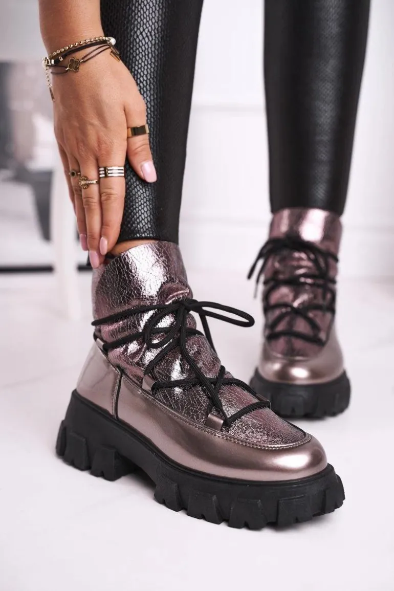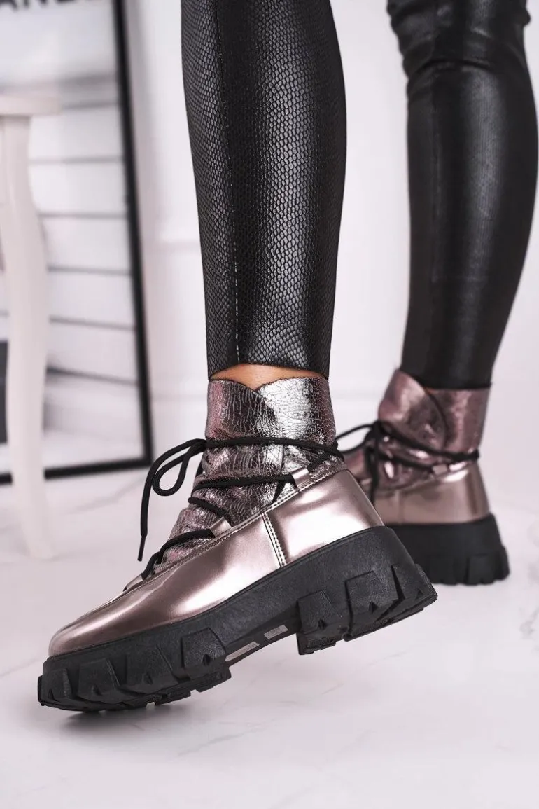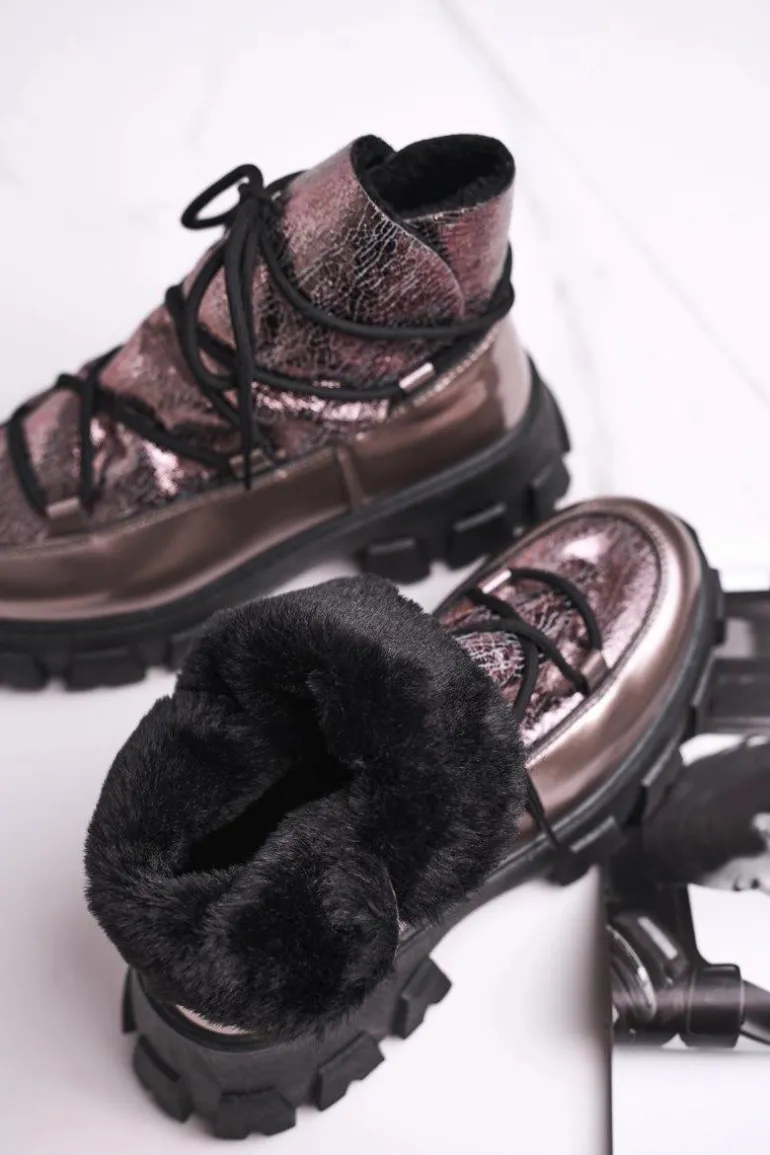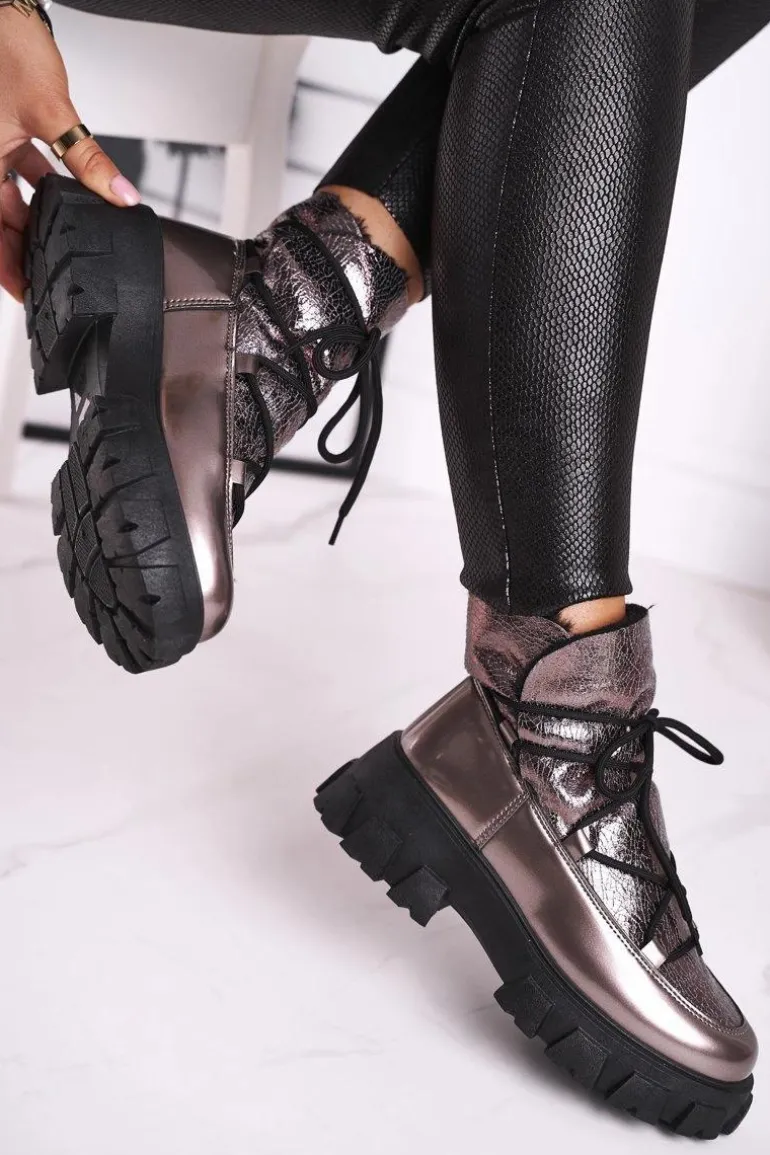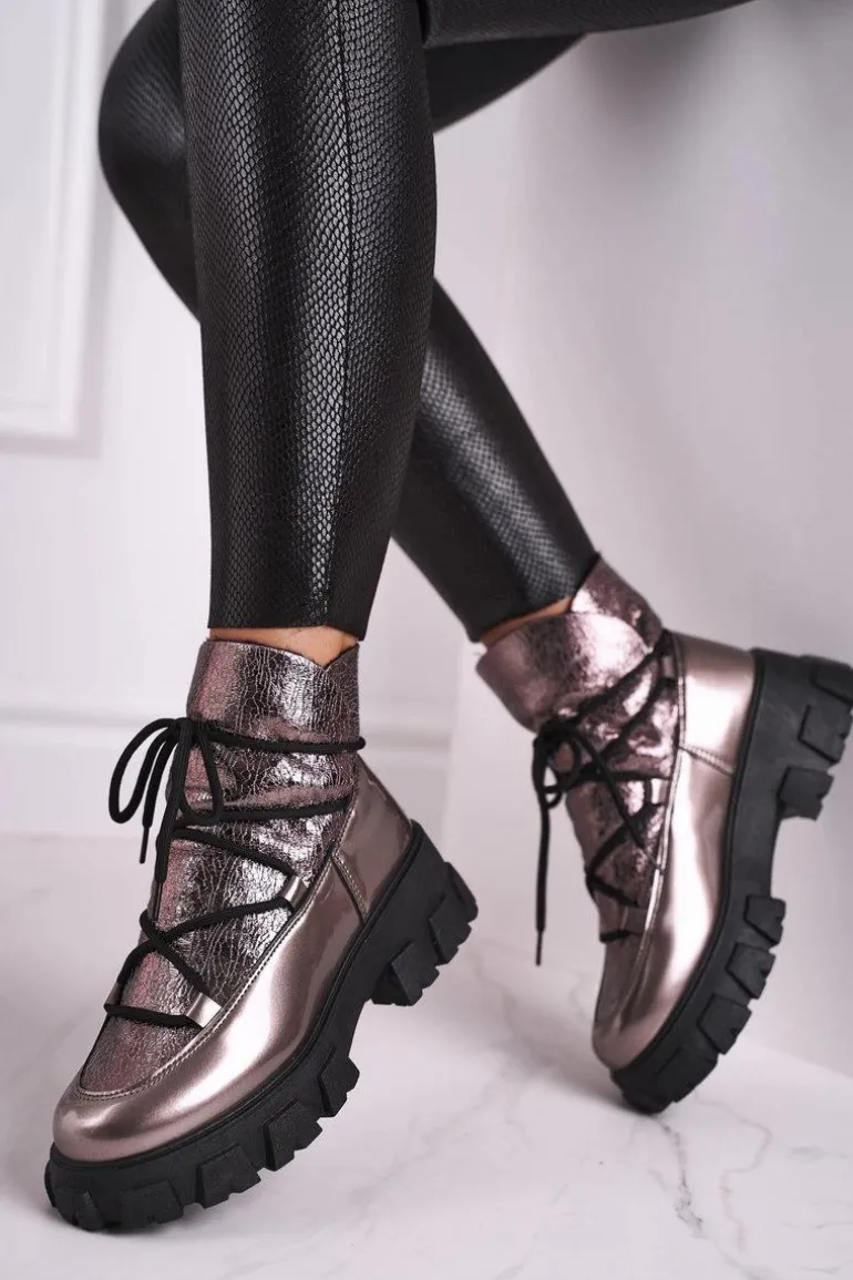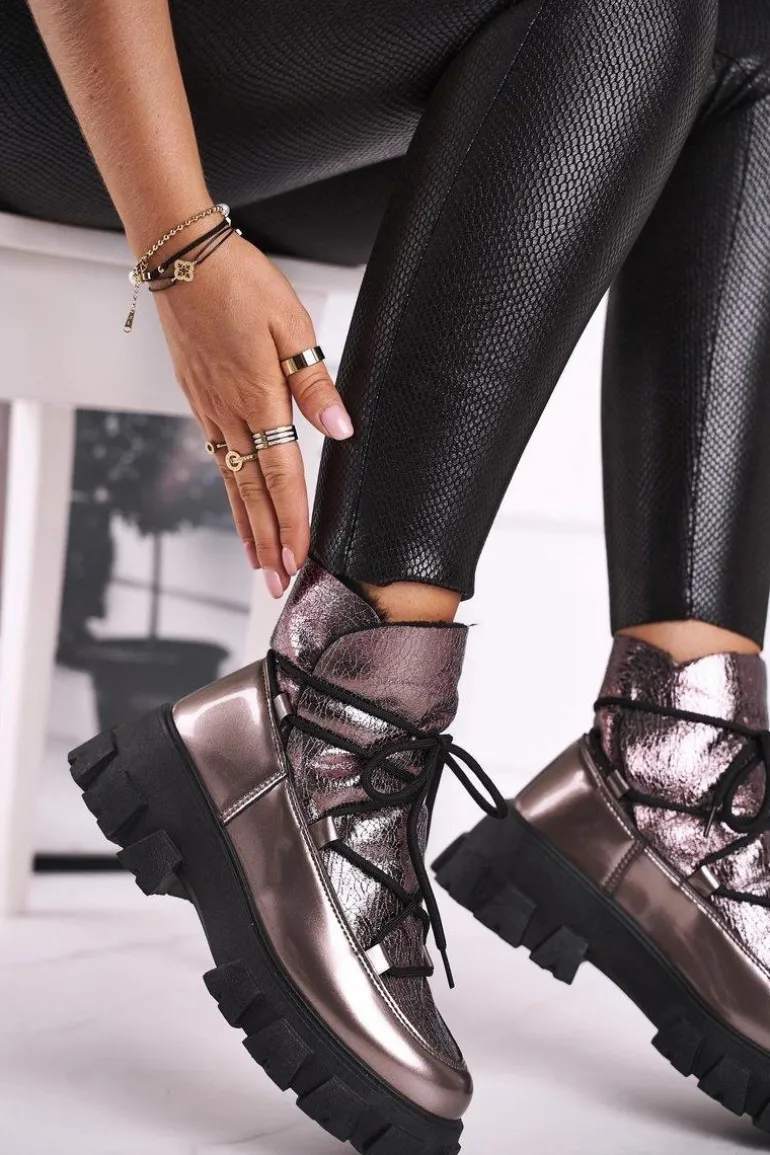 Czy może nas coś jeszcze zaskoczyć? Oczywiście! Spójrz na te przepiękne botki! Botki wykonane ze skóry ekologicznej, wewnątrz ocieplone ciepłym kocem obuwniczym, więc o ciepło w chłodnie dni nie musisz się martwić. Masywna podeszwa, wysoka miękka cholewka – botki świetnie wpiszą się w stylizacje glam rock lub grunge. Przy wyborze rozmiaru prosimy sugerować się tabelą rozmiarów.