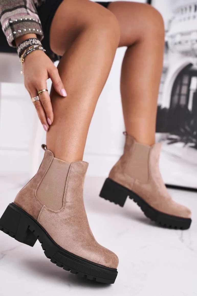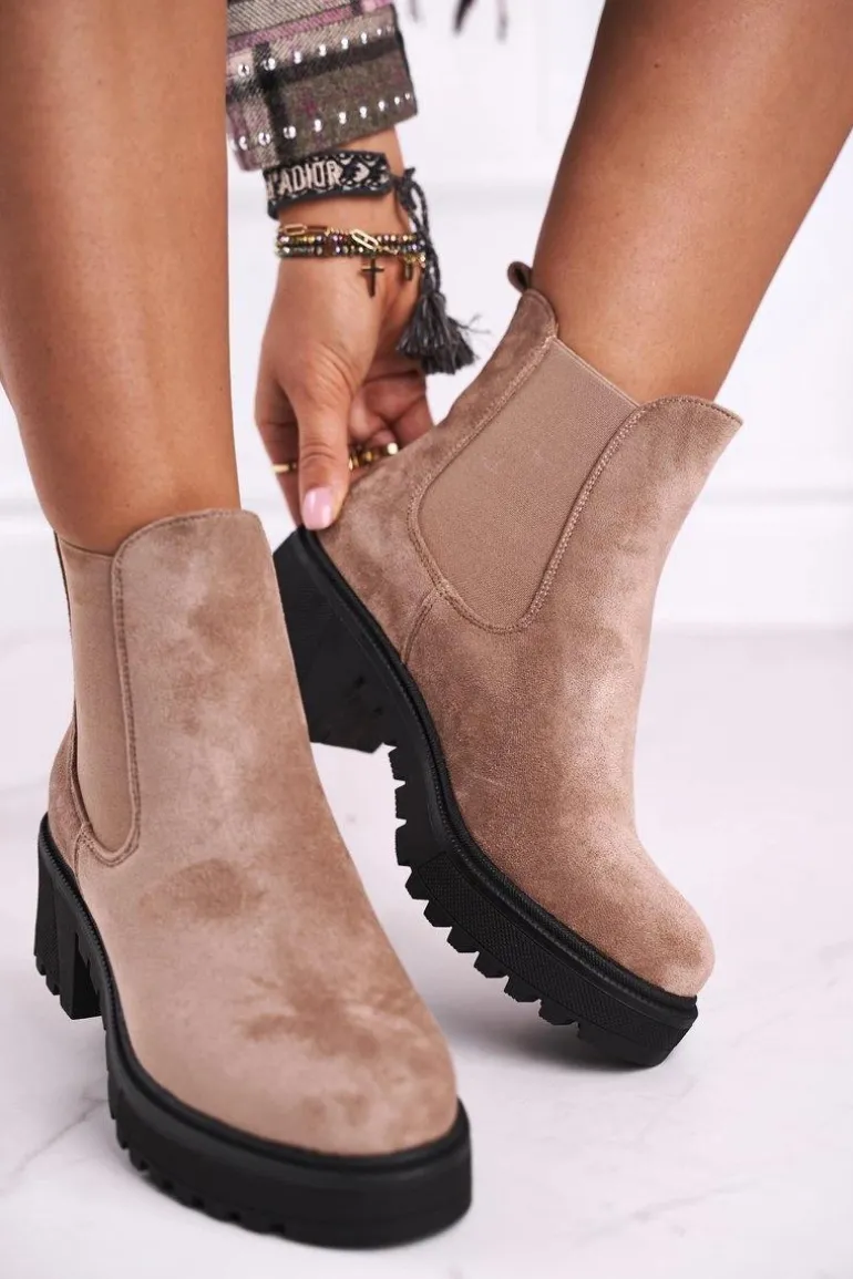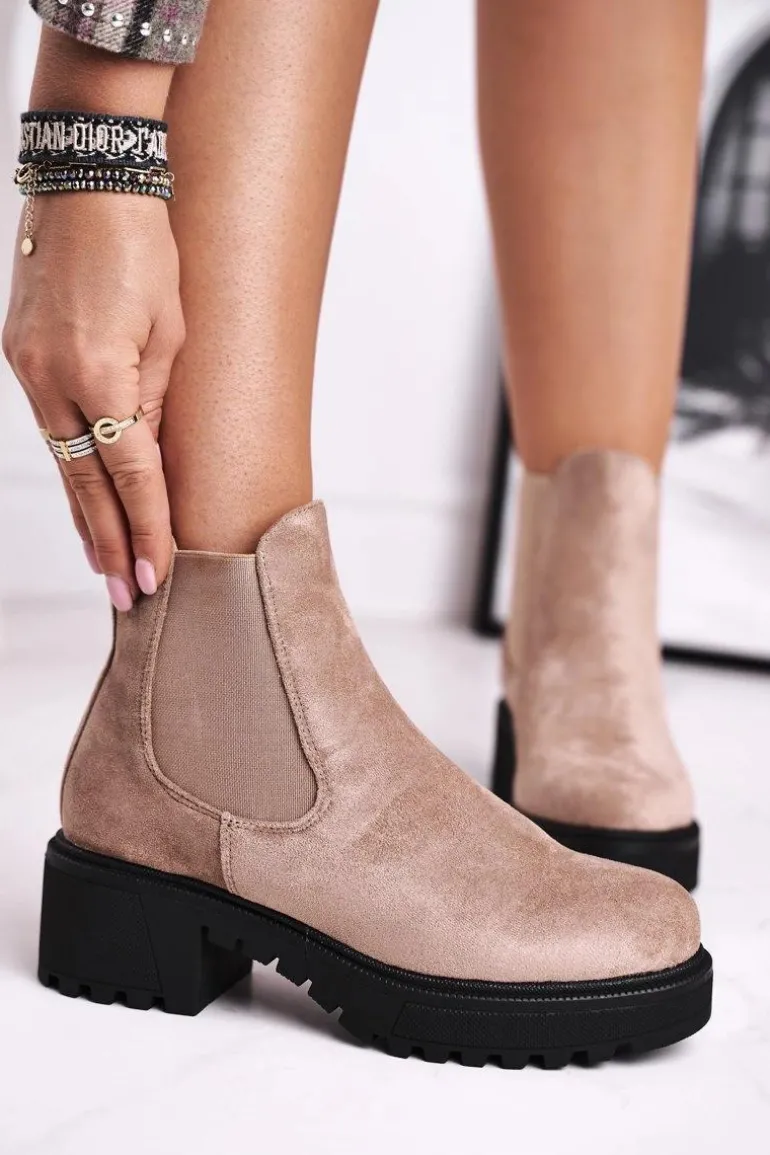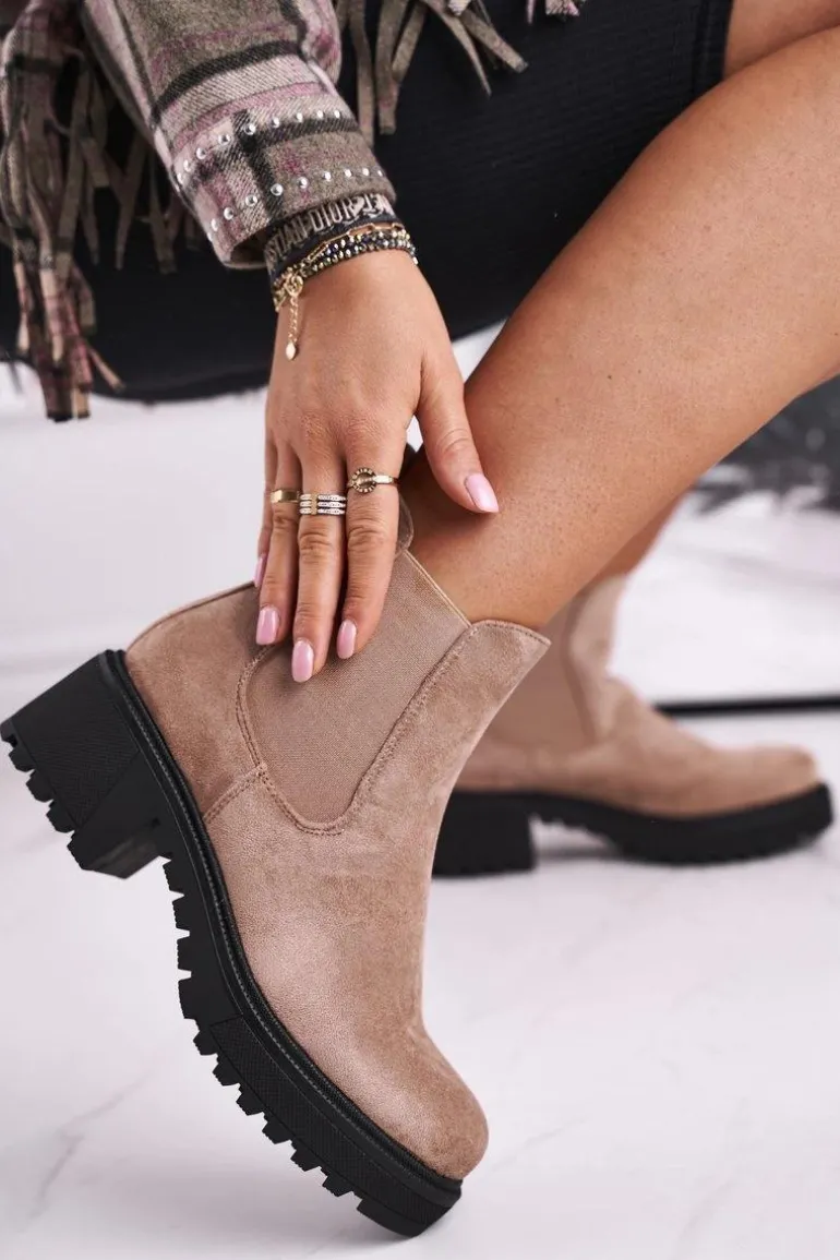 Czy może nas coś jeszcze zaskoczyć? Oczywiście! Spójrz na te przepiękne botki! Wykonane z ekologicznego zamszu, wewnątrz ocieplone kocem obuwniczym z krótkim włosiem, więc o ciepło w chłodnie dni nie musisz się martwić. Masywna podeszwa, wysoka cholewka połączona z gumami – botki świetnie wpiszą się w stylizacje glam rock lub grunge. Przy wyborze rozmiaru prosimy sugerować się tabelą rozmiarów.