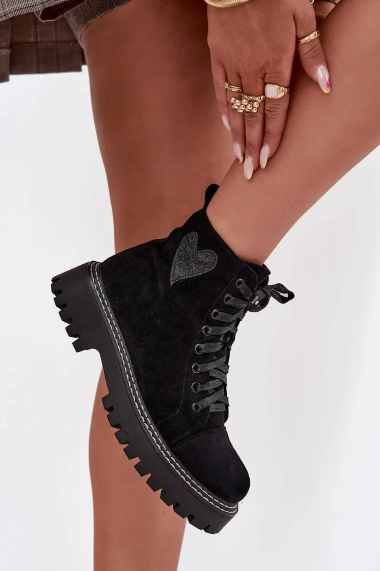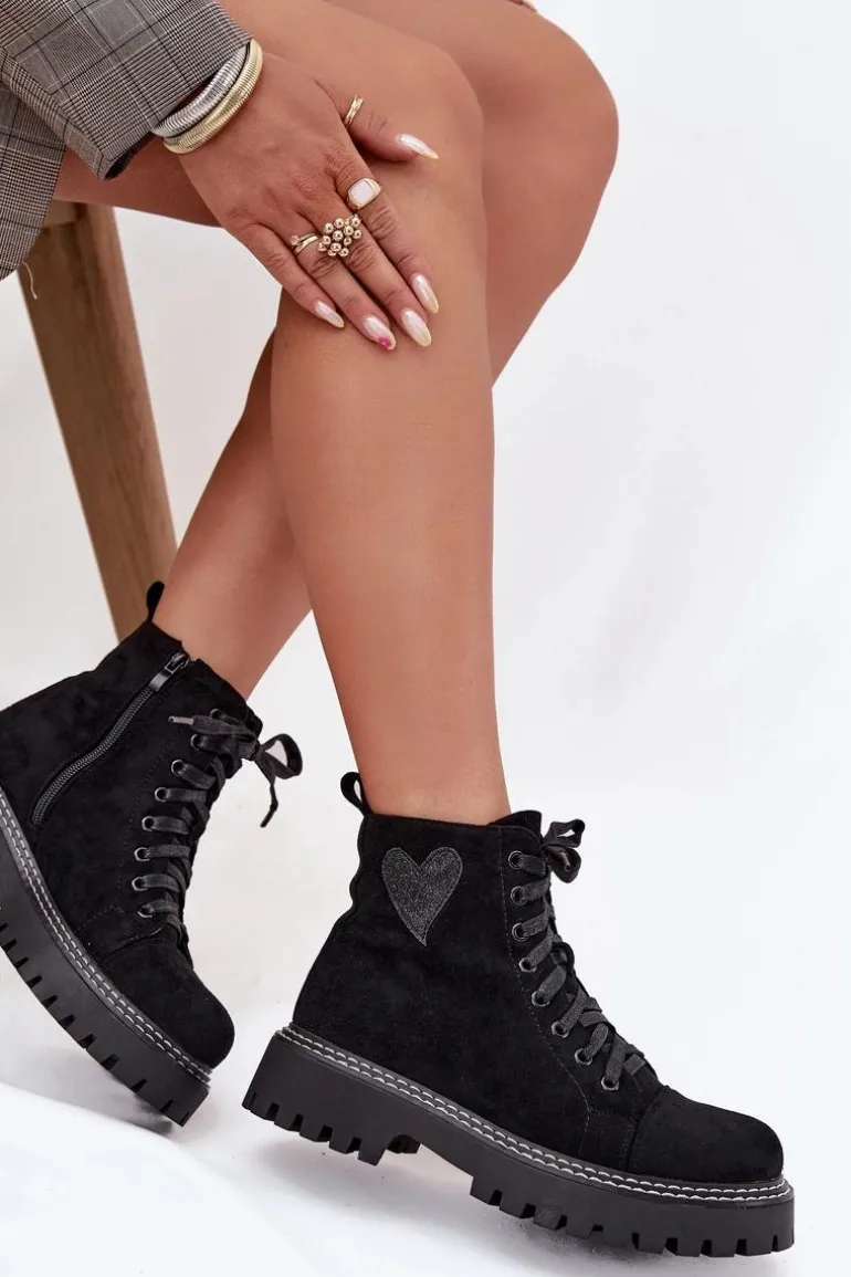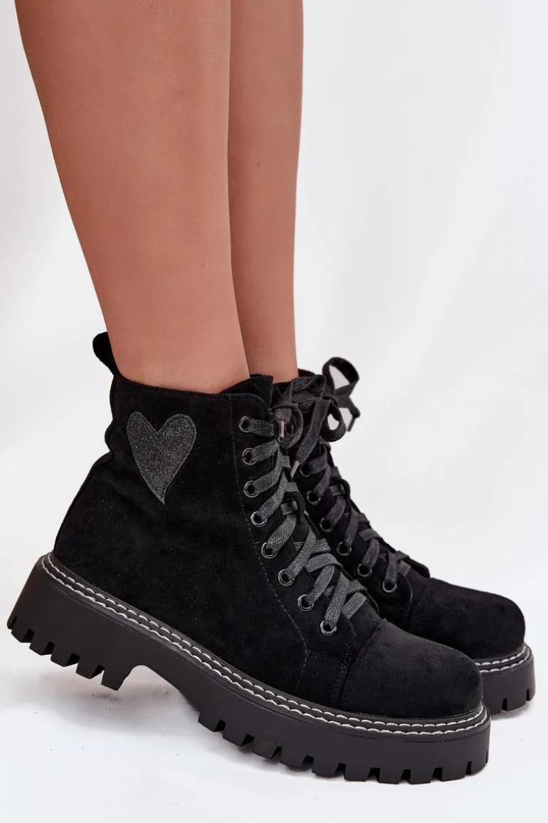 Damskie botki wykonane z eko zamszu. Model zapinany na zamek i dodatkowo sznurowany, co zapewnia doskonałe dopasowanie do stopy. Zaokrąglone noski gwarantują komfort podczas noszenia. Cholewka ozdobiona błyszczącym sercem dodaje uroku i unikalnego charakteru. Idealne na co dzień, świetnie uzupełnią casualowe stylizacje. Przy wyborze rozmiaru prosimy sugerować się tabelą rozmiarów.