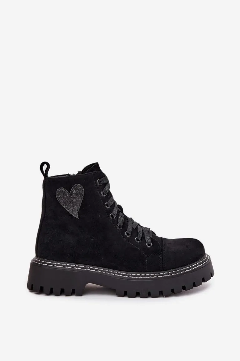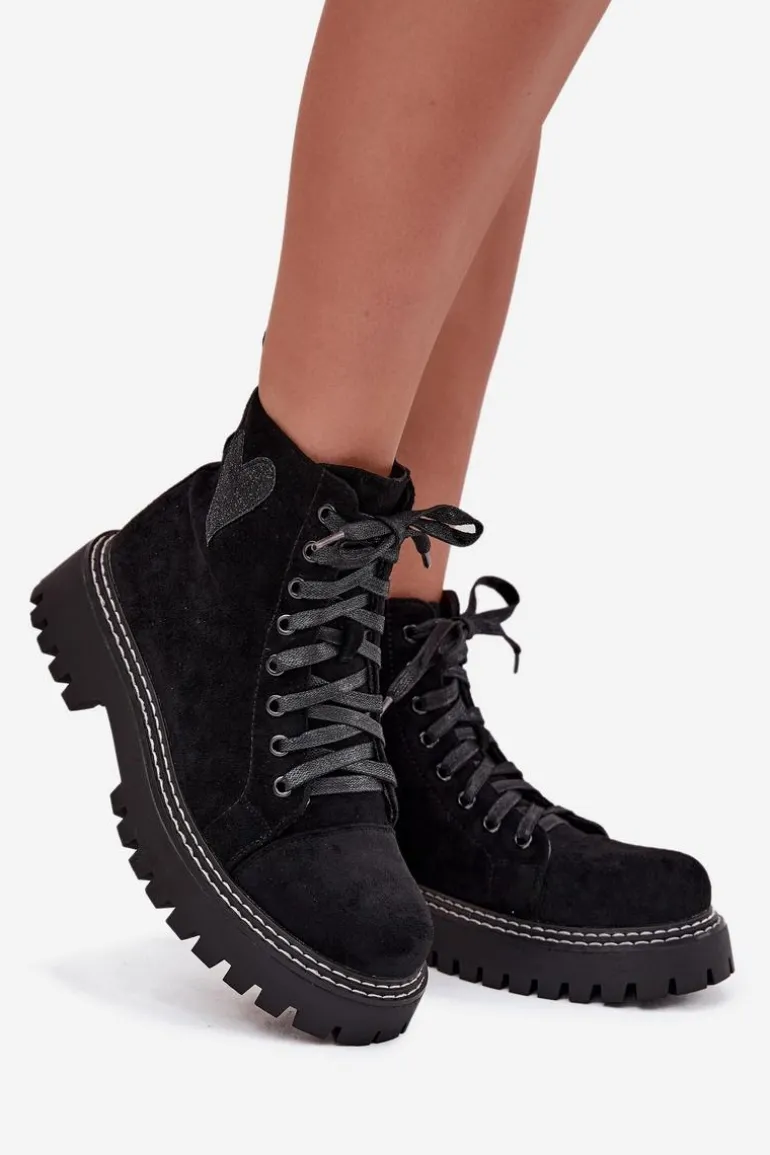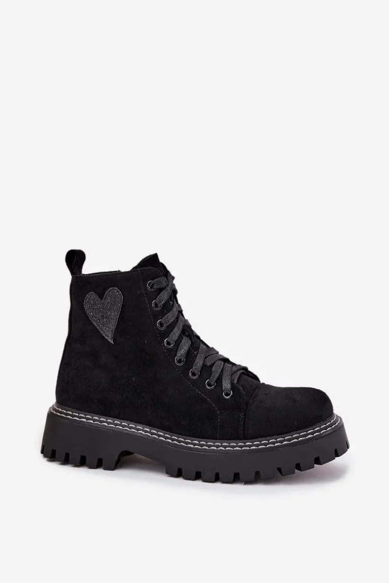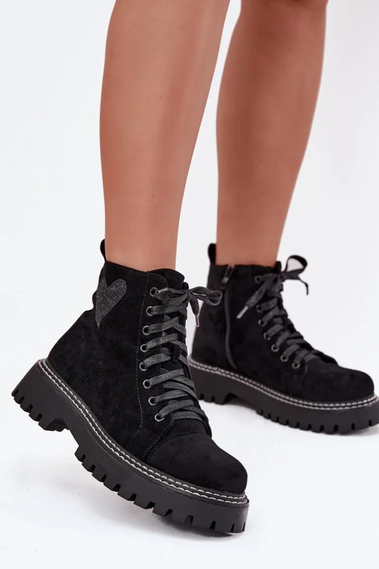 Damskie botki wykonane z eko zamszu. Model zapinany na zamek i dodatkowo sznurowany, co zapewnia doskonałe dopasowanie do stopy. Zaokrąglone noski gwarantują komfort podczas noszenia. Cholewka ozdobiona błyszczącym sercem dodaje uroku i unikalnego charakteru. Idealne na co dzień, świetnie uzupełnią casualowe stylizacje. Przy wyborze rozmiaru prosimy sugerować się tabelą rozmiarów.