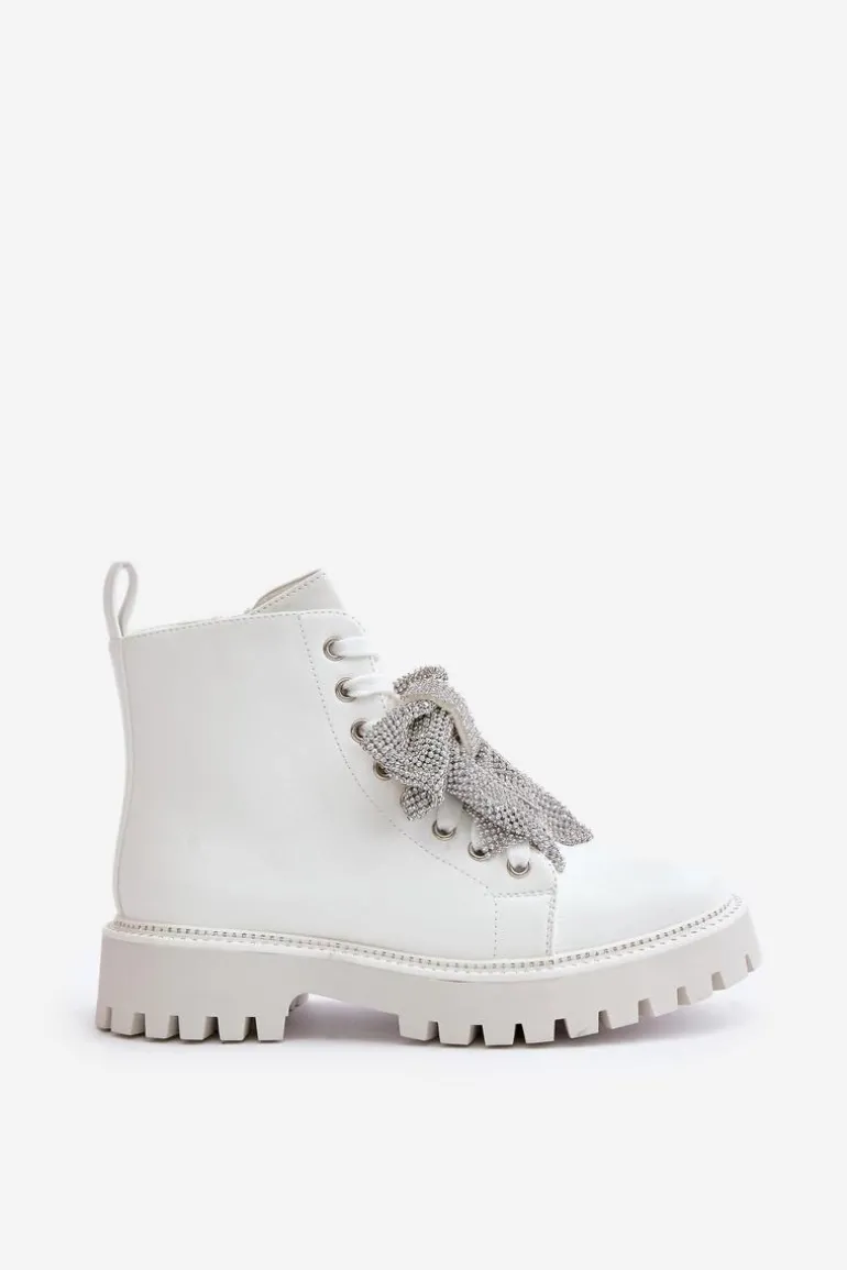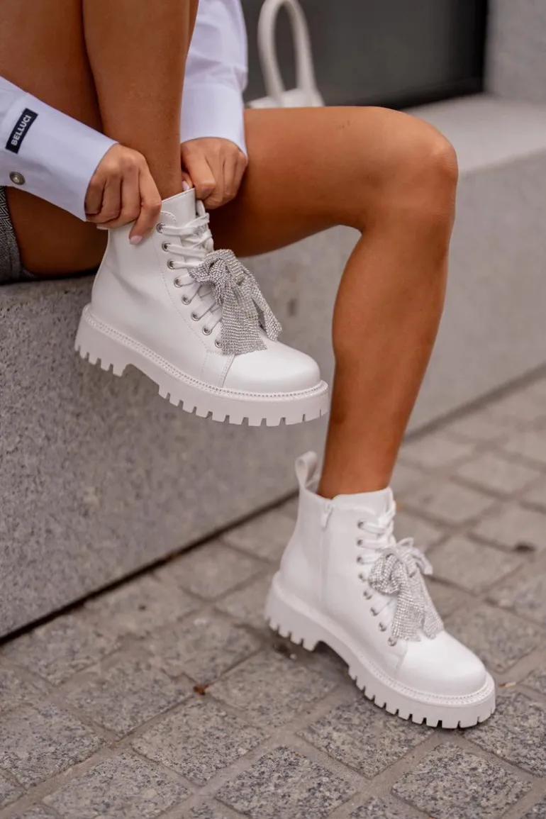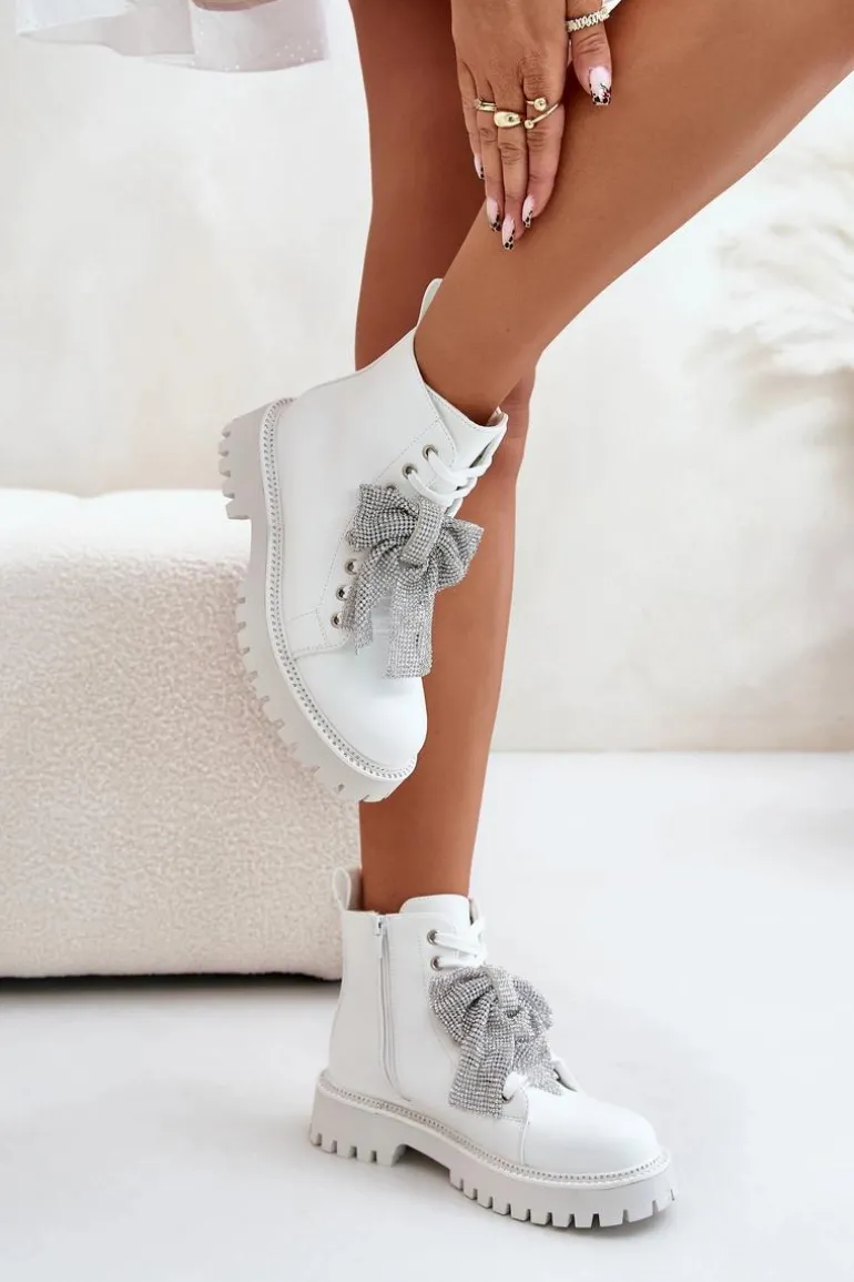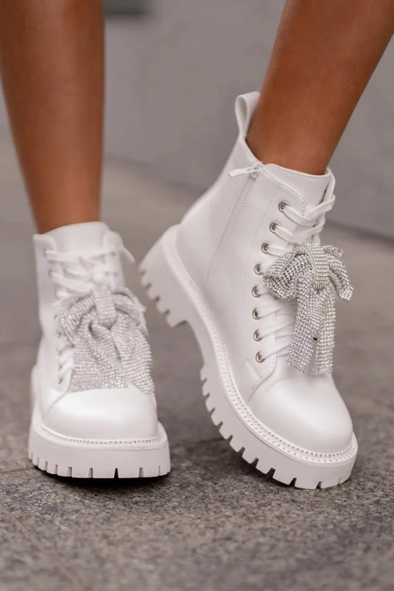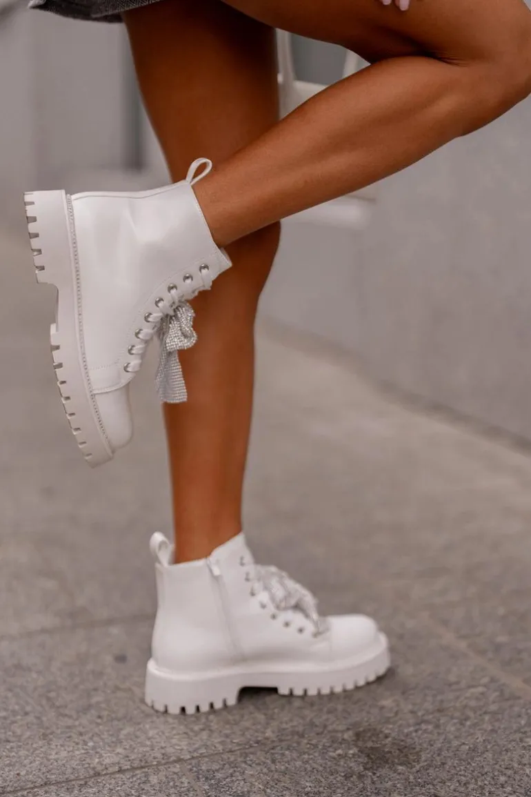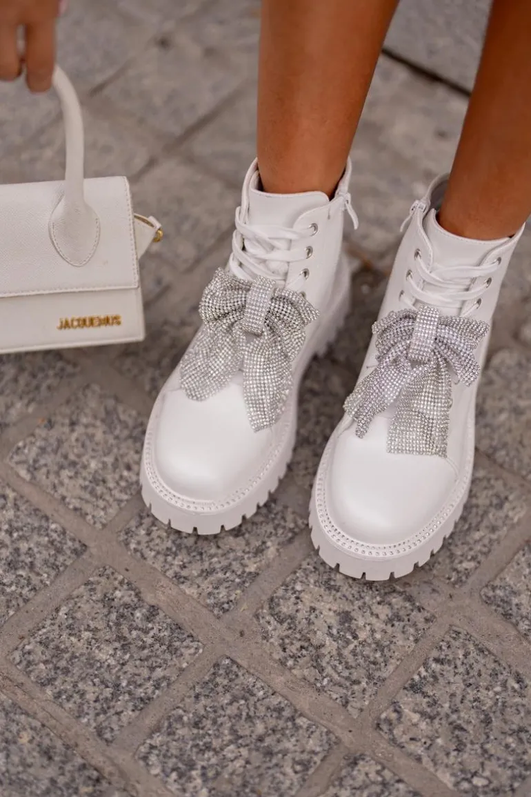Botki na płaskim obcasie łączą w sobie wygodę i styl, idealnie wpisując się w codzienne i wyjątkowe stylizacje. Zaokrąglone noski nadają im klasyczny wygląd. Zapięcie na zamek ułatwia szybkie zakładanie, a dodatkowe sznurowanie pozwala na idealne dopasowanie do stopy. Główną zaletą tego modelu jest kokarda z cyrkoniami umieszczona z przodu, która dodaje eleganckiego i kobiecego akcentu, przyciągając wzrok i podkreślając wyjątkowość tego obuwia. Przy wyborze rozmiaru prosimy sugerować się tabelą rozmiarów.