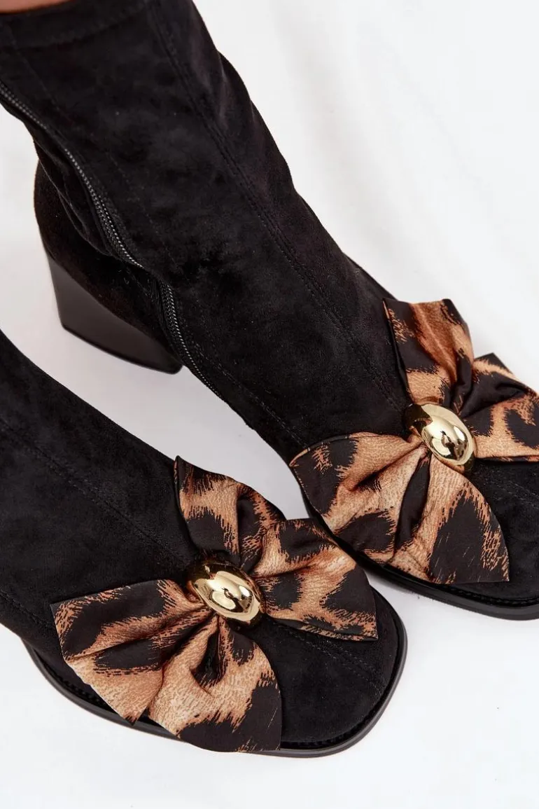 Botki damskie wykonane z miękkiego eko zamszu to połączenie elegancji i kobiecego stylu. Model osadzony na stabilnym obcasie typu klocek zapewnia wygodę podczas codziennego noszenia. Uwagę przyciąga ozdobna kokarda ze złotym elementem z przodu, która dodaje wyjątkowego uroku. Zamek z boku ułatwia zakładanie i zdejmowanie, a zaokrąglone noski nadają całości subtelnego, klasycznego wyglądu. To stylowe botki, które doskonale dopełnią zarówno eleganckie, jak i codzienne stylizacje. Przy wyborze rozmiaru prosimy sugerować się tabelą rozmiarów.