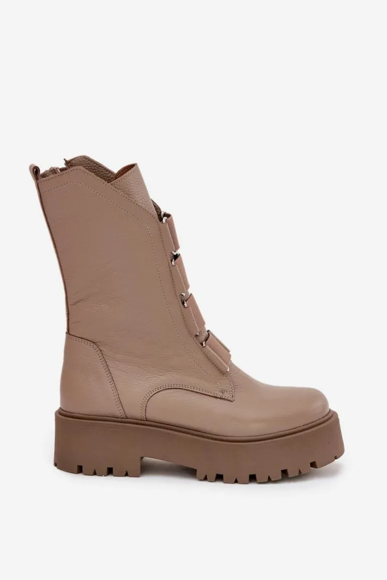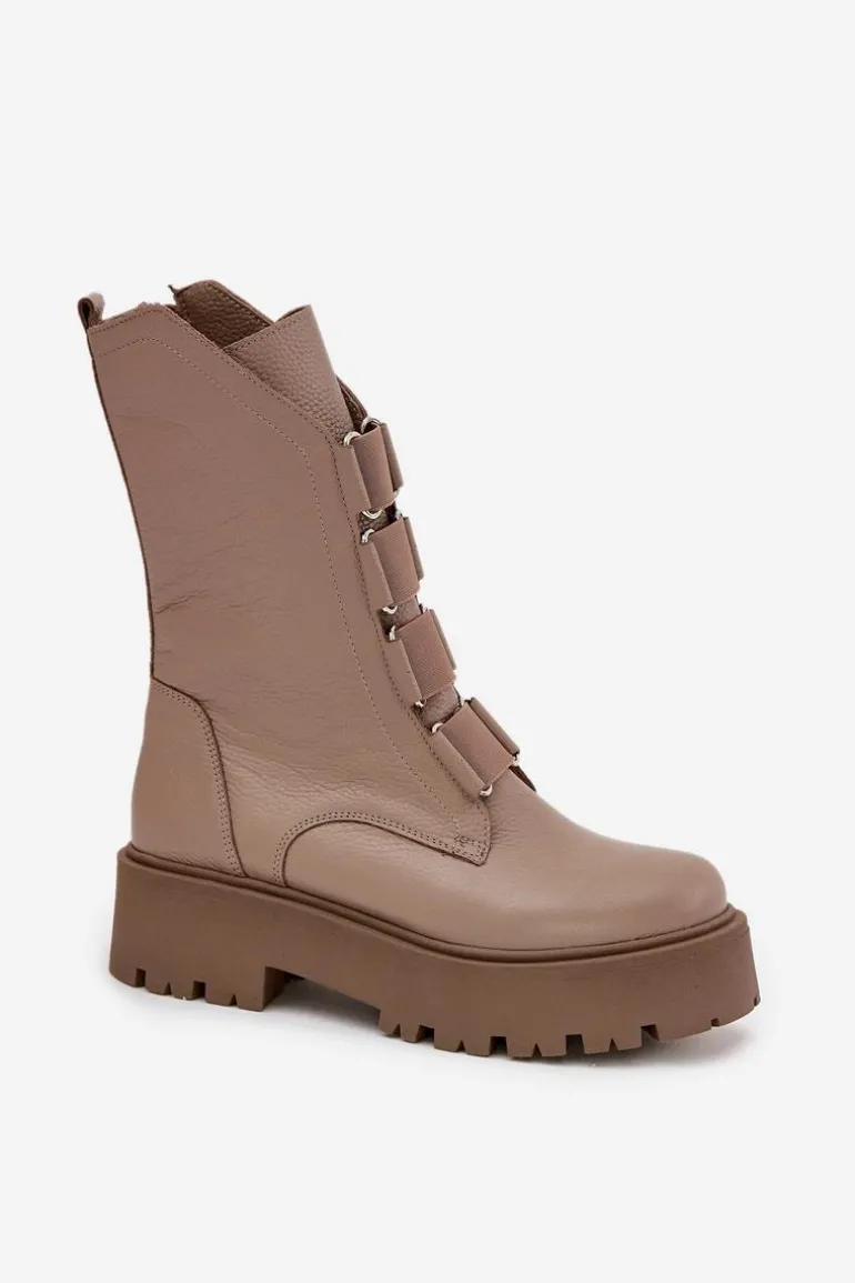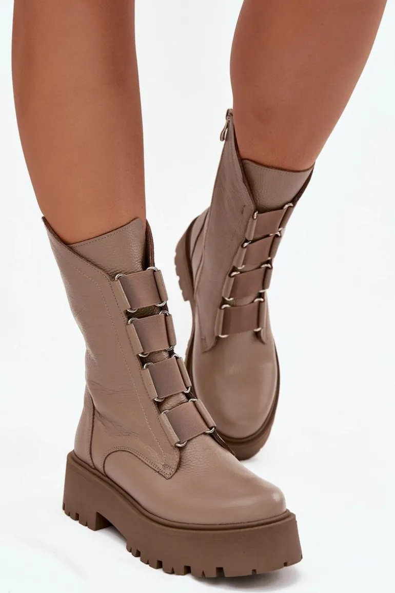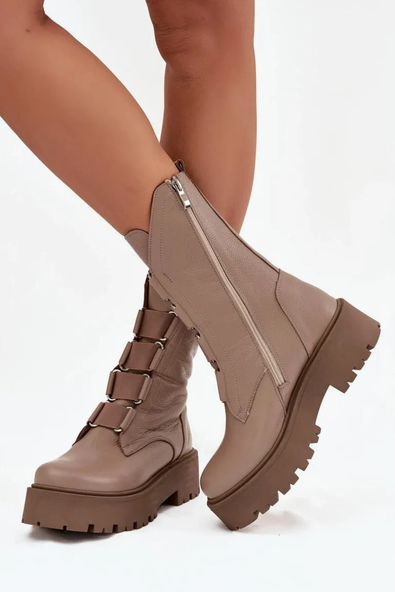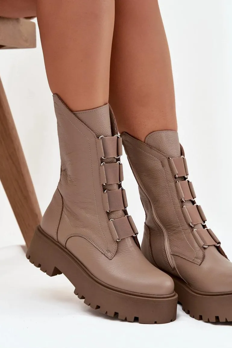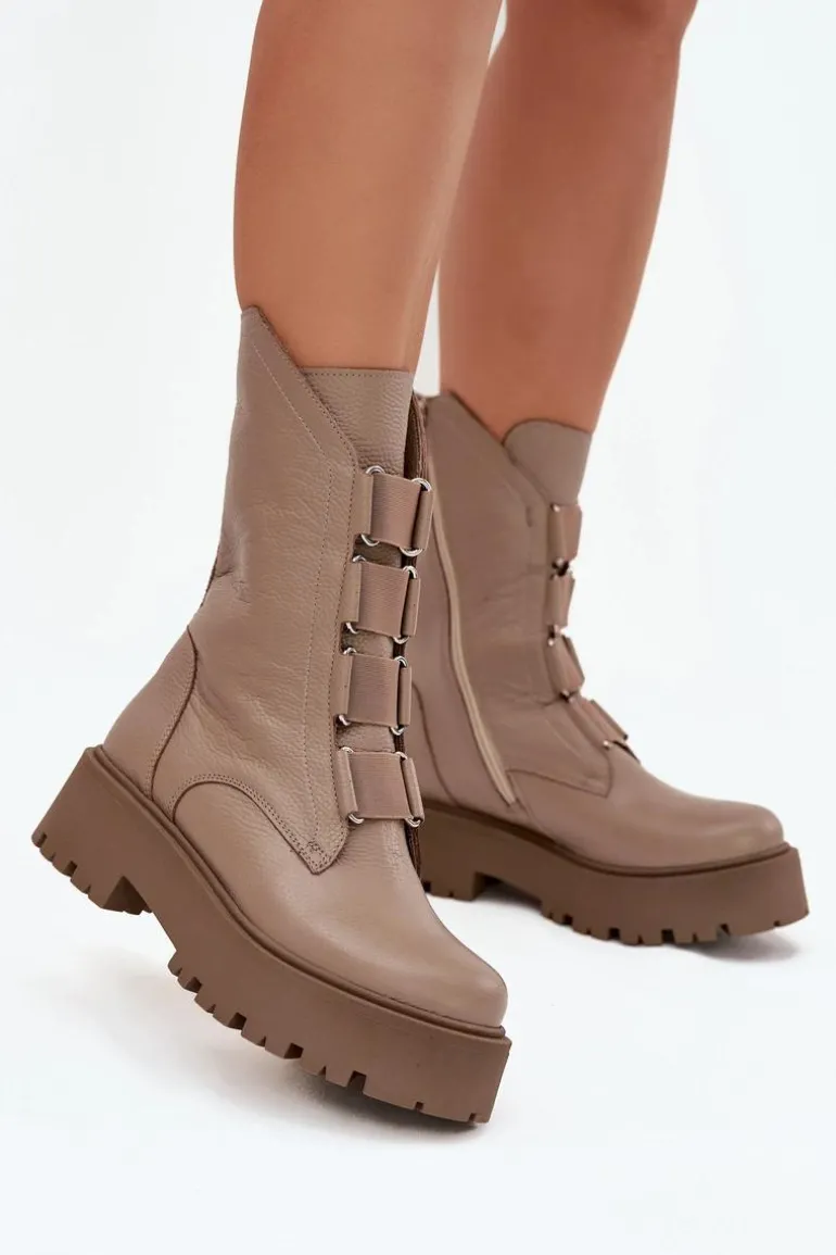 Botki damskie wykonane z naturalnej skóry to propozycja, która łączy w sobie elegancję z nutą nowoczesności. Skóra naturalna gwarantuje trwałość, wysoką jakość oraz komfort noszenia, a jednocześnie prezentuje się bardzo stylowo i ponadczasowo. Model został osadzony na solidnej platformie, która nie tylko dodaje kilku centymetrów wzrostu, ale także zapewnia stabilność i wygodę podczas codziennego użytkowania. Zapięcie na praktyczny zamek ułatwia zakładanie i zdejmowanie obuwia, czyniąc je wyjątkowo funkcjonalnym. Z przodu uwagę przyciągają cztery elastyczne paski, które pełnią zarówno rolę ozdobną, jak i praktyczną, delikatnie dopasowując buty do stopy i nadając całości nowoczesnego charakteru. To botki świetnie sprawdzą się zarówno w casualowych, jak i bardziej wyrazistych stylizacjach. Przy wyborze rozmiaru prosimy sugerować się tabelą rozmiarów.