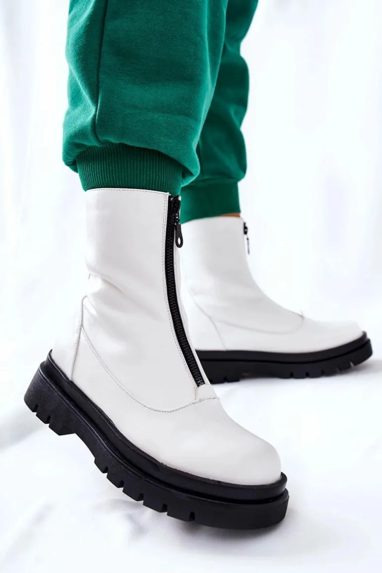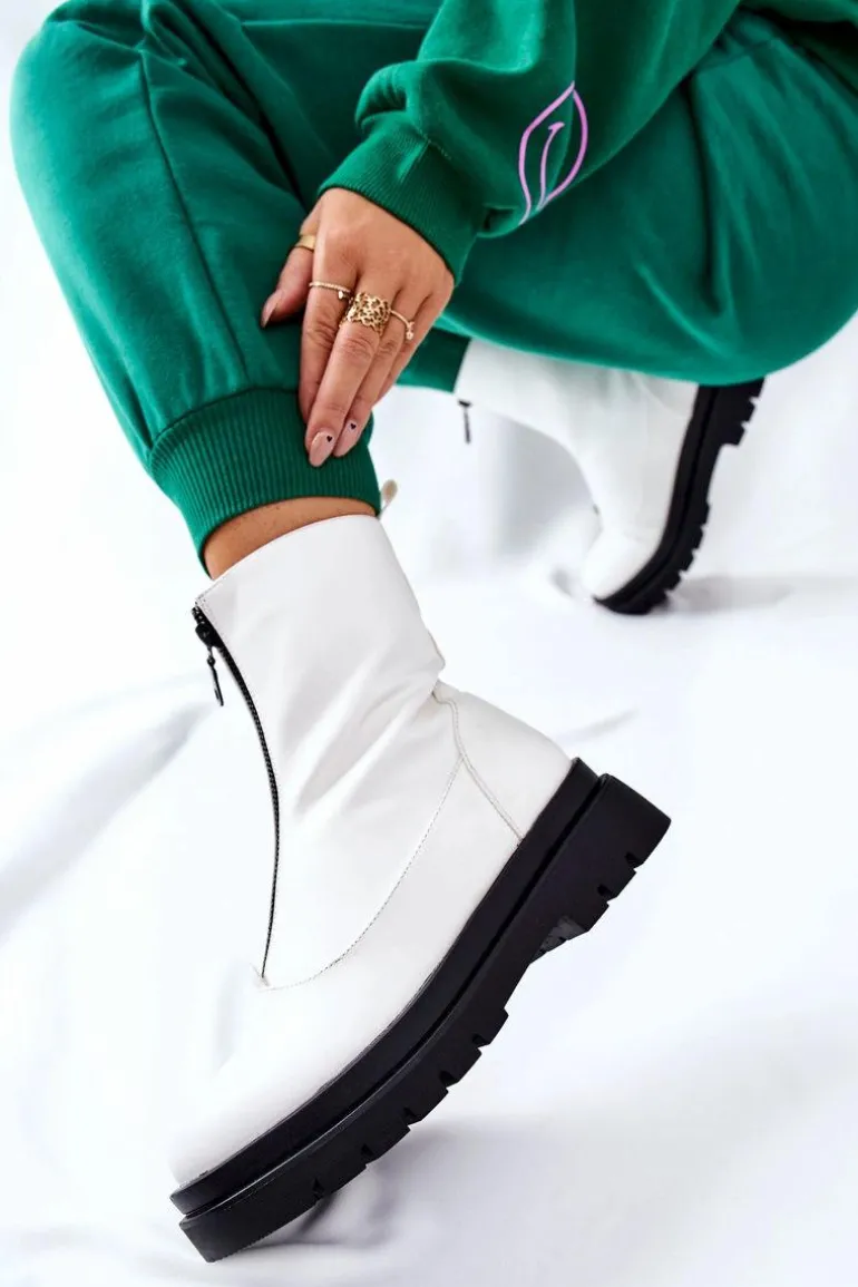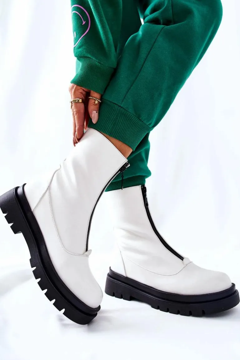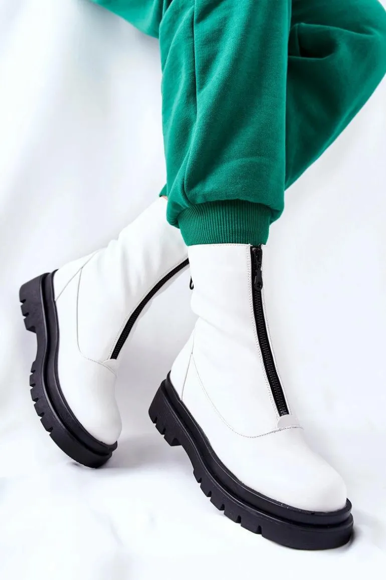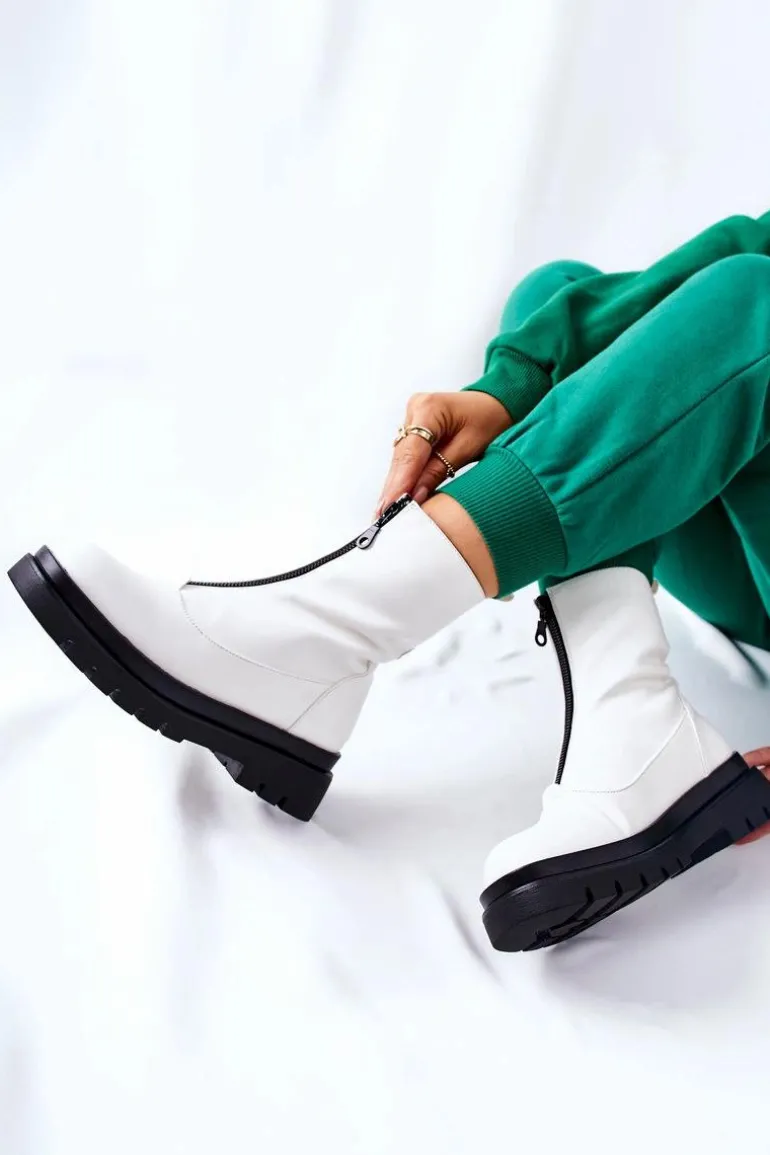 Botki wykonane z ekoskóry. Posiadają suwak na przodzie cholewki, dzięki czemu są wygodne w zakładaniu. Dopasowana cholewka podkreśli Twoje nogi. Przyjemny w dotyku koc obuwniczy przyda się na zimne, jesienne dni.Przy wyborze rozmiaru prosimy sugerować się tabelą rozmiarów.