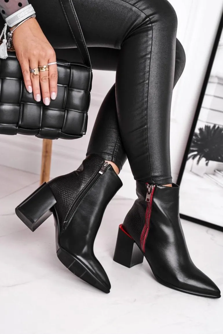 Klasyczne botki w pięknym fasonie. Botki osadzone na średniej wysokości zdobionym słupku. Buty w całości wykonane ze skóry ekologicznej, gładkiej oraz ze zwierzęcym printem. Na zewnętrznej części cholewki znajduje się duży suwak z czerwonym akcentem, który jest pięknym dodatkiem. Drugi suwak natomiast ułatwi nam zakładanie. Wnętrze pokryte kocem obuwniczym, dającym nam ciepło w chłodniejsze dni. Przy wyborze rozmiaru prosimy sugerować się tabelą rozmiarów.