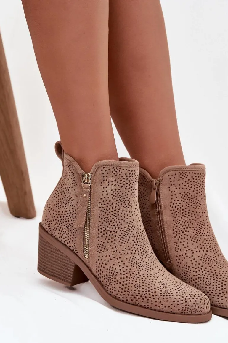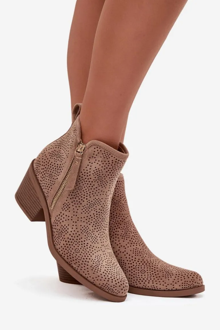 Botki damskie w stylu kowbojek od marki S.Barski. Wykonane z wysokiej jakości materiałów, prezentują się elegancko i przyciągają wzrok detalami. Model został osadzony na stabilnym, ściętym obcasie typu słupek, który zapewnia komfort i wygodę podczas chodzenia, a jednocześnie subtelnie wysmukla sylwetkę. Migdałowe noski nadają butom kobiecego charakteru, podkreślając zgrabną linię stopy. Botki posiadają praktyczne zapięcie na zamek, które ułatwia ich zakładanie i zdejmowanie, a dodatkowy, ozdobny zamek pełni funkcję stylowego detalu, nadając całemu modelowi nowoczesnego i oryginalnego wyglądu. To idealne obuwie do casualowych stylizacji, jak i do outfitów inspirowanych modą boho.