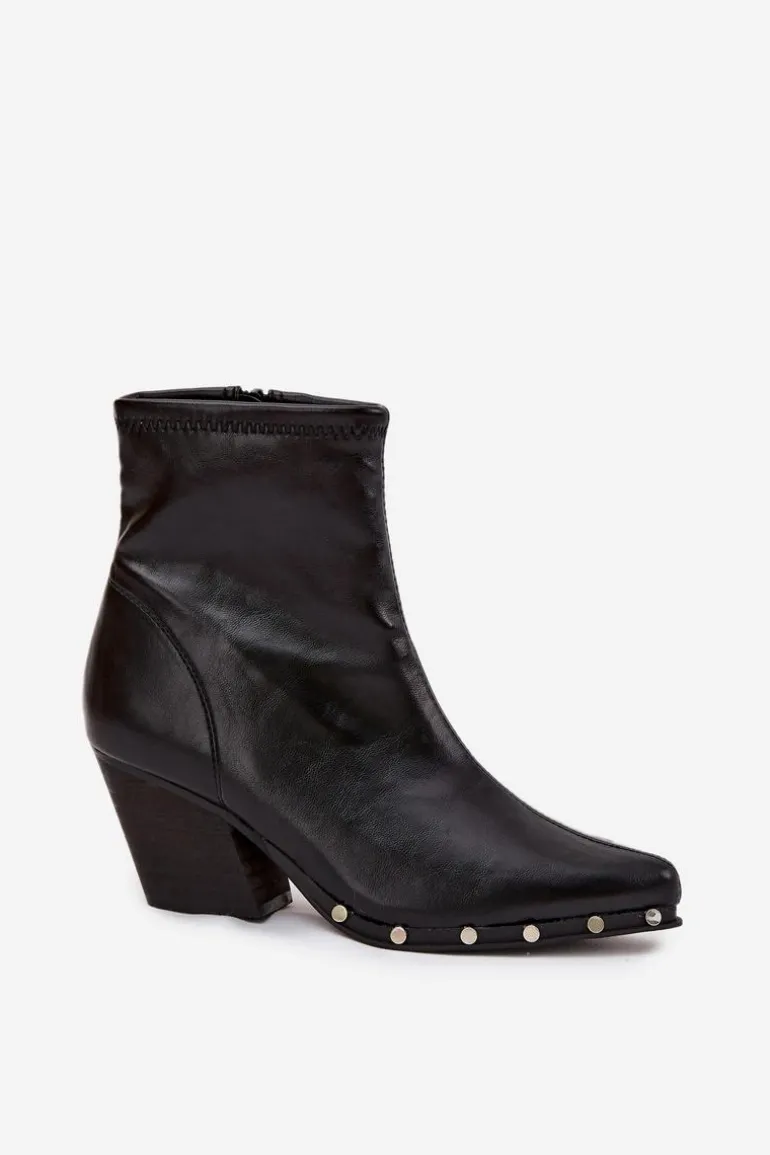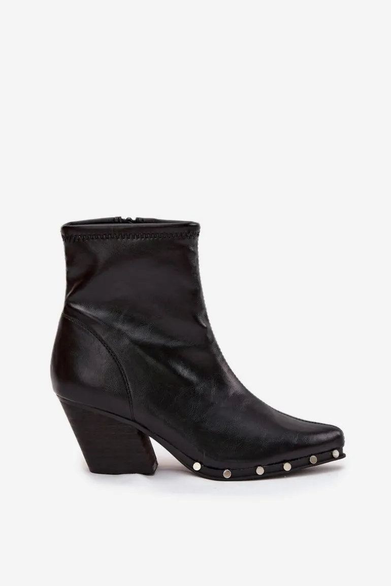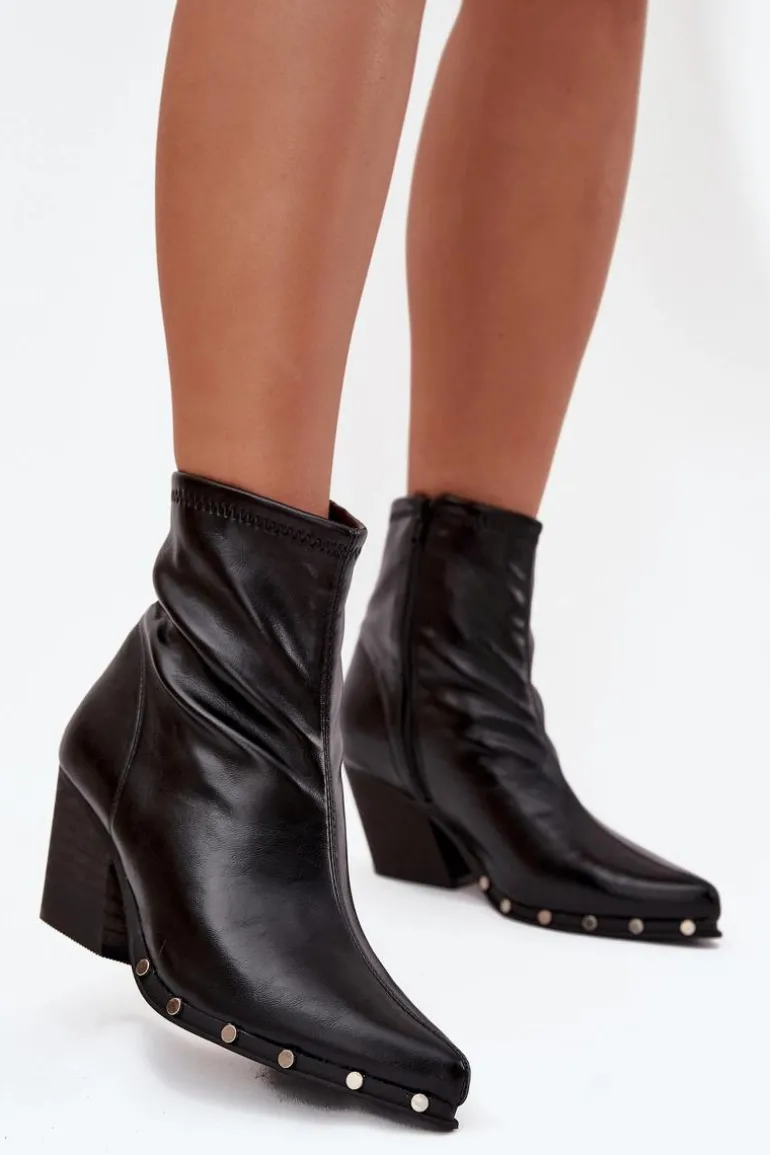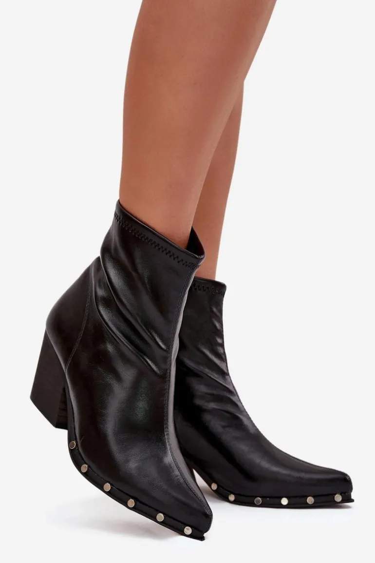 Botki kowbojki damskie wykonane z eko skóry to idealne połączenie klasycznego fasonu z nowoczesnym wykończeniem. Charakterystyczne szpiczaste noski i ścięty obcas typu słupek nadają im westernowego charakteru, a jednocześnie pięknie wysmuklają sylwetkę. Stabilny obcas zapewnia komfort podczas noszenia, dzięki czemu buty sprawdzają się na co dzień. Model zapinany jest na praktyczny zamek, co ułatwia zakładanie i zdejmowanie. Ozdobne ćwieki przy podeszwie stanowią wyrazisty detal, który przyciąga uwagę i dodaje całości nieco rockowego pazura. To wyjątkowe botki, które świetnie sprawdzą się w zestawieniach z jeansami i ramoneską, ale też z sukienką, tworząc modny, kontrastowy look. Przy wyborze rozmiaru prosimy sugerować się tabelą rozmiarów.