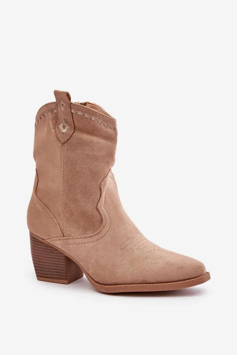 Botki damskie w stylu kowbojek. Wykonane z eko zamszu, to idealny wybór na chłodniejsze dni. Osadzone na stabilnym obcasie typu słupek, zapewniają komfort noszenia. Szpiczaste noski optycznie wysmuklają nogi, dodając sylwetce lekkości. Cholewka ozdobiona przeszyciami. Wnętrze ocieplone kocem obuwniczym gwarantuje ciepło, a suwak ułatwia zakładanie i zdejmowanie butów. Idealne do jesiennych stylizacji. Przy wyborze rozmiaru prosimy sugerować się tabelą rozmiarów.