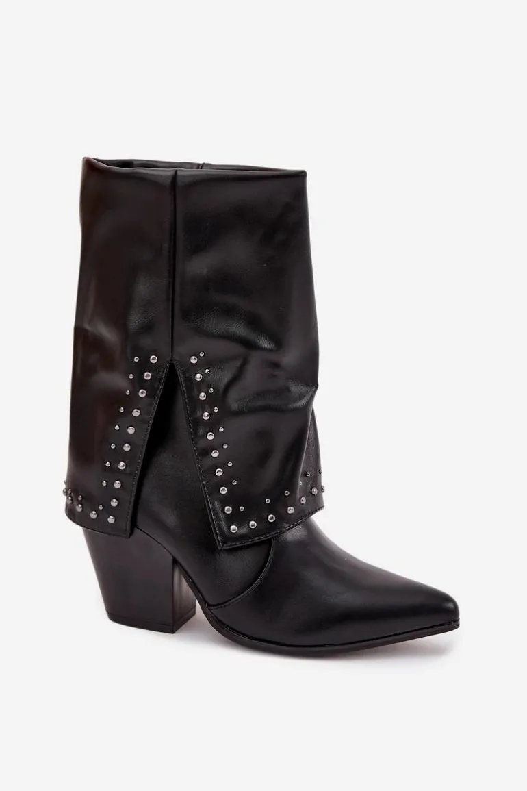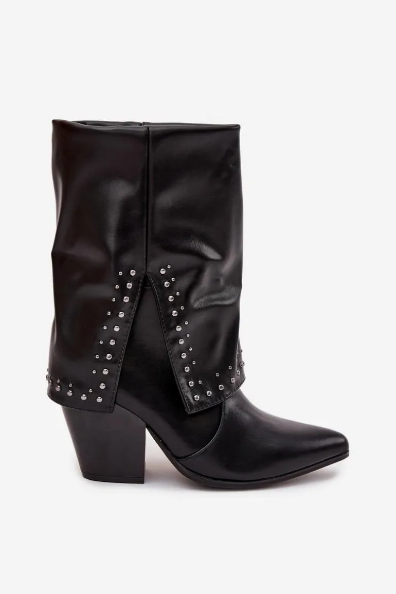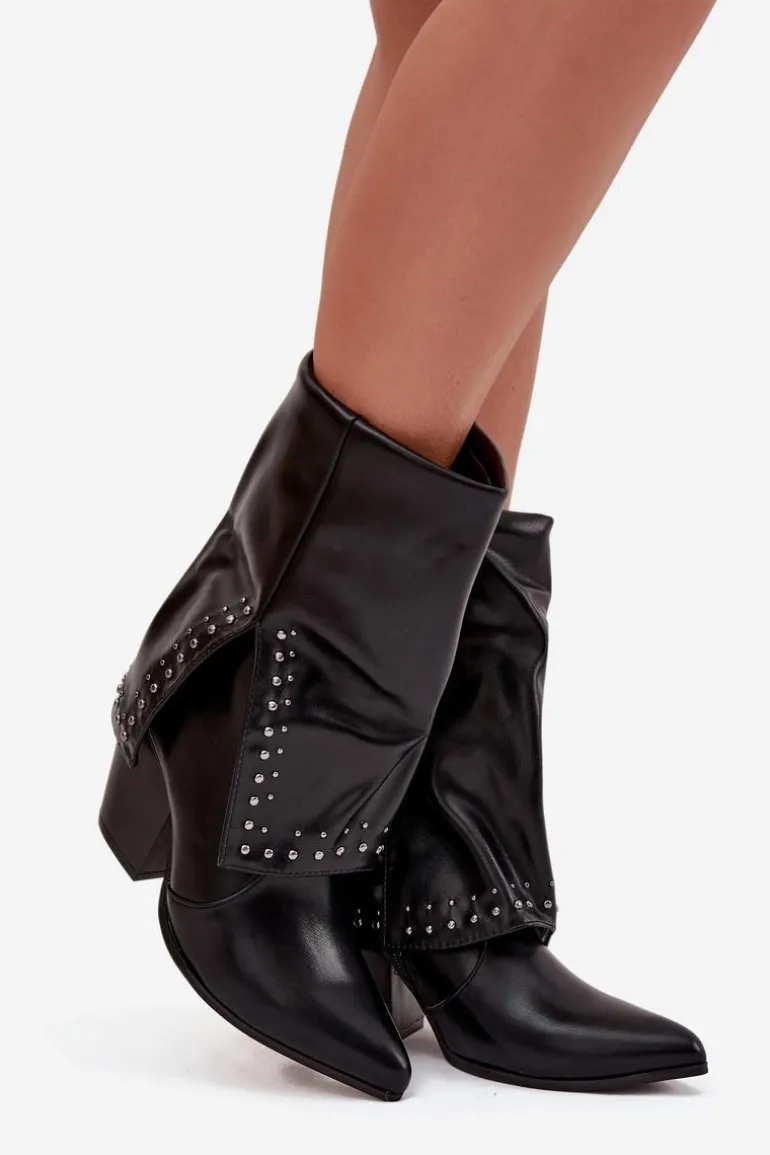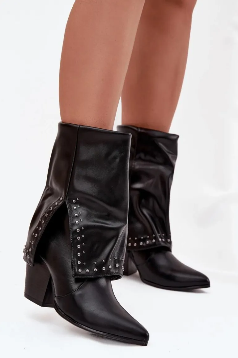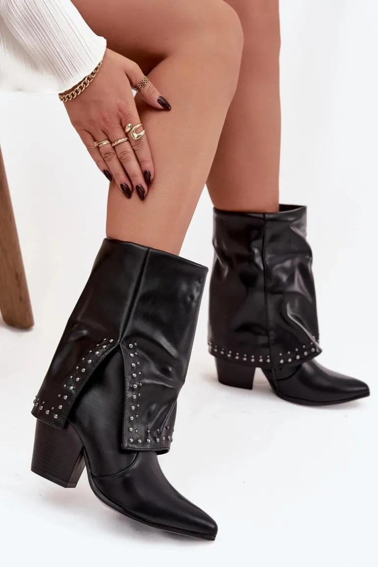 Botki damskie w stylu kowbojek, wykonane z eko skóry to modna propozycja na sezon jesienno-zimowy. Model osadzony został na stabilnym, ściętym obcasie typu słupek, który podkreśla charakter westernowego stylu. Wywinięta cholewka ze zdobieniem nadaje oryginalnego i stylowego wyglądu. Botki są wsuwane, a dodatkowy suwak ułatwia zakładanie i zdejmowanie. Wnętrze ocieplone pianką pokrytą tkaniną zapewnia komfort i ciepło w chłodniejsze dni. To wyjątkowy model, który łączy wygodę z ponadczasowym stylem – idealny zarówno do jeansów, jak i do sukienek w stylu boho.