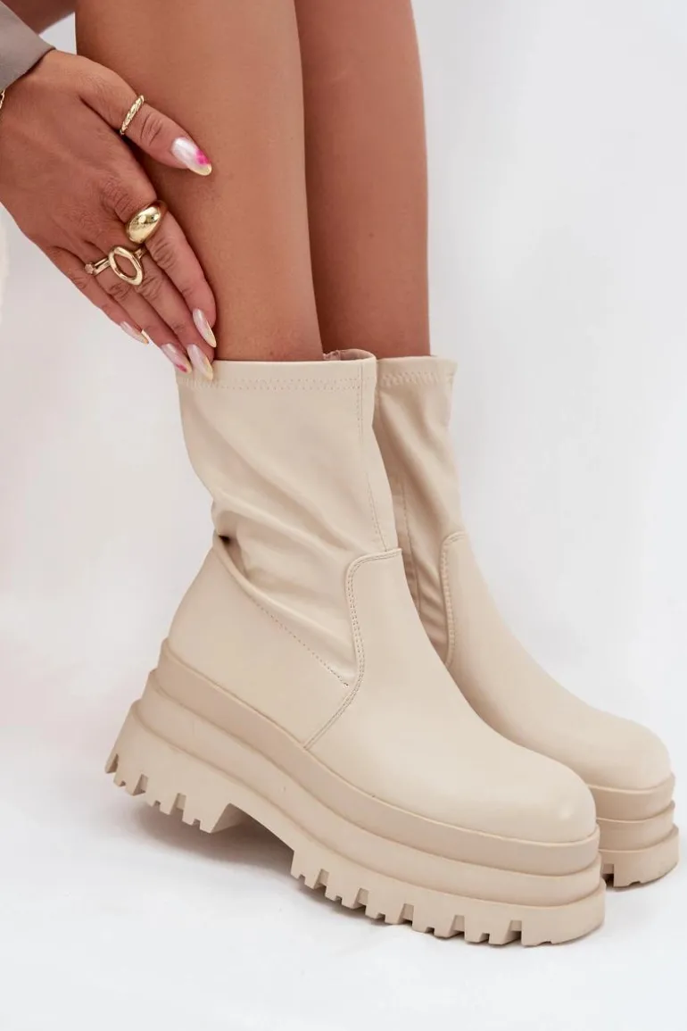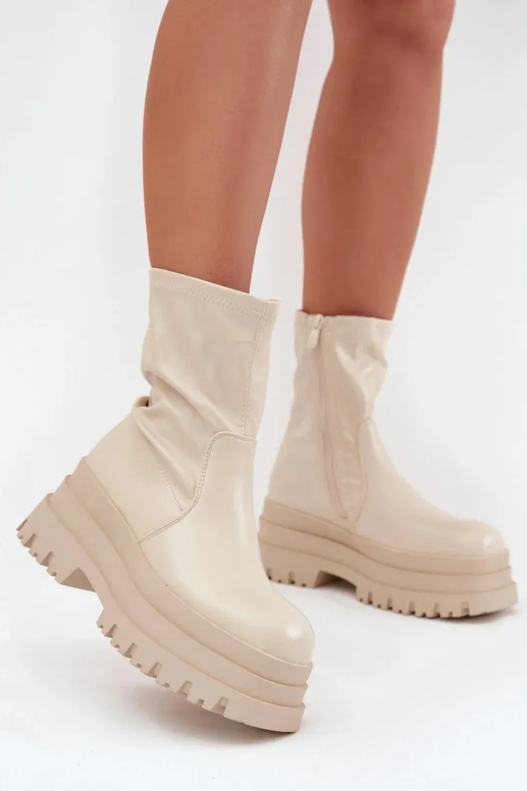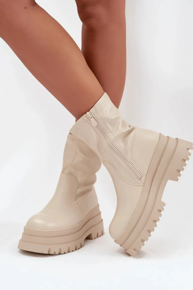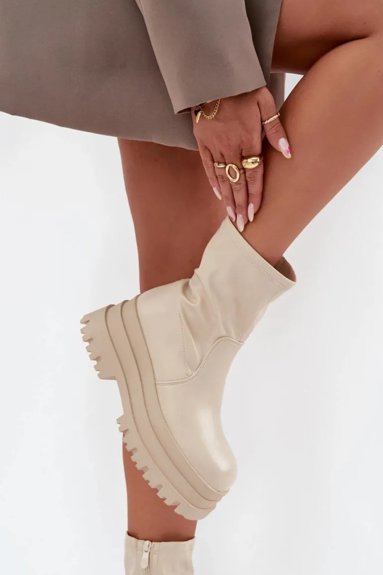 Botki damskie z eko skóry to doskonała propozycja na chłodniejsze dni. Osadzone na masywnej platformie, zapewniają stabilność i dodatkową wysokość. Zapinane na zamek, ułatwiają zakładanie, a zaokrąglone noski dodają im subtelnego charakteru. Wnętrze ocieplone kocem obuwniczym tylko na wysokości stopy gwarantuje ciepło, a jednocześnie pozwala na swobodę ruchu. Koniecznie powinnaś je mieć w swojej jesienno-zimowej szafie! Przy wyborze rozmiaru prosimy sugerować się tabelą rozmiarów.
