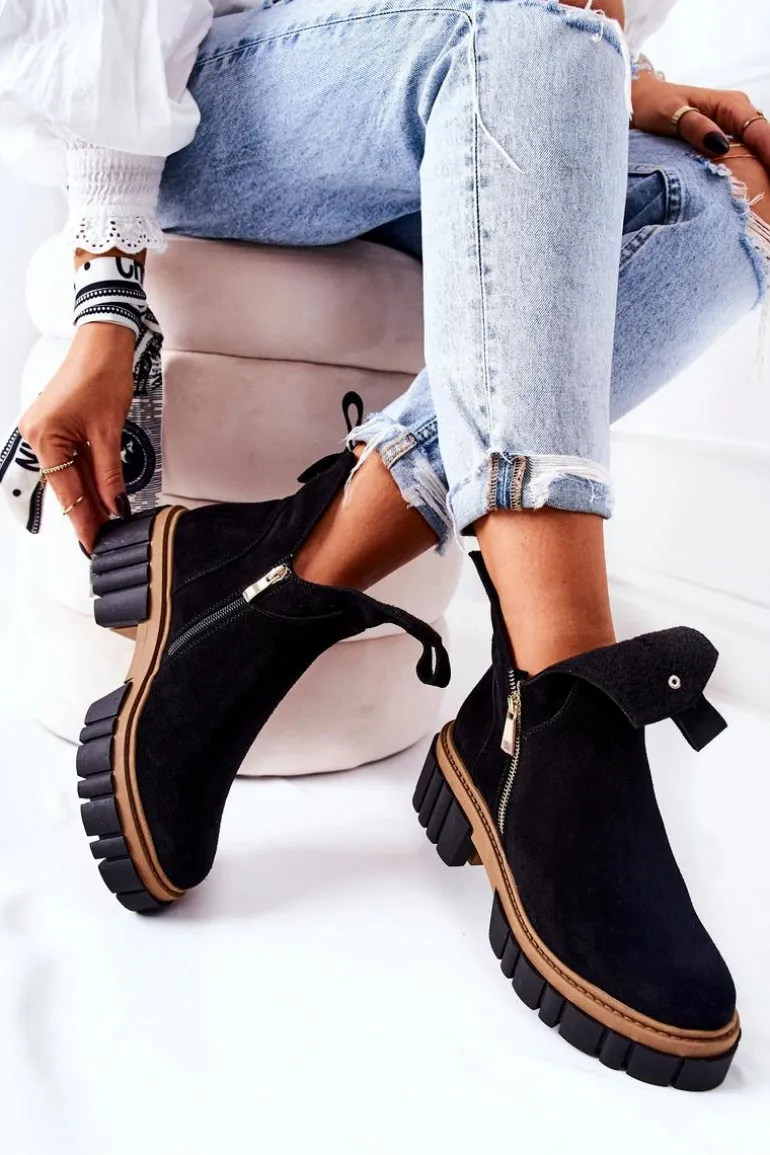Botki z wycięciem wyglądają niezwykle modnie i stylowo. Wykonane zostały z naturalnego zamszu. Środek jest ocieplany kocem obuwniczym. Zapinane z obu stron na dwa suwaki. Botki będą pasować na wiele okazji. Podeszwa oraz masywny obcas zapewnią stabilność. Koniecznie musisz je mieć! Nie czekaj aż znikną!Przy wyborze rozmiaru prosimy sugerować się tabelą rozmiarów.