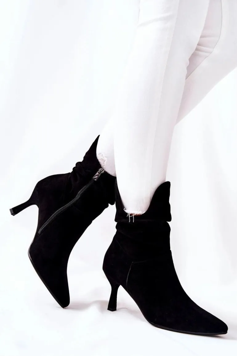 Botki świetnie sprawdzą się podczas tworzenia stylizacji w chłodniejsze dni. Botki na boku posiadają suwak ułatwiający zakładanie. W całości wykonane ze skóry zamszowej. Komfort noszenia oraz wysoka jakość wykonania są atutem tych botków. Posiadają w środku delikatny koc obuwniczy. Marszczona cholewka sprawia, że wyglądają wyjątkowo! Przy wyborze rozmiaru prosimy sugerować się tabelą rozmiarów.