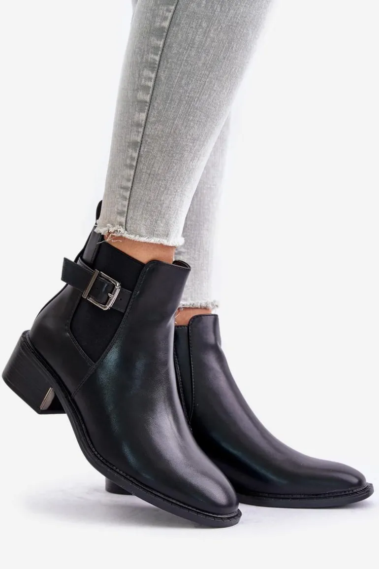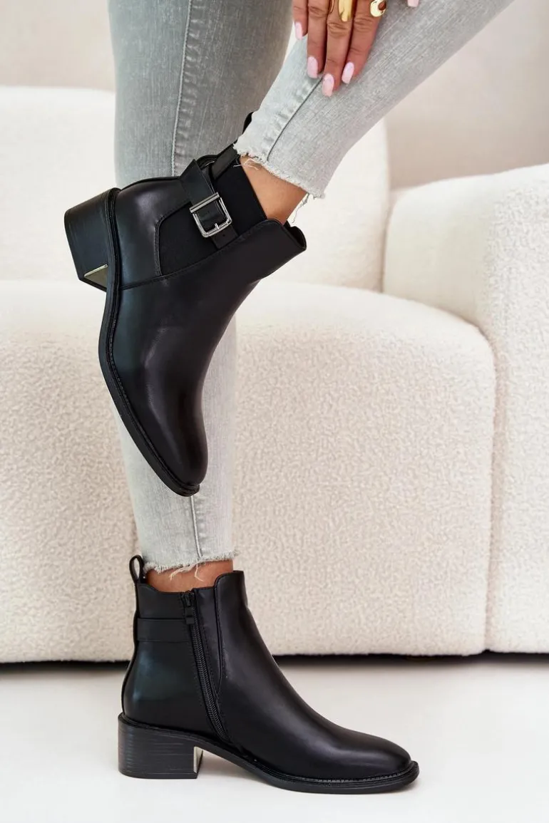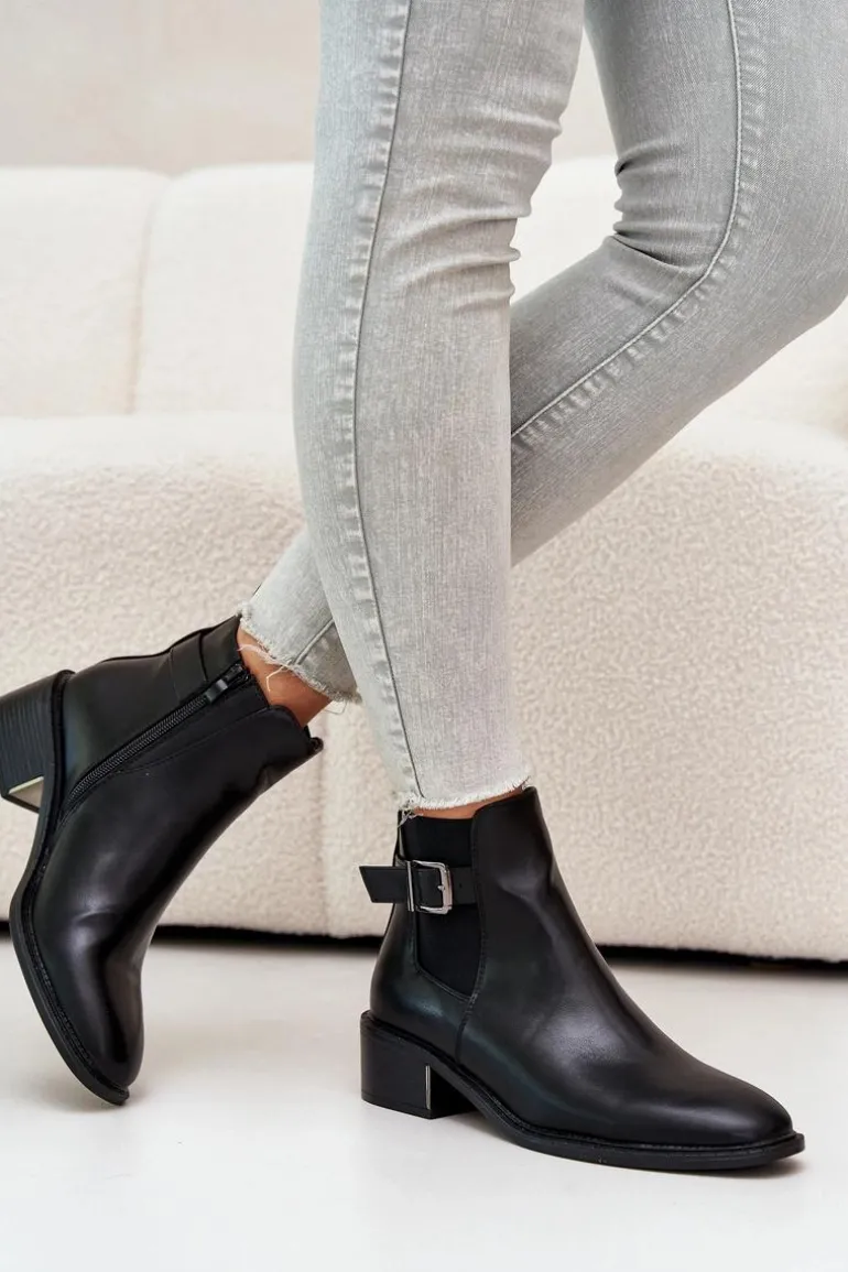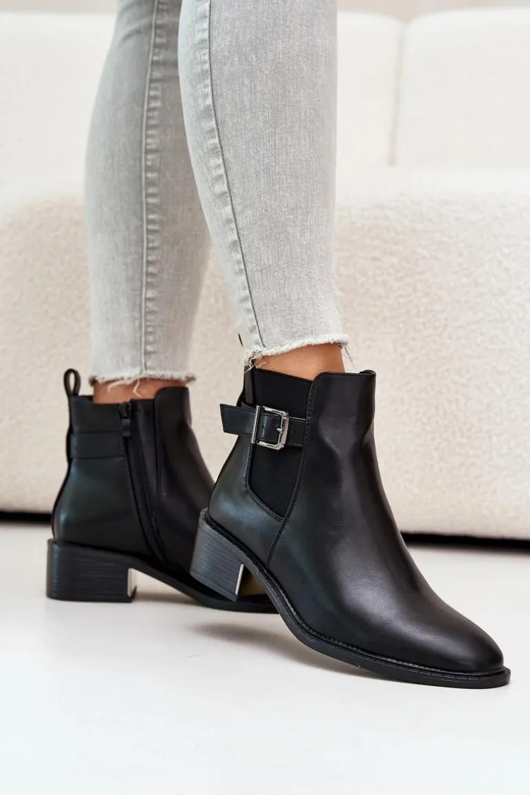 Botki damskie wykonane z eko skóry. Osadzone na niskim obcasie. Środek ocieplony kocem obuwniczym, co zapewni ciepło w chłodniejsze dni. Noski zaokrąglone. Zapinane na zamek. Na cholewce pasek ze złotą klamrą. Klasyczny fason sprawia, że możesz dopasować je do wielu stylizacji! Przy wyborze rozmiaru prosimy sugerować się tabelą rozmiarów.