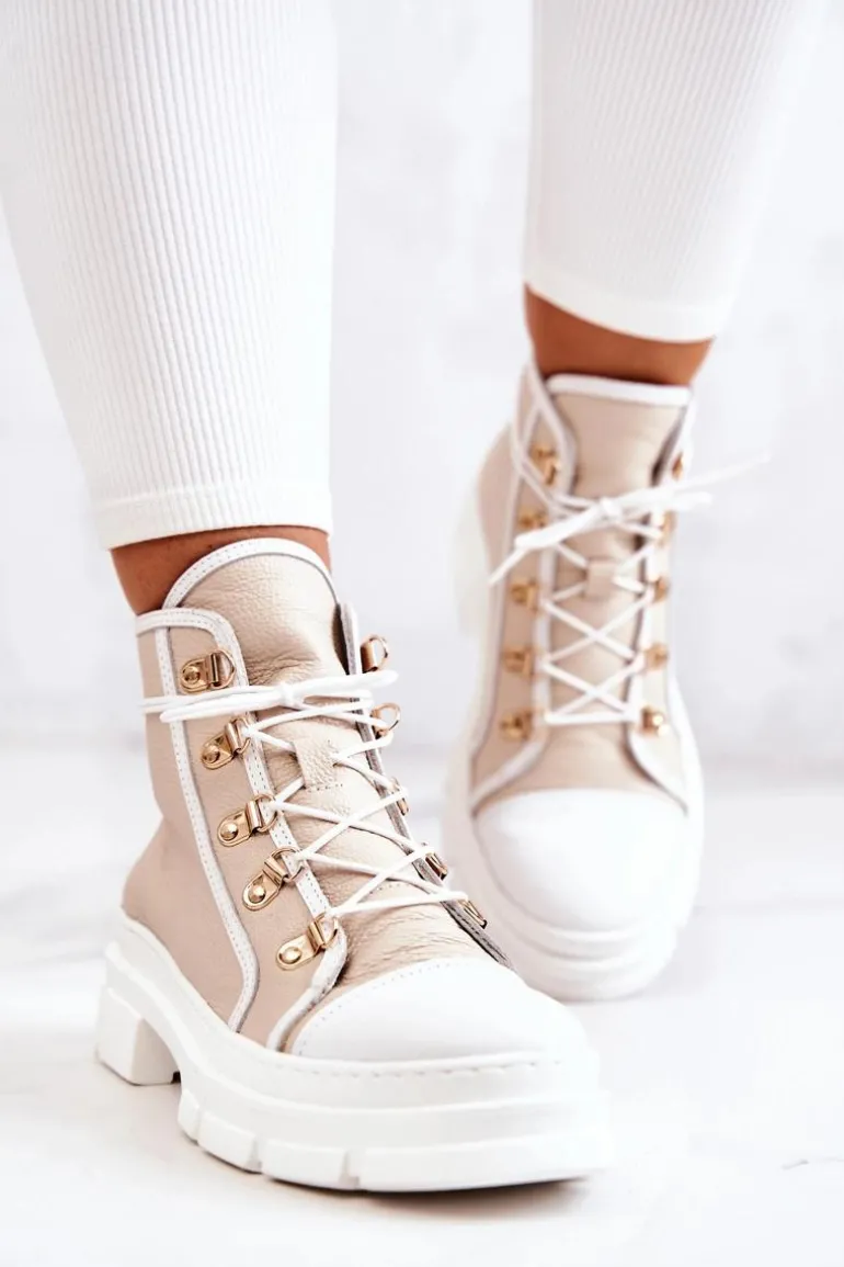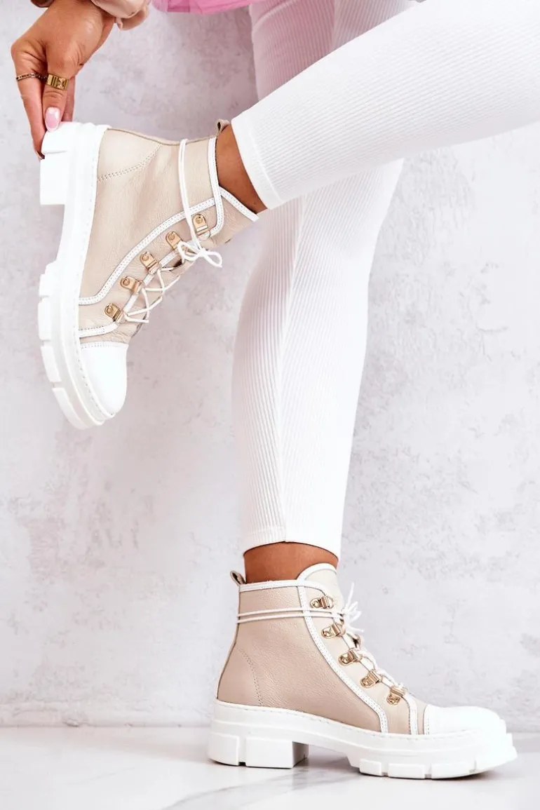Botki zostały wykonane z naturalnej skóry. Posiadają klasyczne wiązanie umożliwiające dopasowanie buta do tęgości nogi. Grubsza podeszwa świetnie odizoluje od zimnego podłoża. Wkładka wykonana z naturalnej skóry. Pięknie prezentują się na nodze! Koniecznie musisz je mieć! Przy wyborze rozmiaru prosimy sugerować się tabelą rozmiarów.
