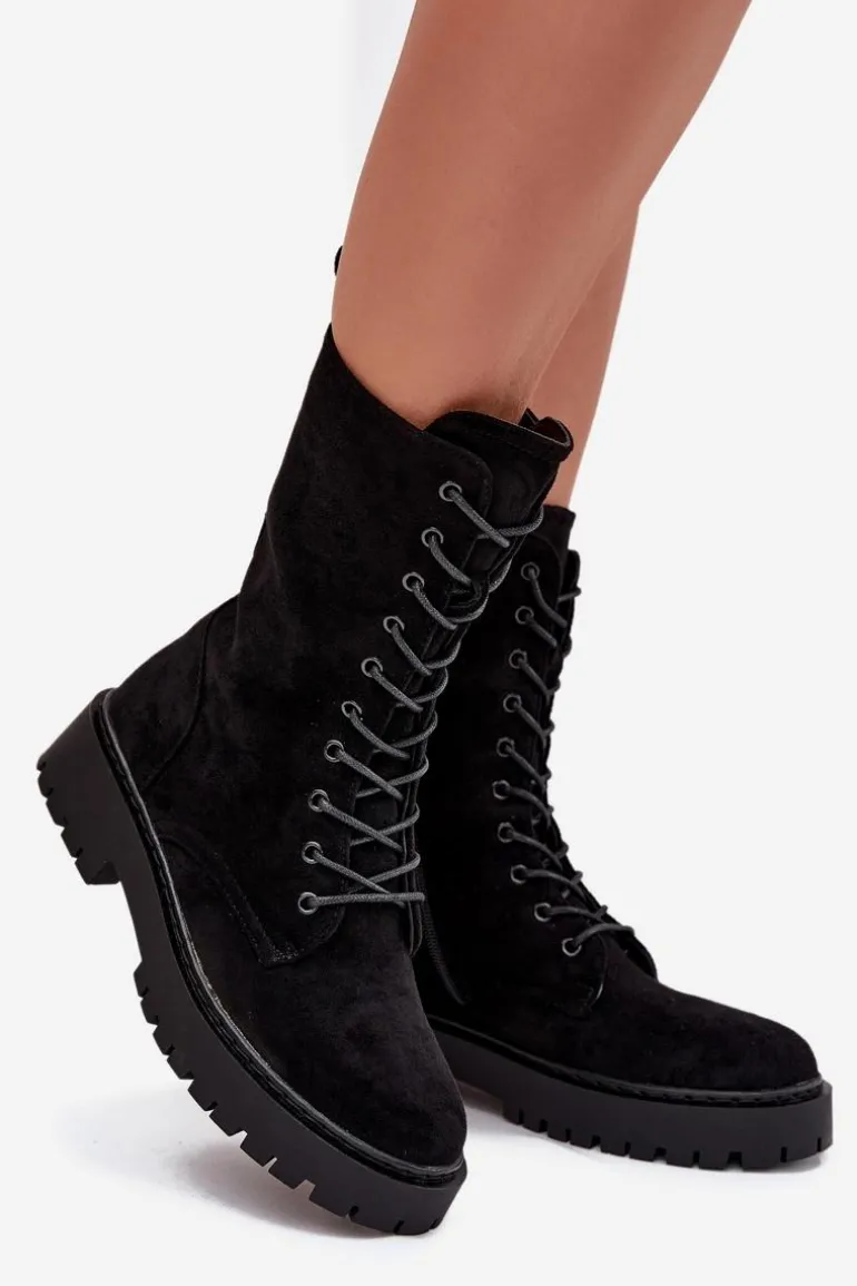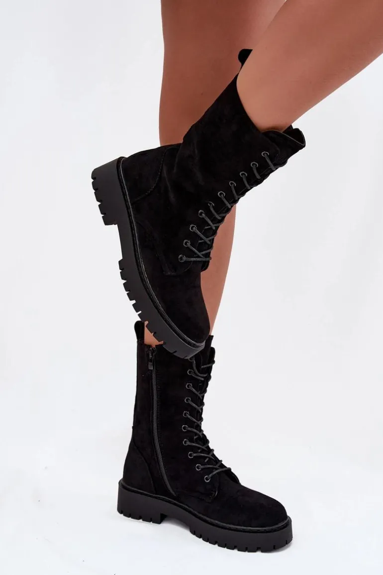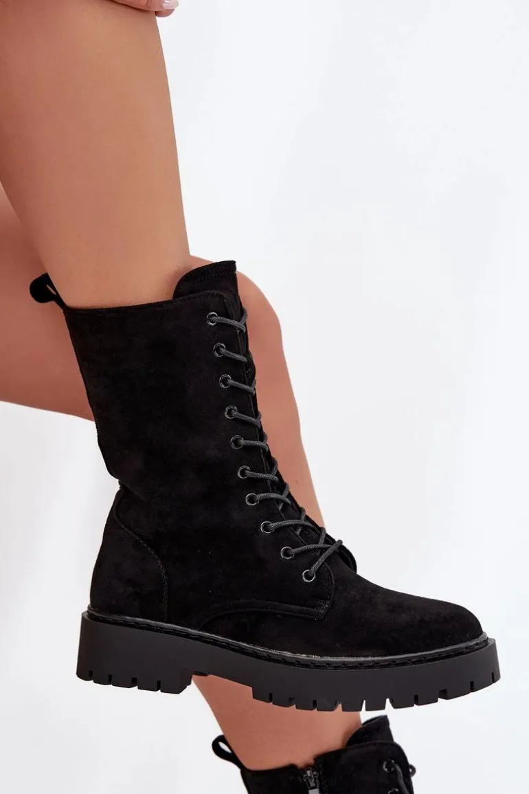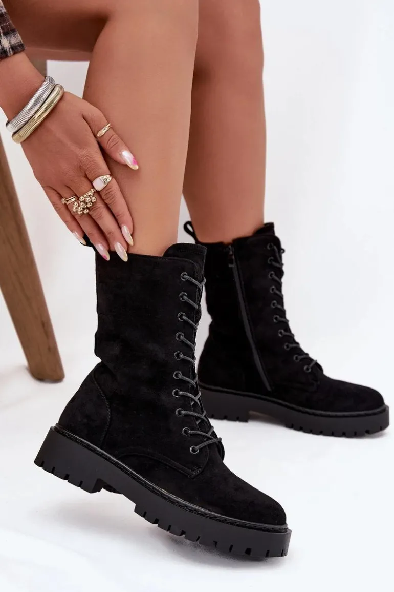 Klasyczne botki damskie typu workery wykonane z eko zamszu. Model osadzony na platformie z płaskim obcasem zapewnia stabilny krok, a ocieplenie gwarantuje komfort w chłodniejsze dni. Sznurowanie w połączeniu z zamkiem umożliwia łatwe zakładanie i idealne dopasowanie do stopy, co czyni je świetnym wyborem do codziennych, casualowych stylizacji. Przy wyborze rozmiaru prosimy sugerować się tabelą rozmiarów.