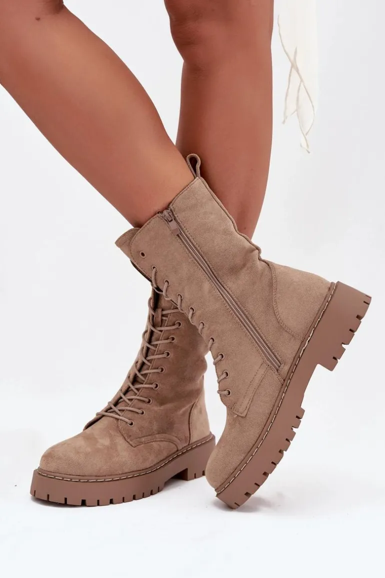 Klasyczne botki damskie typu workery wykonane z eko zamszu. Model osadzony na platformie z płaskim obcasem zapewnia stabilny krok, a ocieplenie gwarantuje komfort w chłodniejsze dni. Sznurowanie w połączeniu z zamkiem umożliwia łatwe zakładanie i idealne dopasowanie do stopy, co czyni je świetnym wyborem do codziennych, casualowych stylizacji. Przy wyborze rozmiaru prosimy sugerować się tabelą rozmiarów.