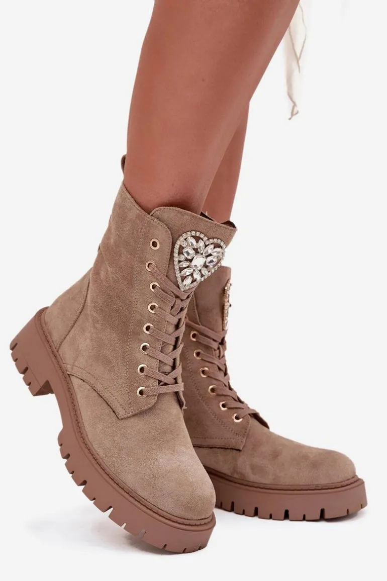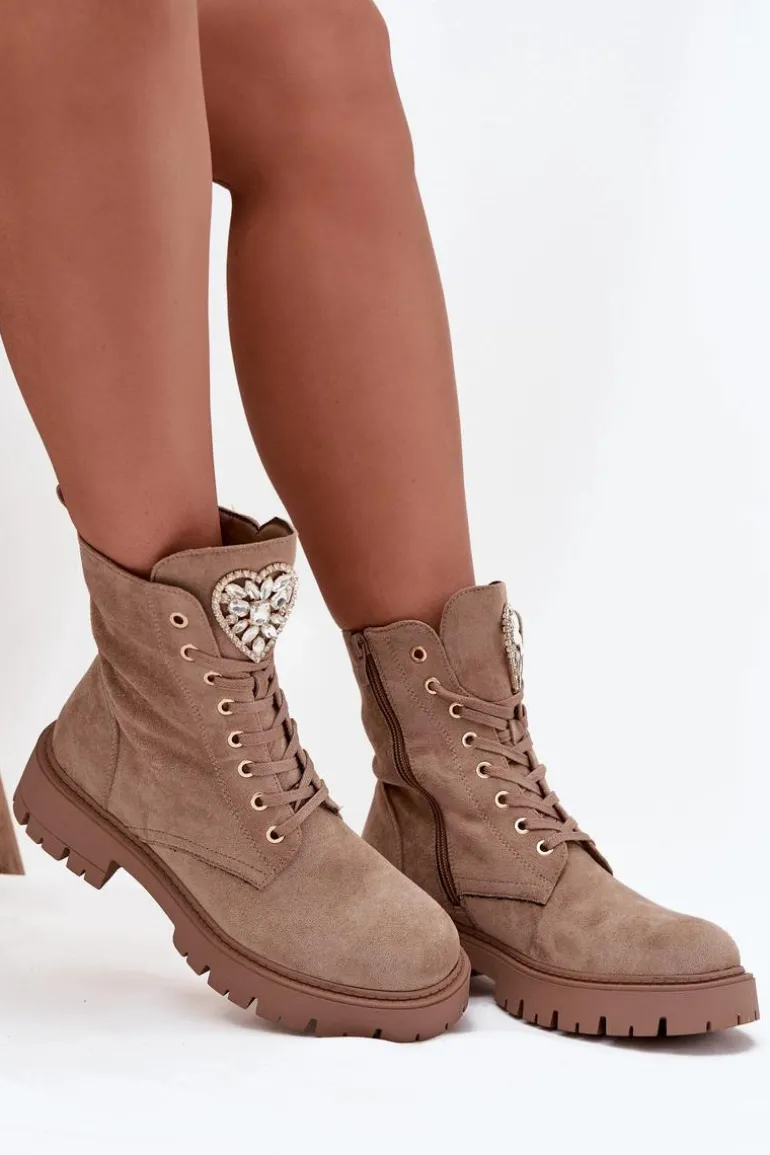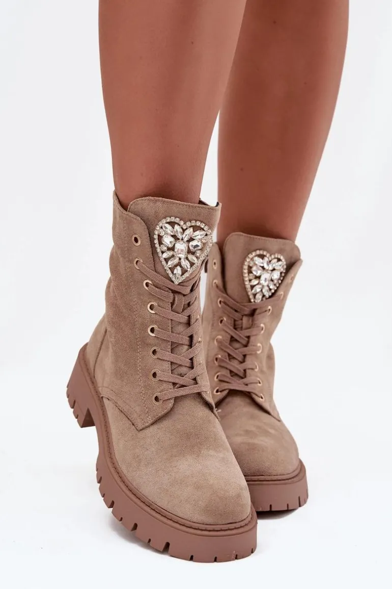 Botki damskie z eko zamszu to urocza propozycja łącząca wygodę z modnym detalem. Model sznurowany i zapinany na zamek zapewnia łatwe zakładanie i idealne dopasowanie do stopy, a ozdobne serce z kryształkami na języku dodaje subtelnego, kobiecego blasku, świetnie uzupełniając codzienne stylizacje. Przy wyborze rozmiaru prosimy sugerować się tabelą rozmiarów.