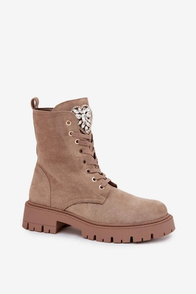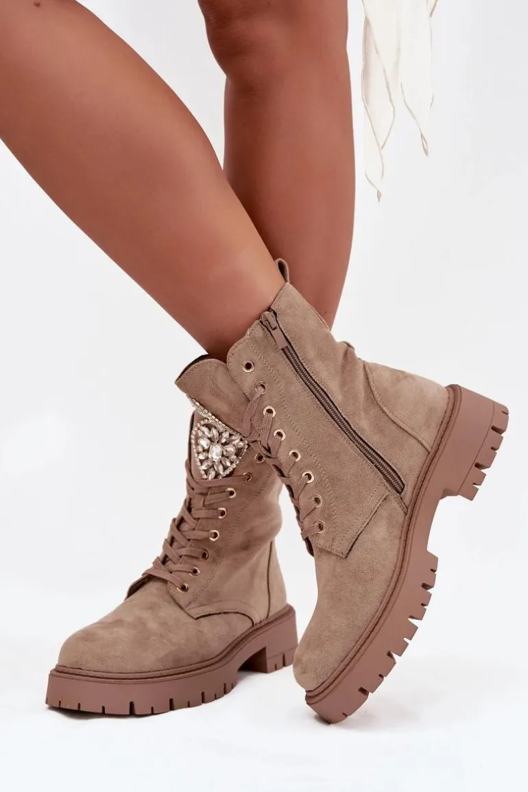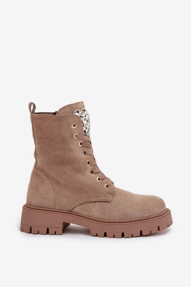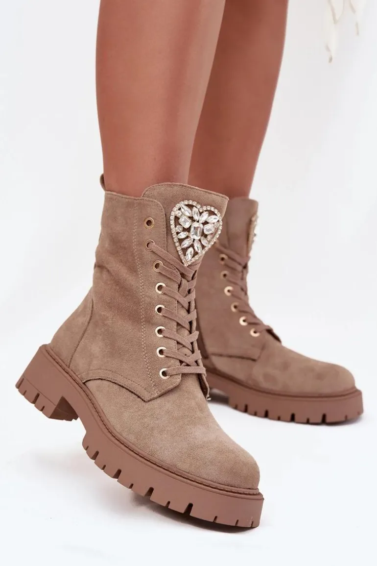 Botki damskie z eko zamszu to urocza propozycja łącząca wygodę z modnym detalem. Model sznurowany i zapinany na zamek zapewnia łatwe zakładanie i idealne dopasowanie do stopy, a ozdobne serce z kryształkami na języku dodaje subtelnego, kobiecego blasku, świetnie uzupełniając codzienne stylizacje. Przy wyborze rozmiaru prosimy sugerować się tabelą rozmiarów.