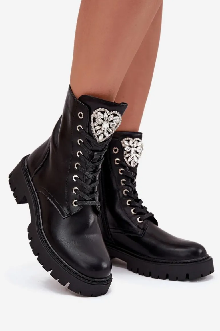 Botki damskie z eko skóry to urocza propozycja łącząca wygodę z modnym detalem. Model sznurowany i zapinany na zamek zapewnia łatwe zakładanie i idealne dopasowanie do stopy, a ozdobne serce z kryształkami na języku dodaje subtelnego, kobiecego blasku, świetnie uzupełniając codzienne stylizacje. Przy wyborze rozmiaru prosimy sugerować się tabelą rozmiarów.