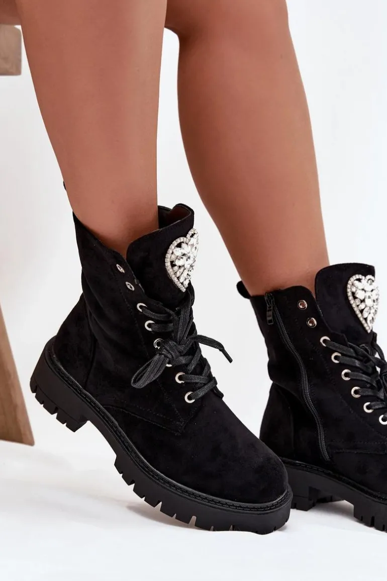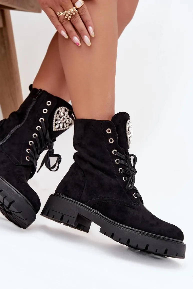 Botki damskie z eko zamszu to urocza propozycja łącząca wygodę z modnym detalem. Model sznurowany i zapinany na zamek zapewnia łatwe zakładanie i idealne dopasowanie do stopy, a ozdobne serce z kryształkami na języku dodaje subtelnego, kobiecego blasku, świetnie uzupełniając codzienne stylizacje. Przy wyborze rozmiaru prosimy sugerować się tabelą rozmiarów.