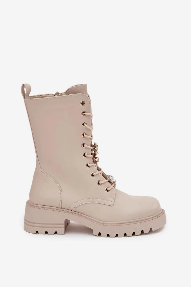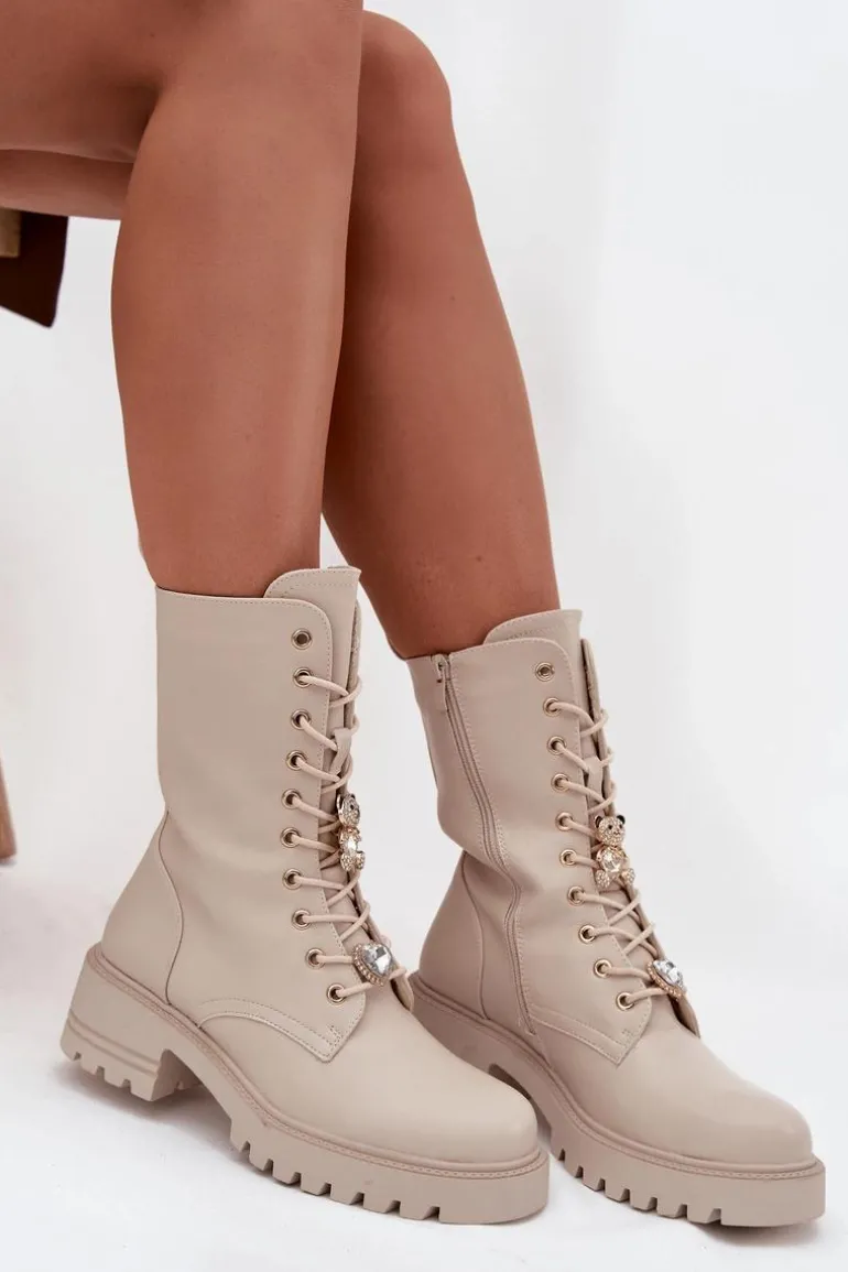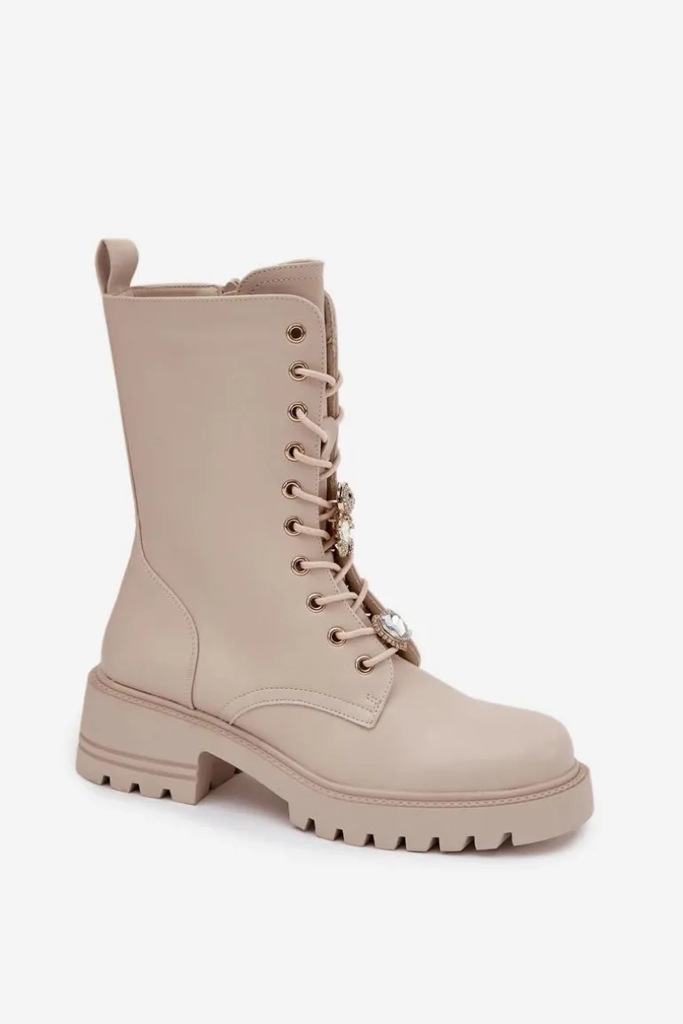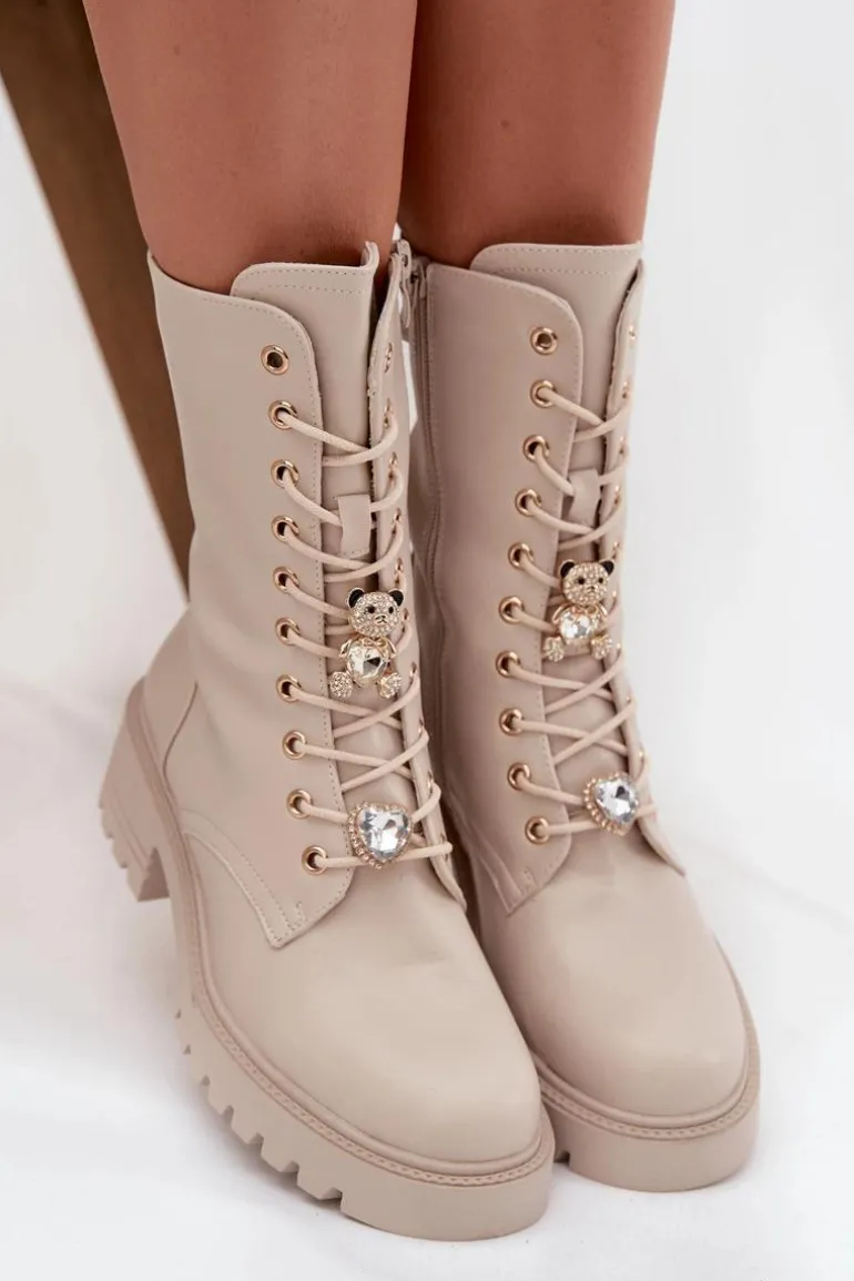 Botki workery damskie wykonane z eko skóry. Model osadzony na stabilnym obcasie typu klocek zapewnia wygodę oraz pewność kroku. Buty są sznurowane i zapinane na zamek, co ułatwia ich zakładanie i pozwala idealnie dopasować je do stopy. Ozdobne przypinki w formie misia i serduszka umieszczone przy sznurowaniu nadają im oryginalnego, modnego charakteru. To doskonała propozycja dla kobiet, które lubią łączyć wygodę z niebanalnym stylem – idealne do codziennych, miejskich stylizacji. Przy wyborze rozmiaru prosimy sugerować się tabelą rozmiarów.